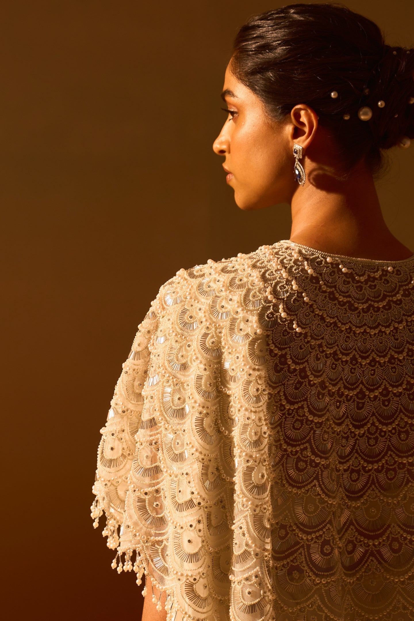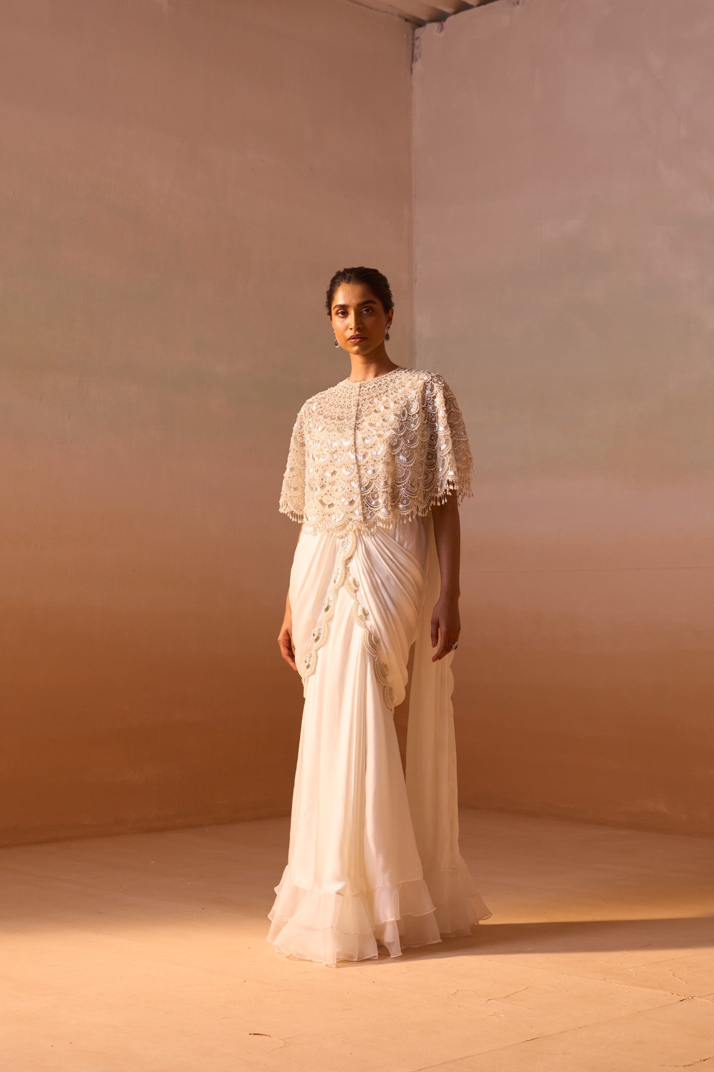 Ivory satin pre-draped saree with a bustier and a worked poncho in net. The poncho is worked with pearls and silver nalki zircons.
