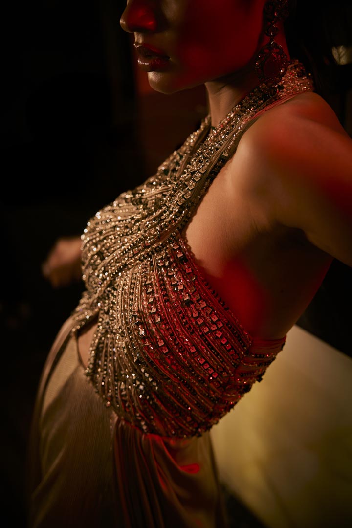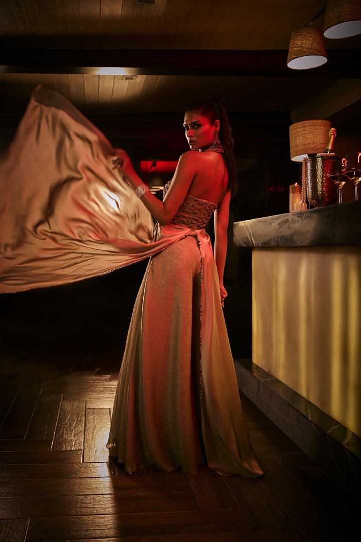 This taupe jumpsuit with a satin overlayer exudes contemporary allure with its sculpted halter neckline. Crafted in crushed fabric and enhanced with a fluid satin overlay and beaded bodice, it strikes the perfect balance between structure and movement.