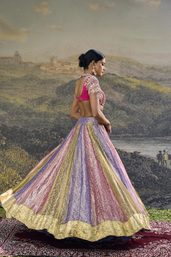 This set includes a pink jadau blouse, a tissue panel lehenga with a lampi gota border at the hem, and a heavily embroidered organza dupatta.