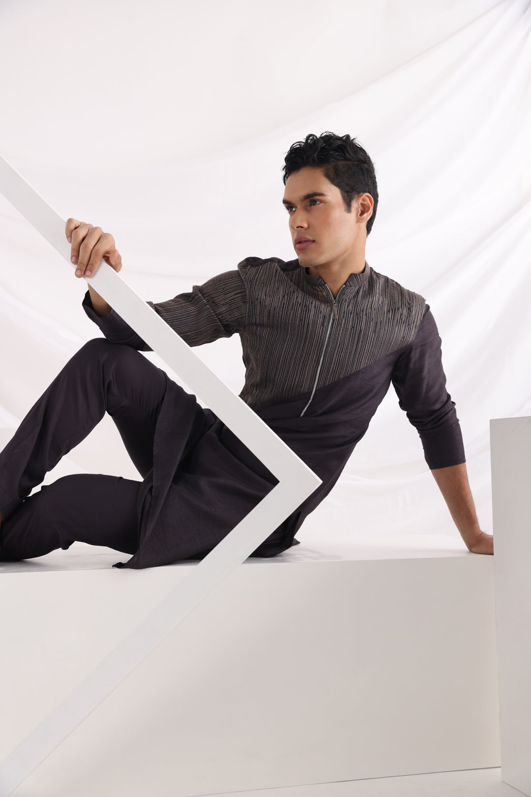 Take a glimpse of this visually intriguing kurta, it's asymmetric threadwork and zipper closing is a delightful distinction from the rest.