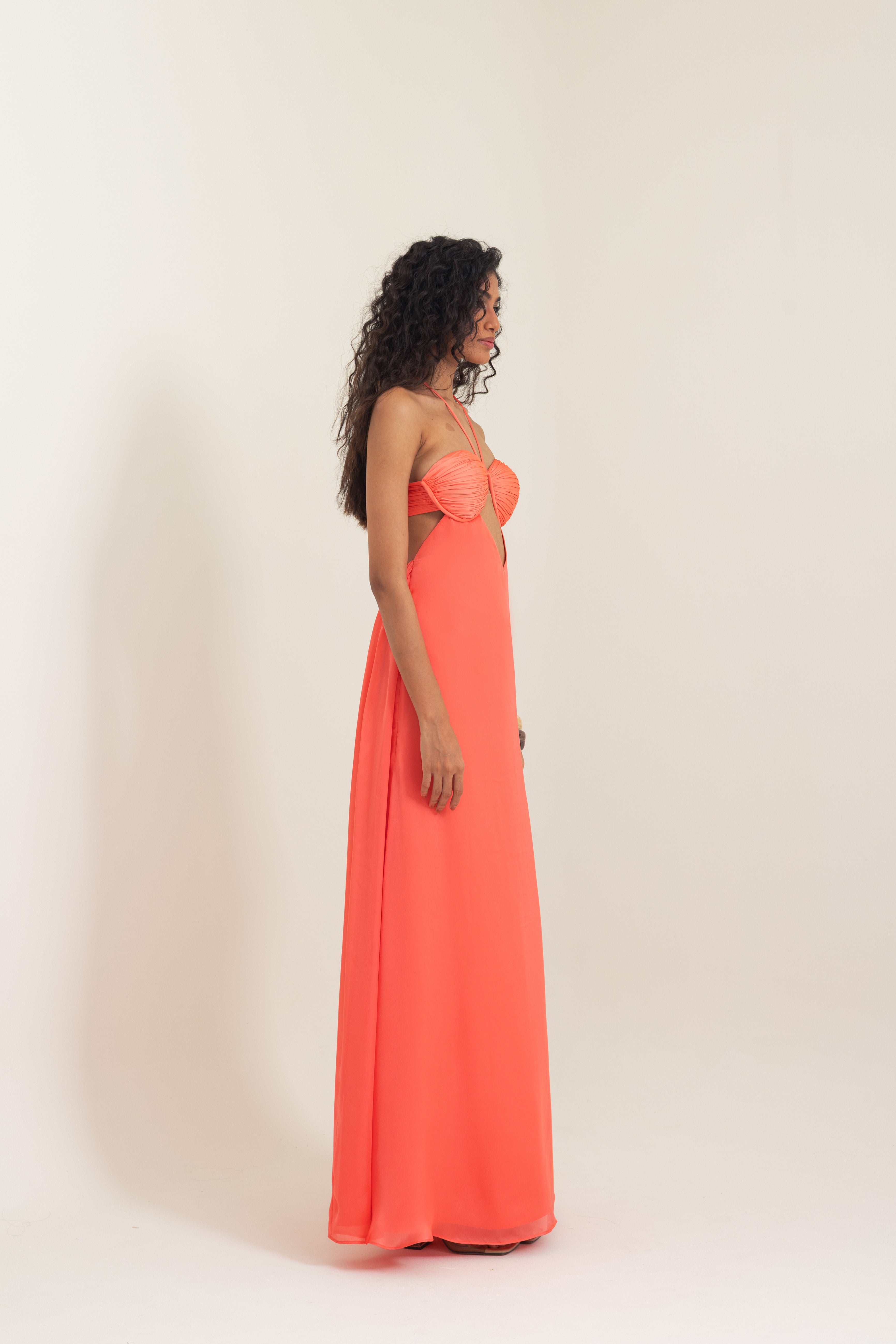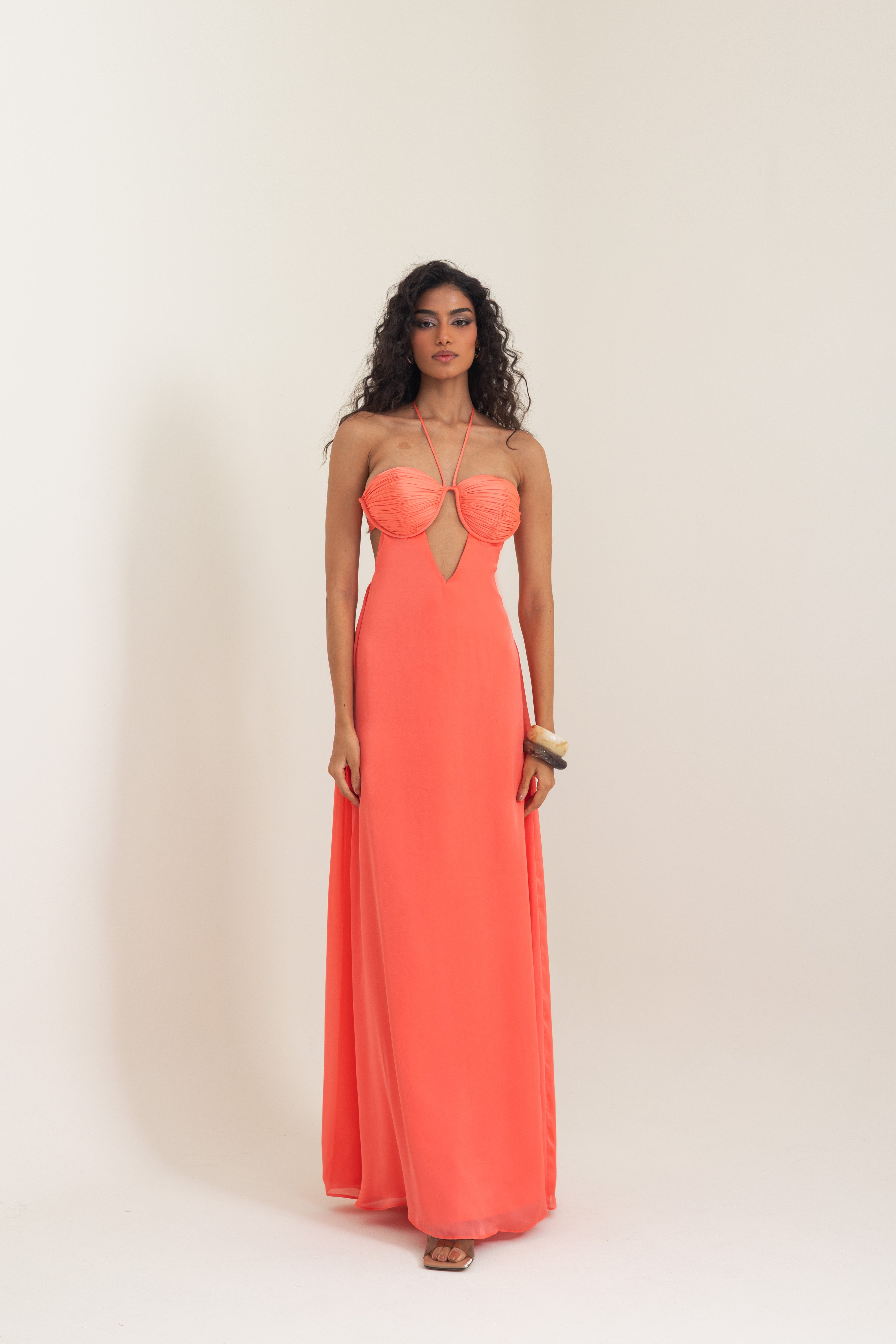 Falling into a sleek column silhouette, the gown skims the body with graceful fluidity, exuding both sensuality and sophistication. The luminous coral hue, reminiscent of a summer dusk, makes it an ideal choice for resort soirées, beachside celebrations, or statement evening wear.