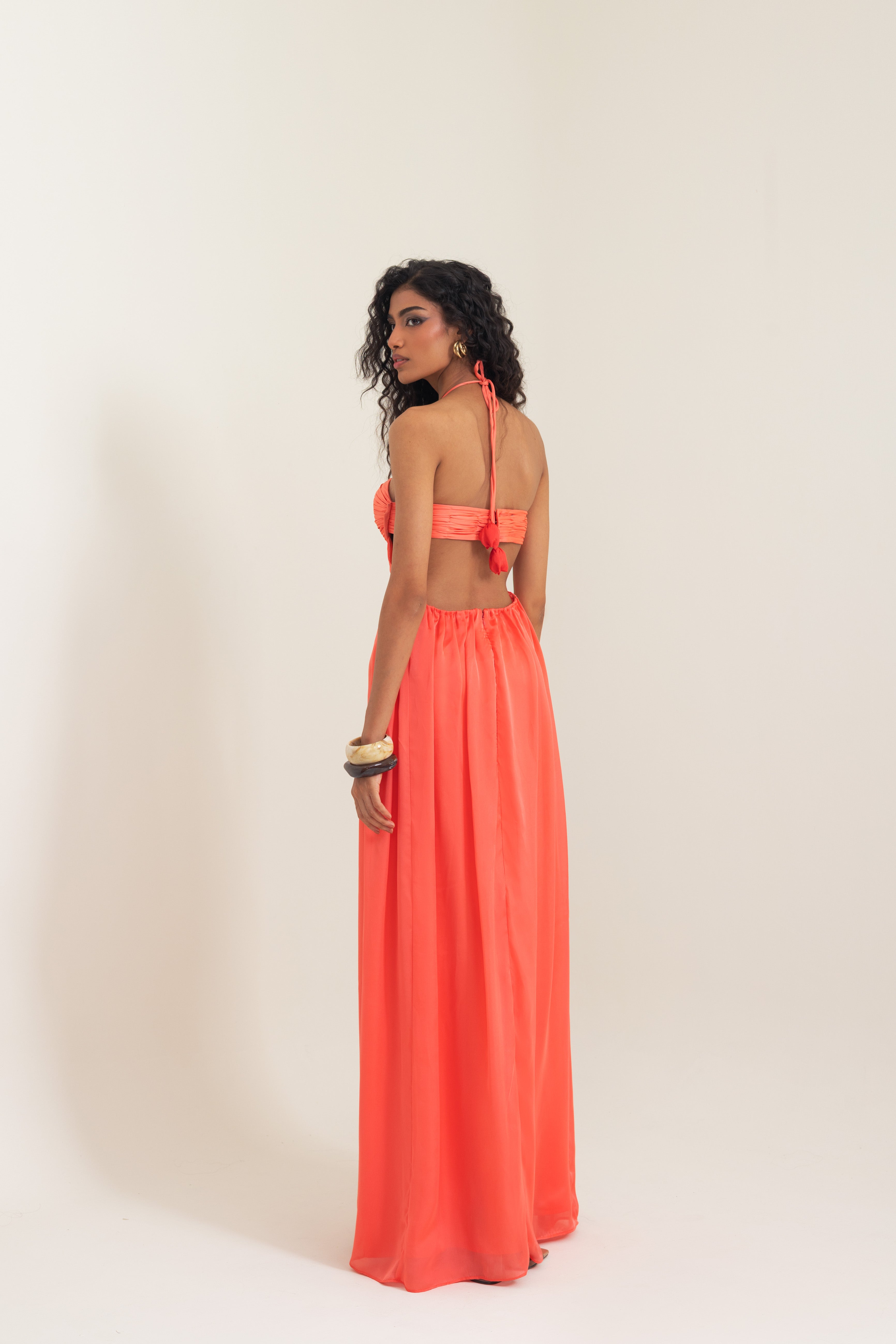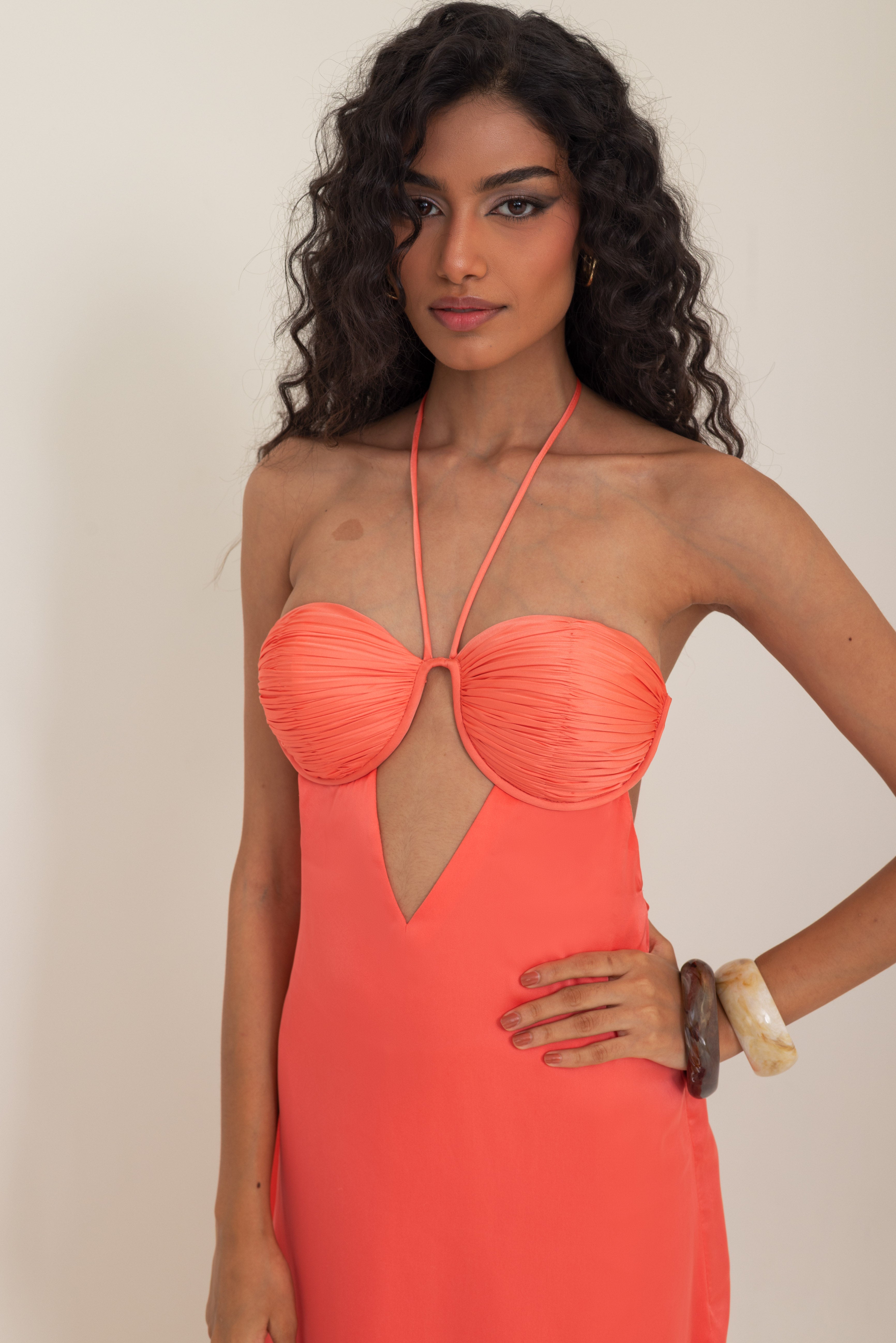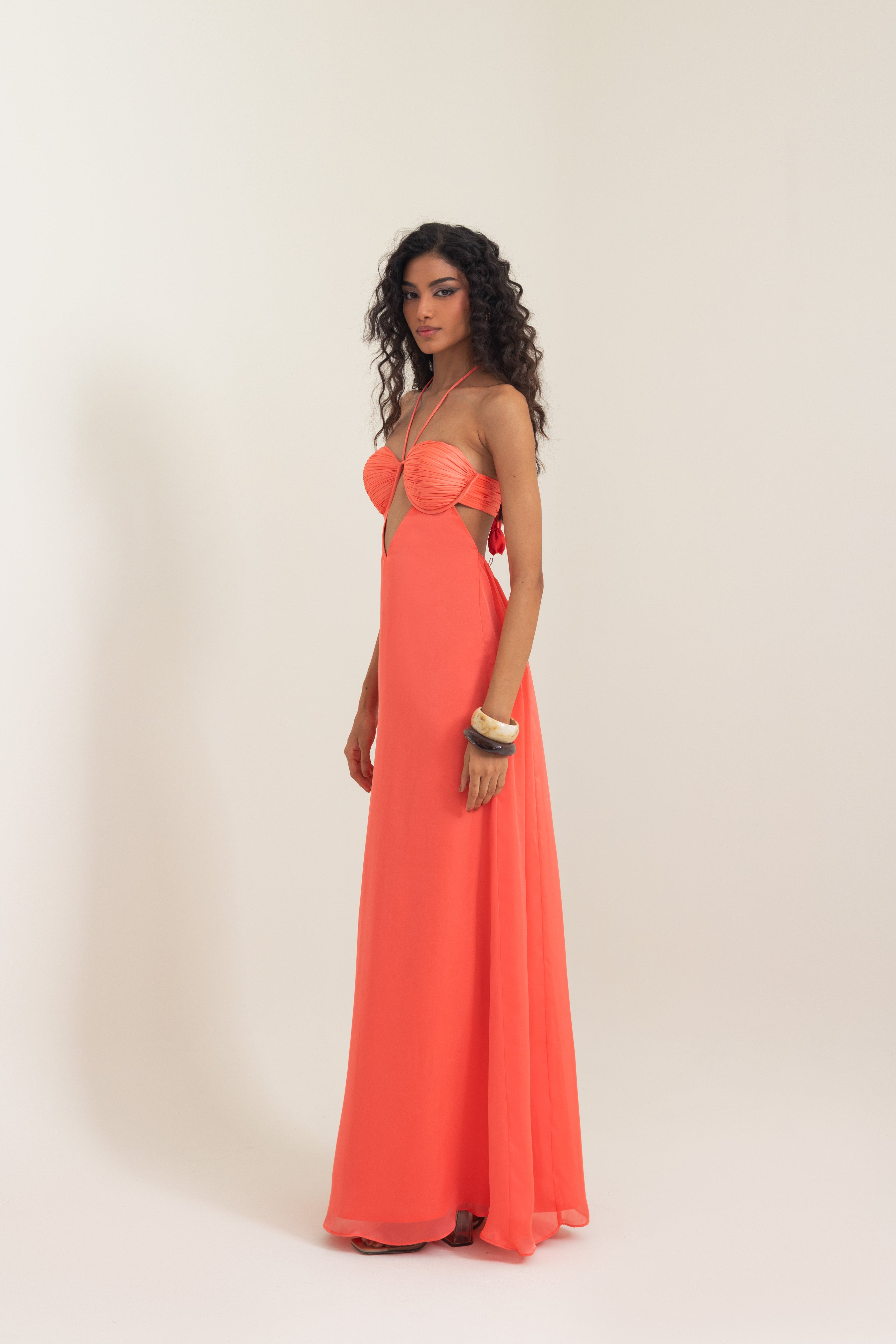 Radiating effortless allure, this gown in sunset coral is crafted from fluid satin georgette, hand-draped to perfection. The design features a daring halter neckline with a plunge cut-out, balanced by softly ruched cups that highlight the bust with sculpted detail.