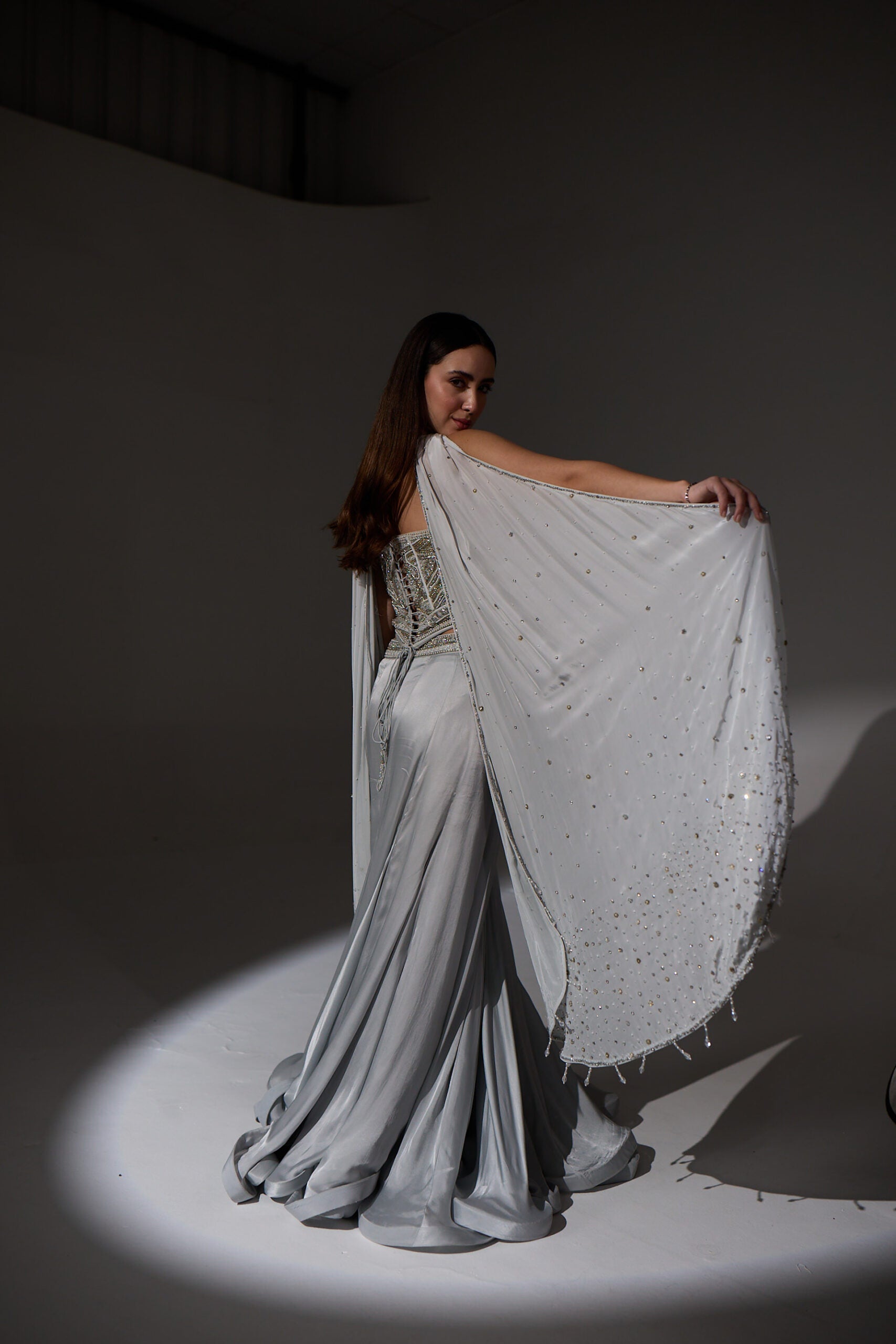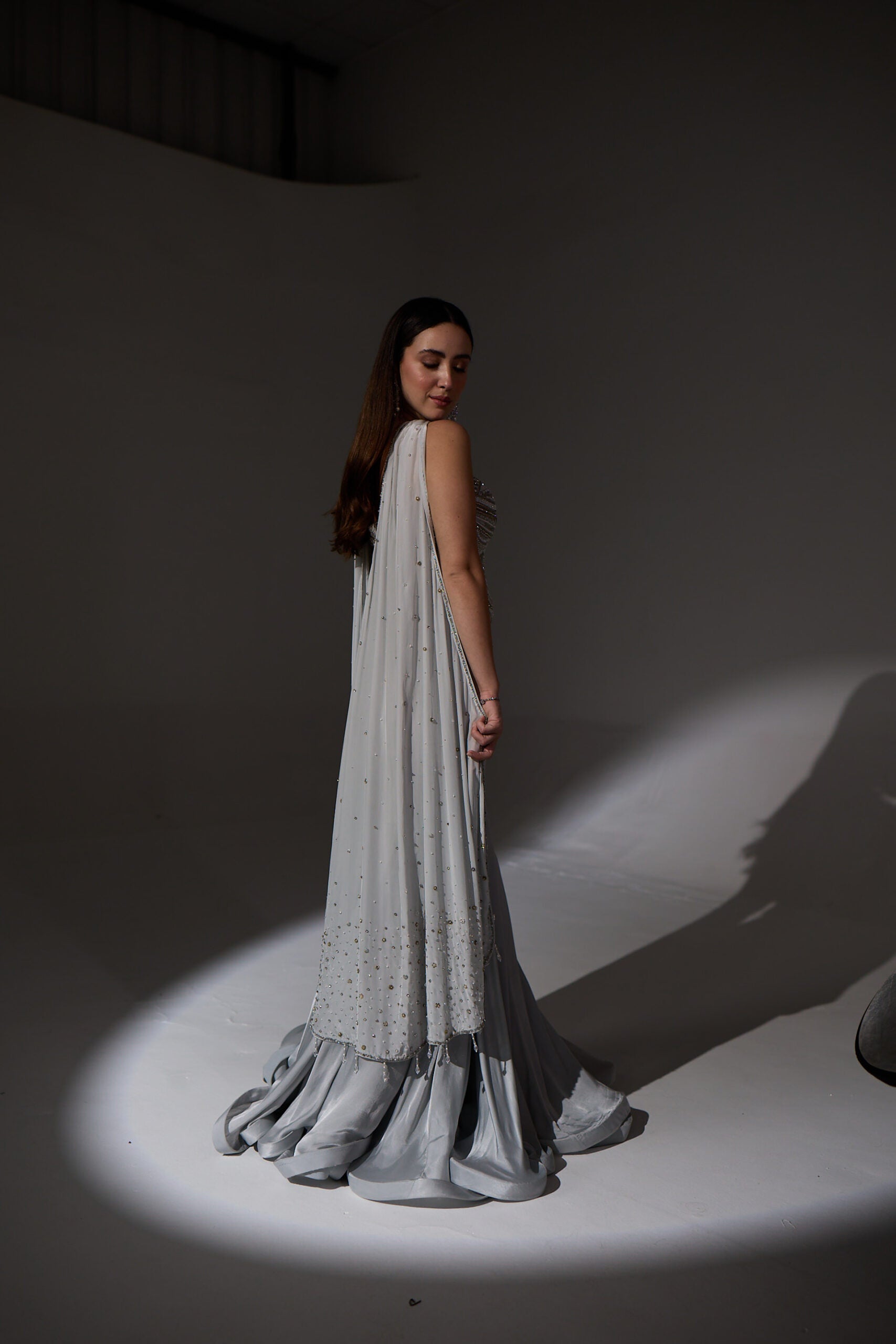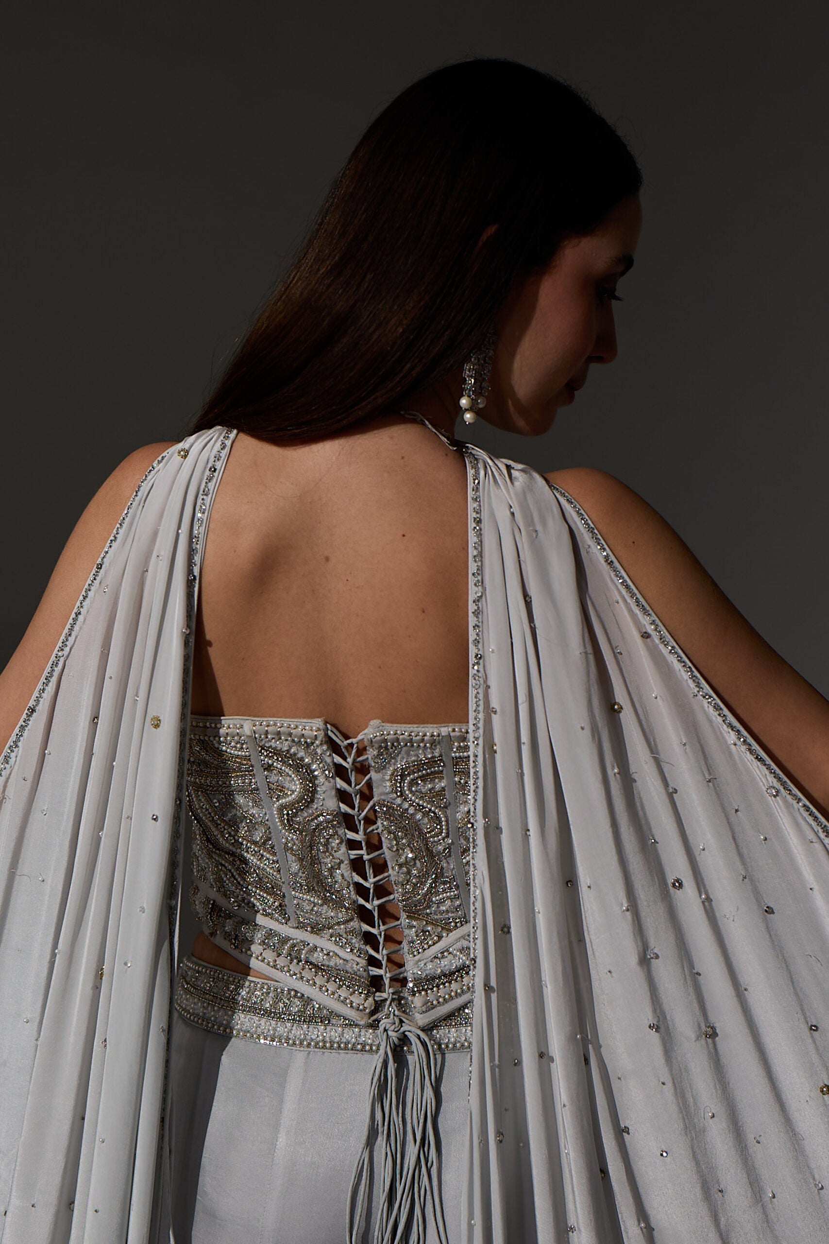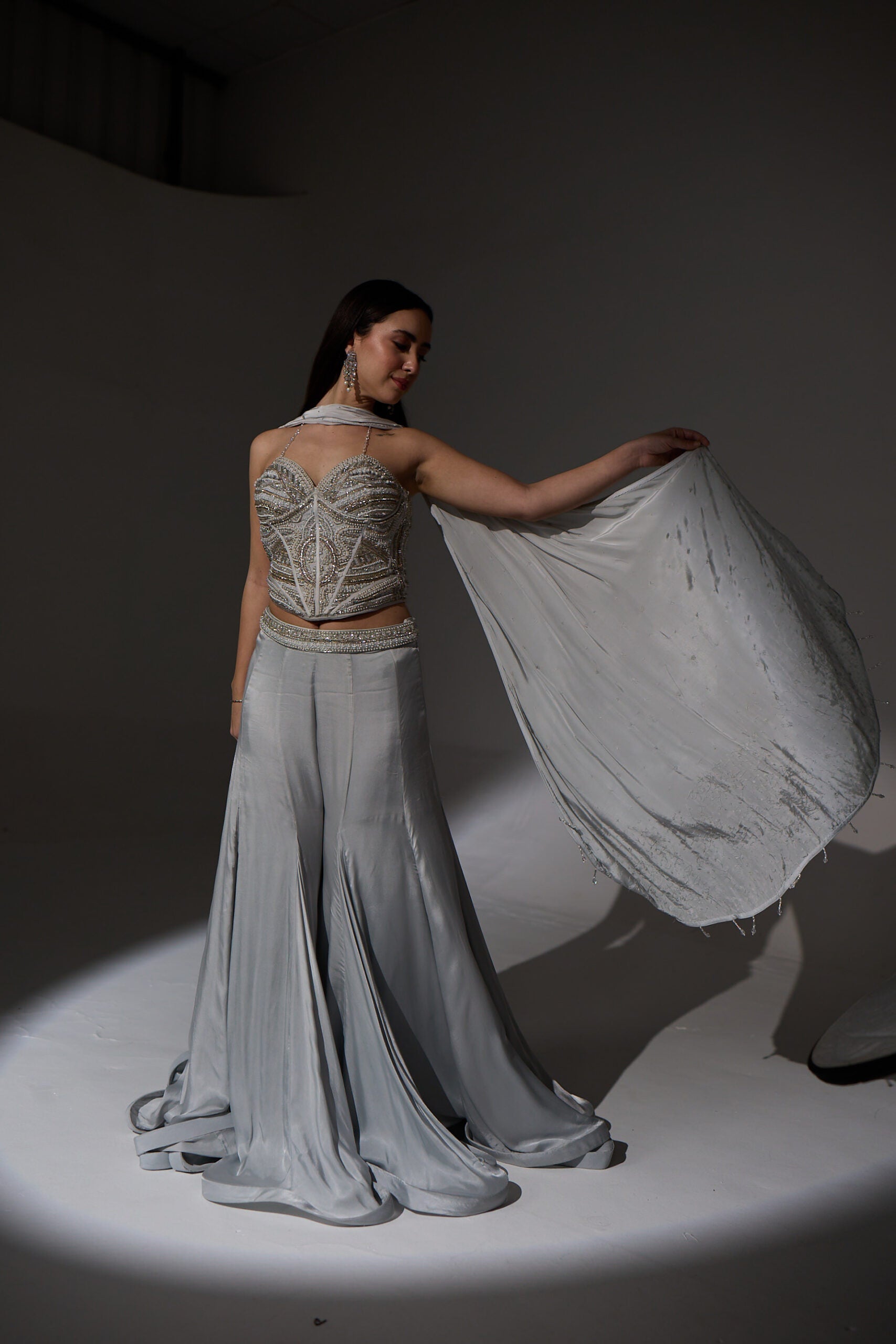 A Victorian-inspired sharara set designed for the modern muse. The look features a structured corset embellished with hand-appliqué and fine aari embroidery, evoking a sense of timeless romance. Paired with a dramatic sharara, detailed with wired hems for sculpted fullness and graceful movement.