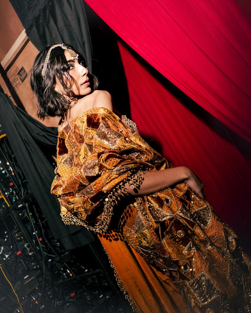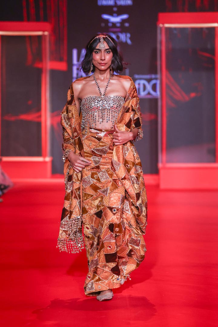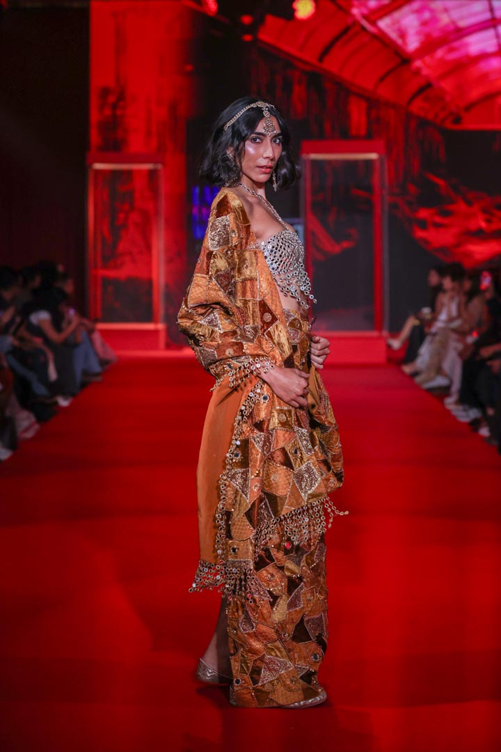 Pre-draped saree featuring rich orange and gold patchwork fabric with metallic sheen. Enhanced with intricate embroidery and sequin detailing throughout. Paired with a crystal-embellished strapless corset blouse with geometric mirror work. Complete with matching draped dupatta and statement jewelry including maang tikka and layered necklace. Ready-to-wear designer saree for weddings and festive occasions.