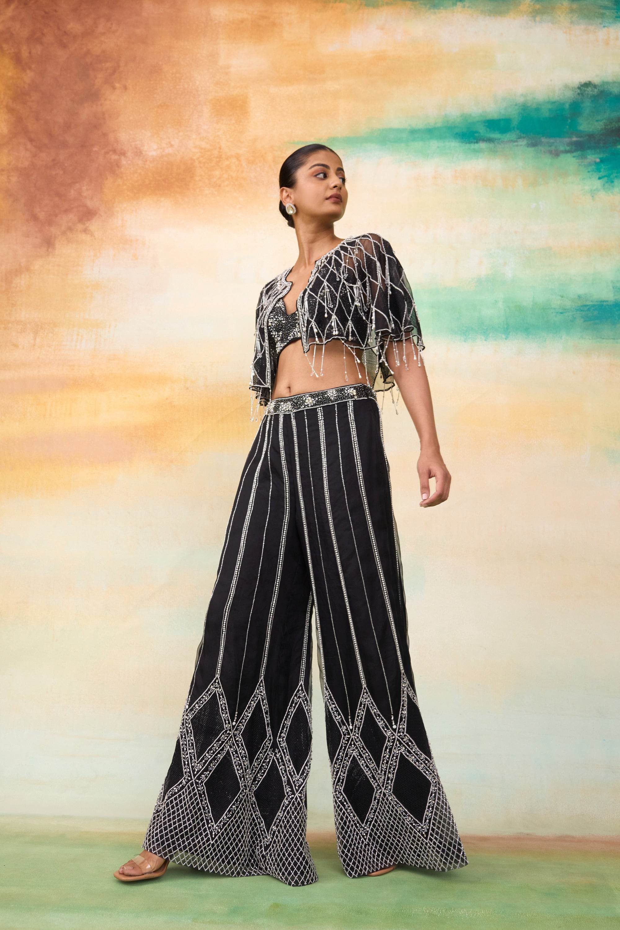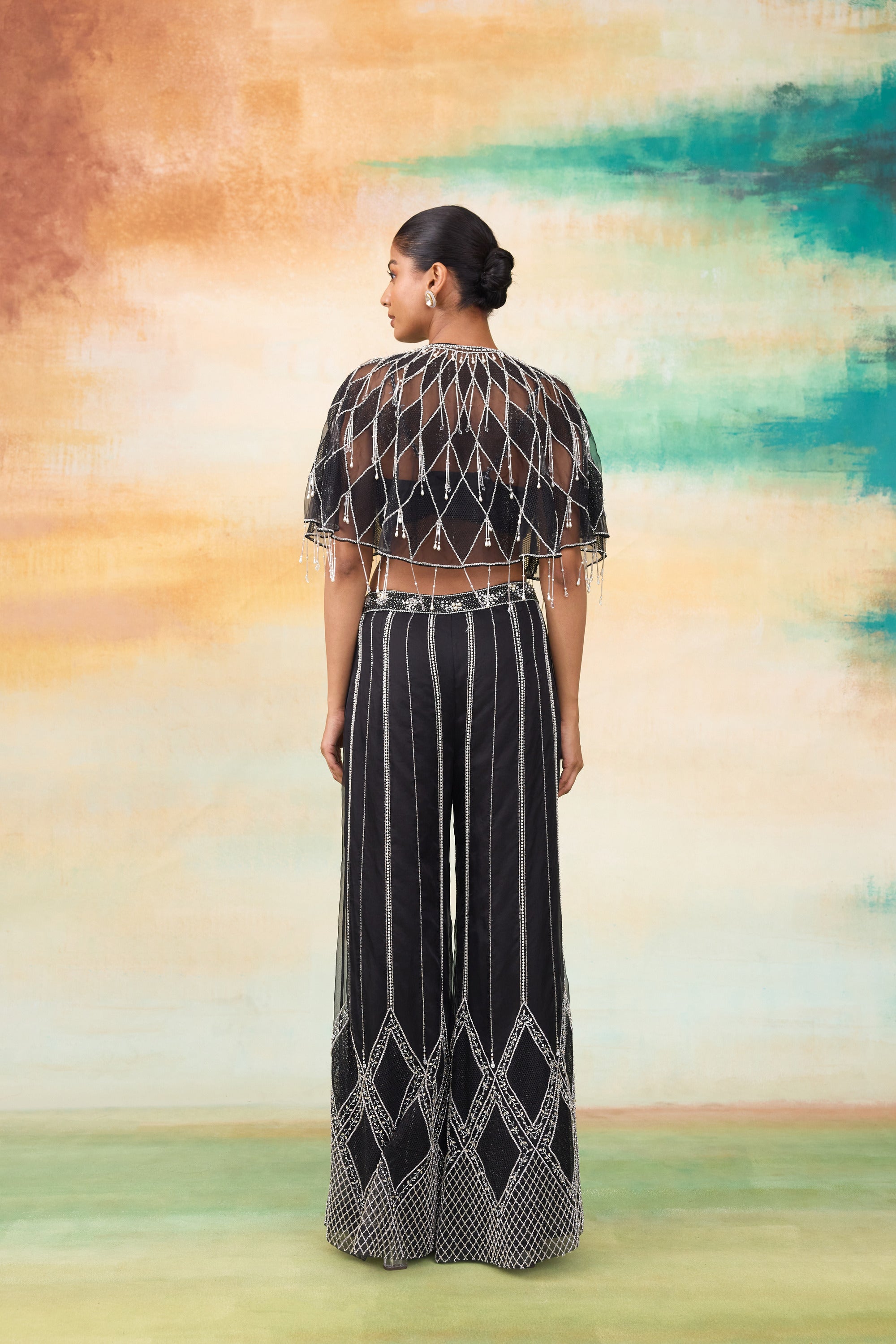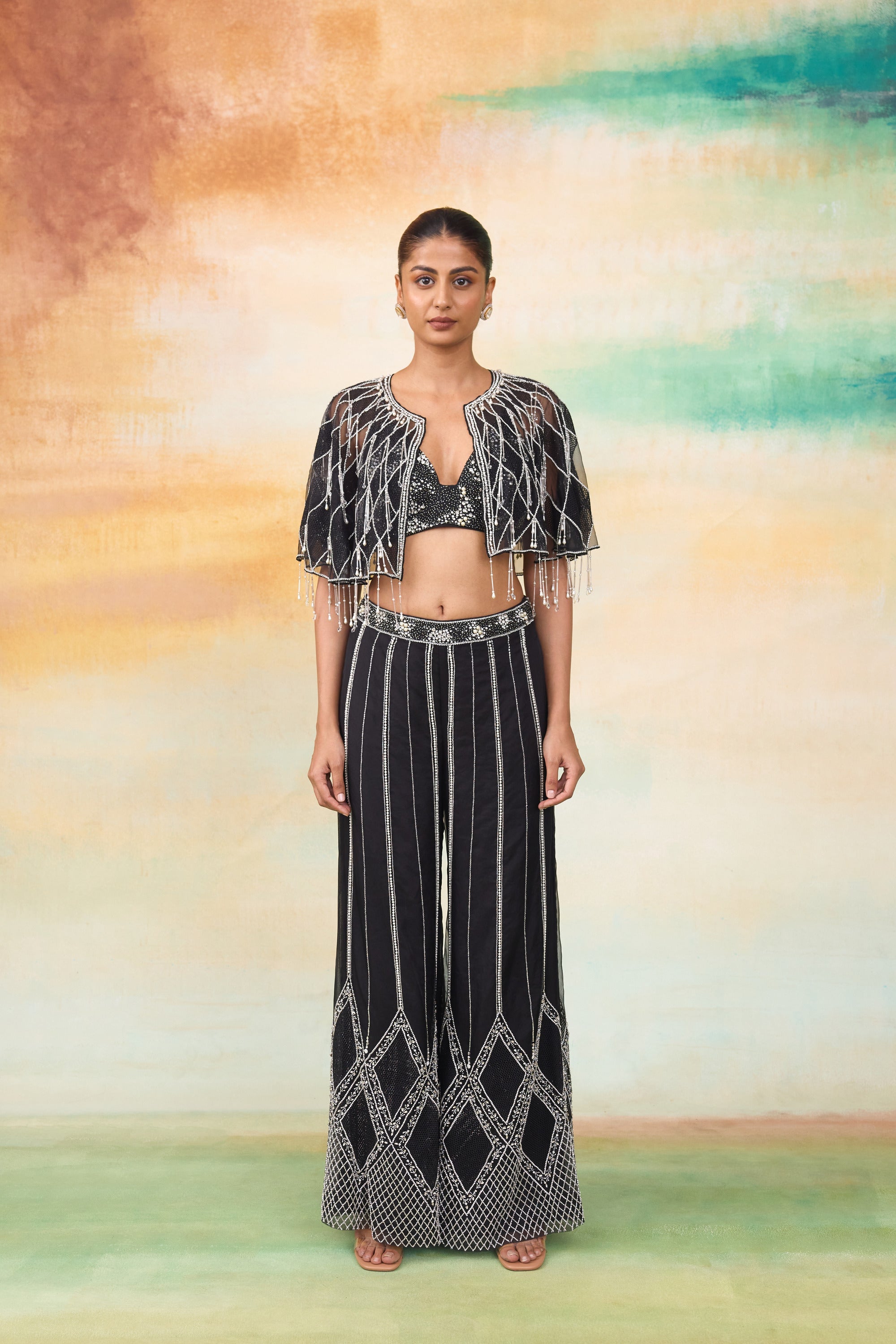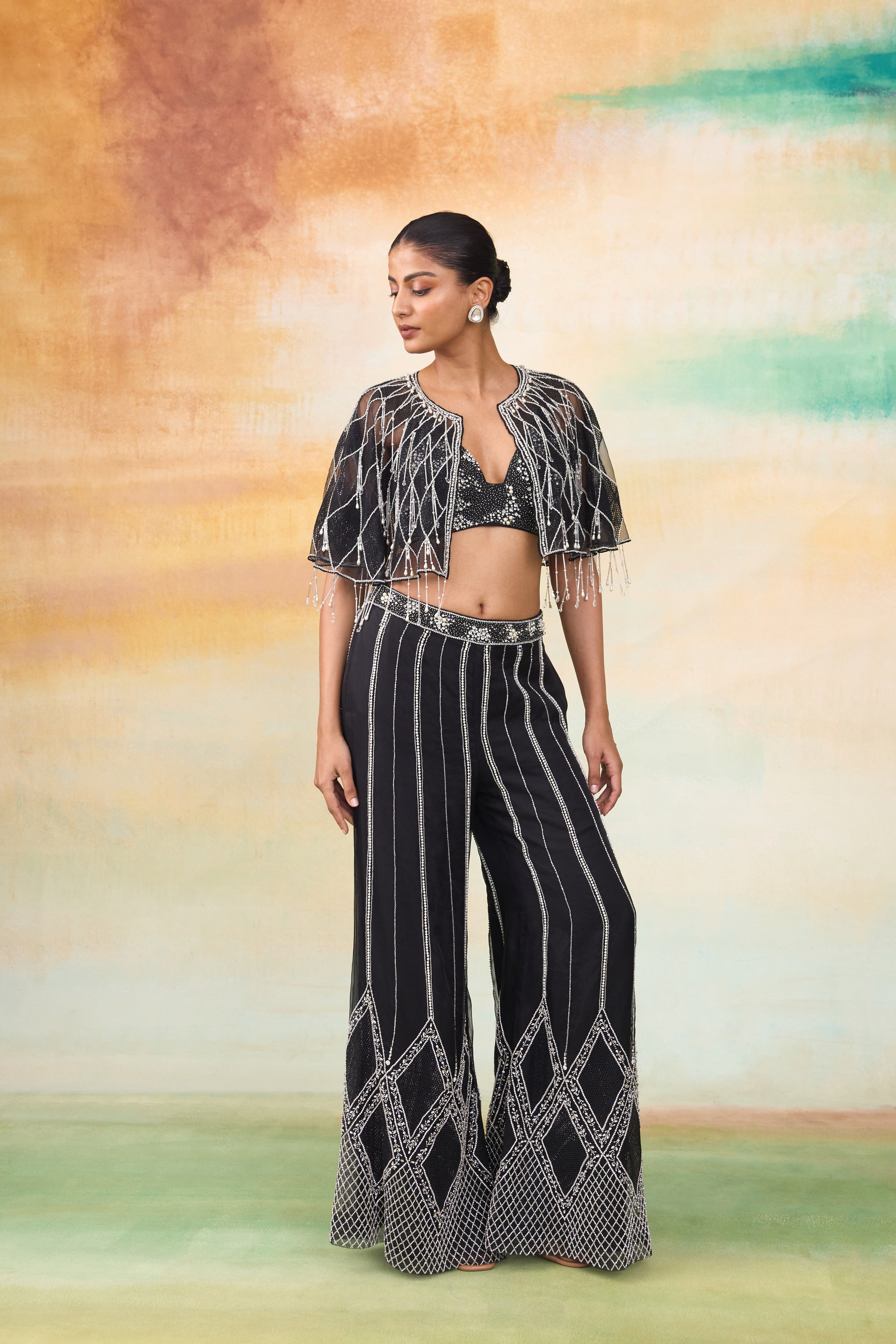 Our Ariel cape and pant set is a perfect modern ensemble in organza with shimmering details of hand embroidered pearls, crystals and cutdana that weaves a story of opulence & grace. The pants showcase an intricate crisscross embroidery pattern crafted with cutdana. The cape features diamond shaped jaali net patchwork, complemented by pipe tassels that add a dynamic touch. The top has chitta work of pearls and stones, enhancing its luxurious appeal.