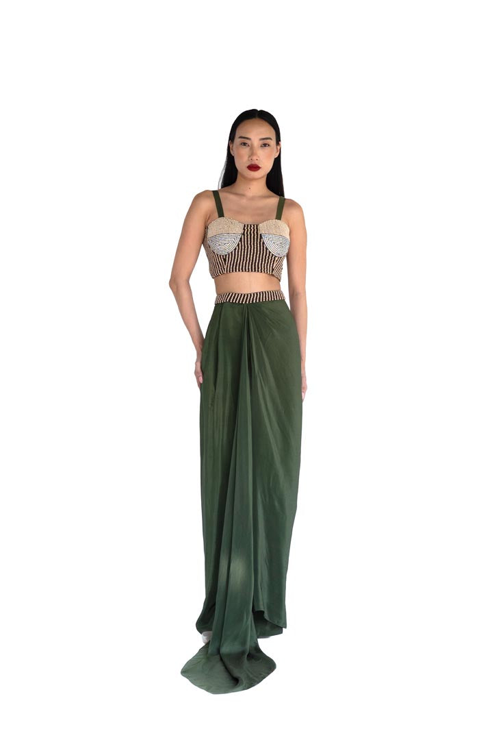 Amal is purely made out of handpicked natural silk using detailed beadwork all over the blouse and variety of hand embroidery techniques all in one paired up with solid color draped skirt , It is a head turner for sure !