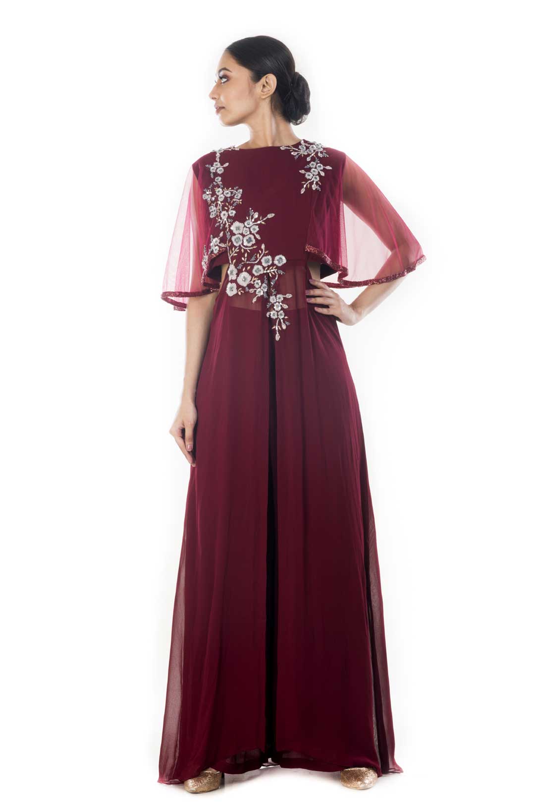 Vibrant floral embroidery on this off shoulder draped dress has a mix of sequin containing cutdana, tiki and chir. Crafted in chinnon, this luxuriously styled dress is perfect for special occasions.
