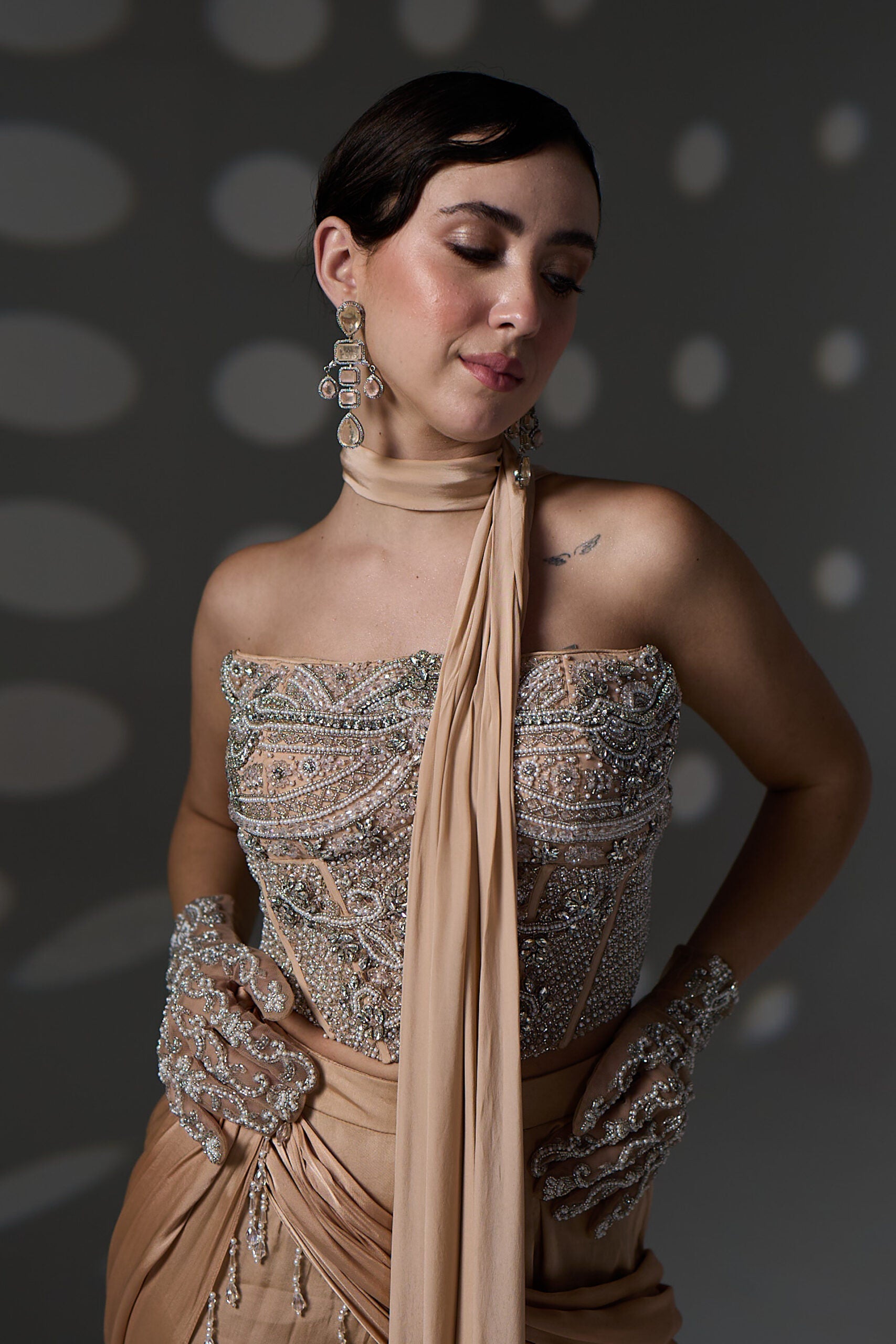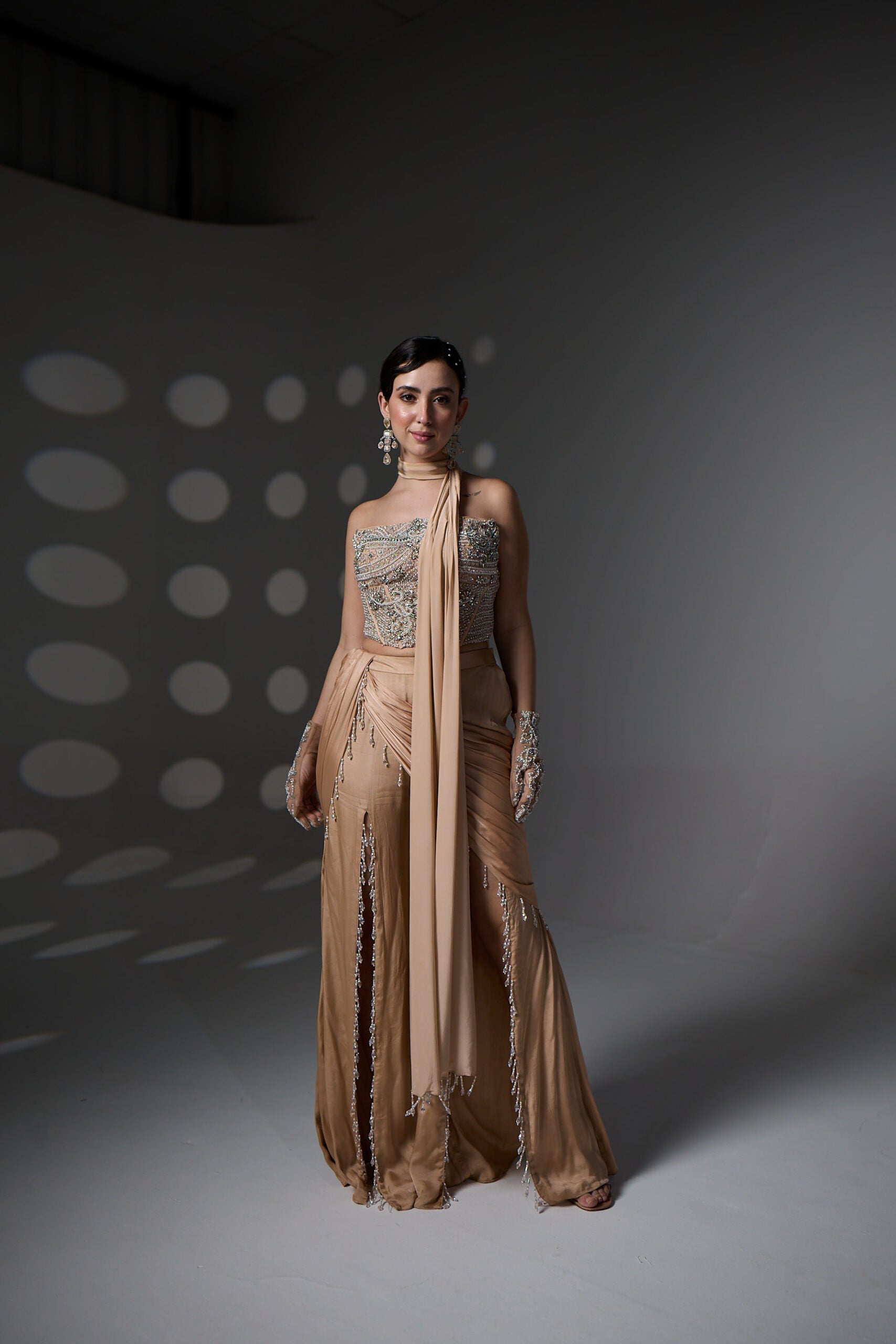 A contemporary ensemble crafted for the modern muse this look features front-slit pants finished with playful tassel edging, offering movement and edge. Paired with a long, sculpted corset adorned with delicate aari hand embroidery, the outfit blends bold tailoring with artisanal finesse.