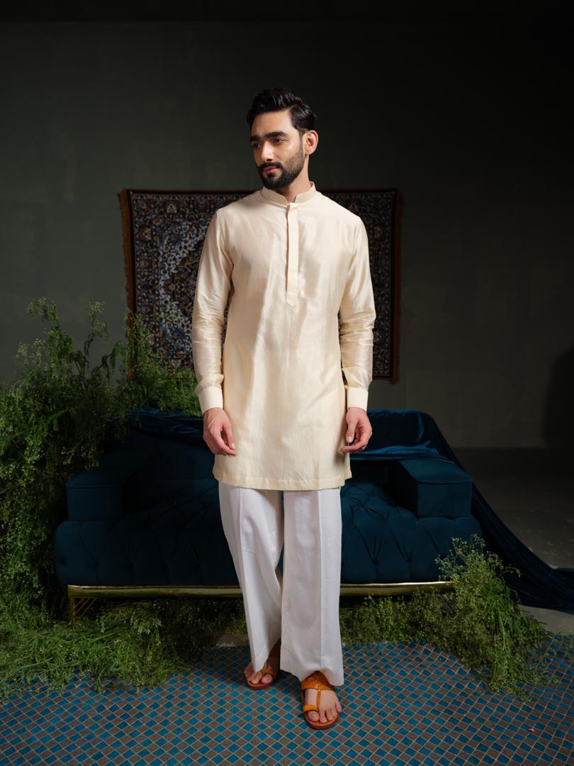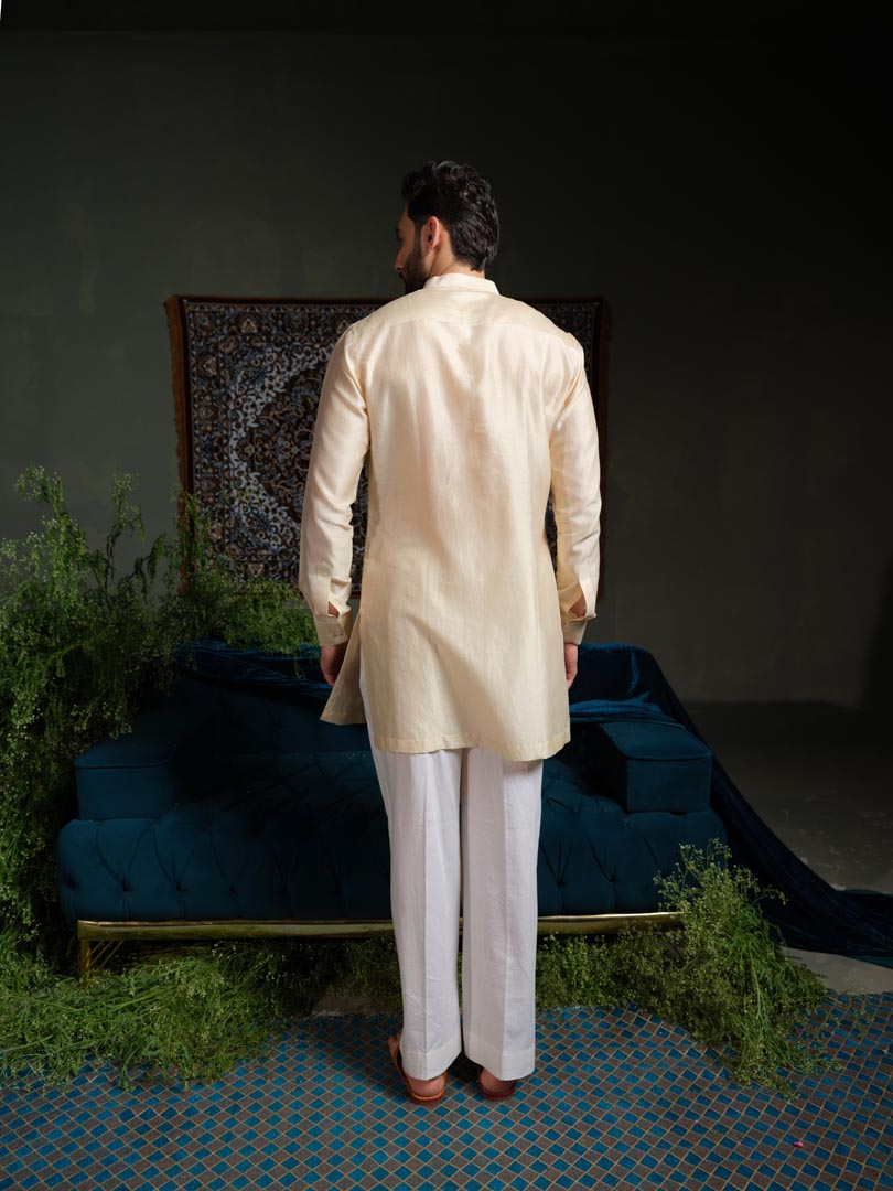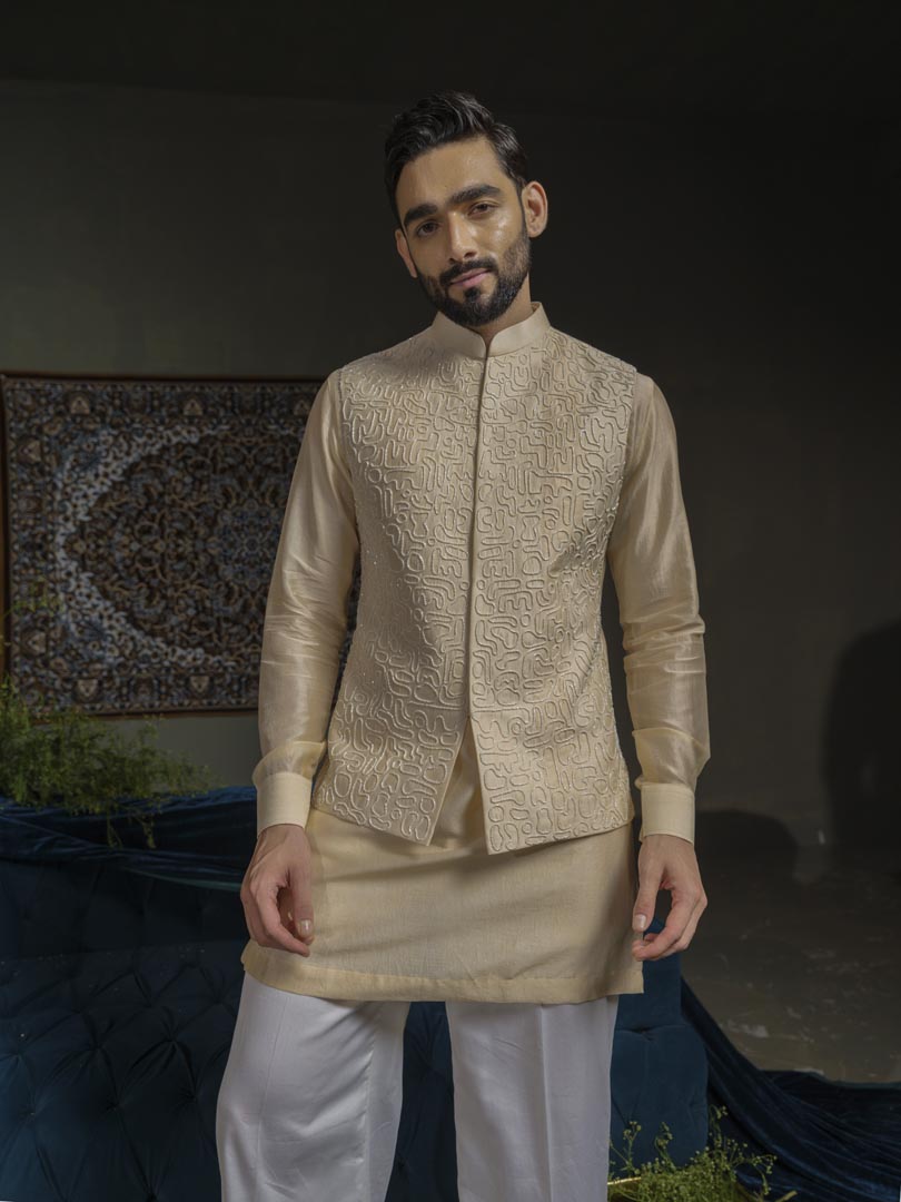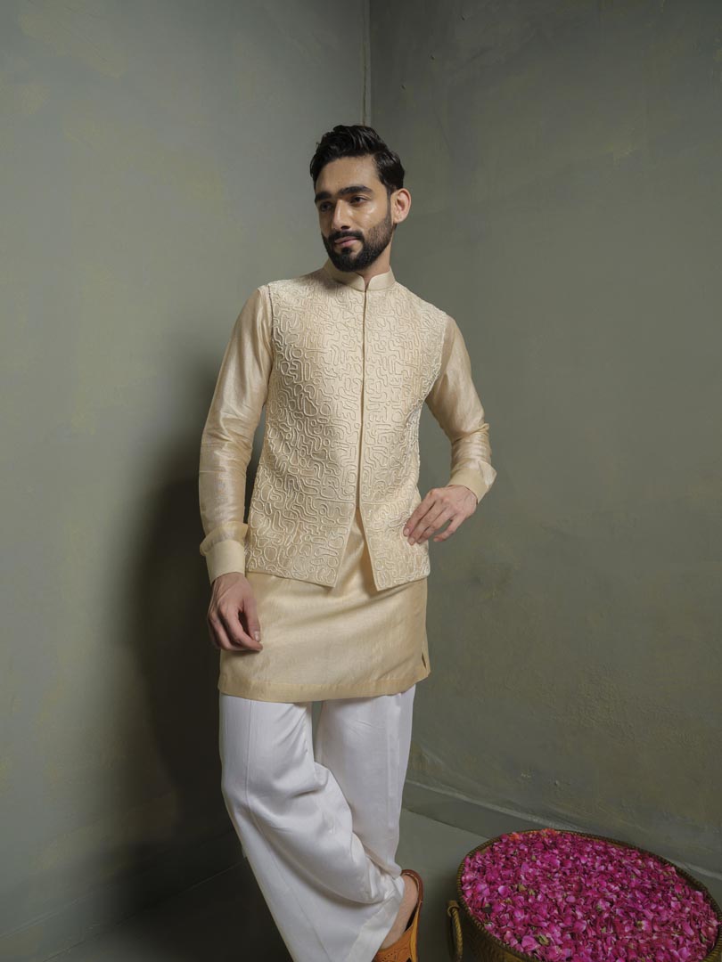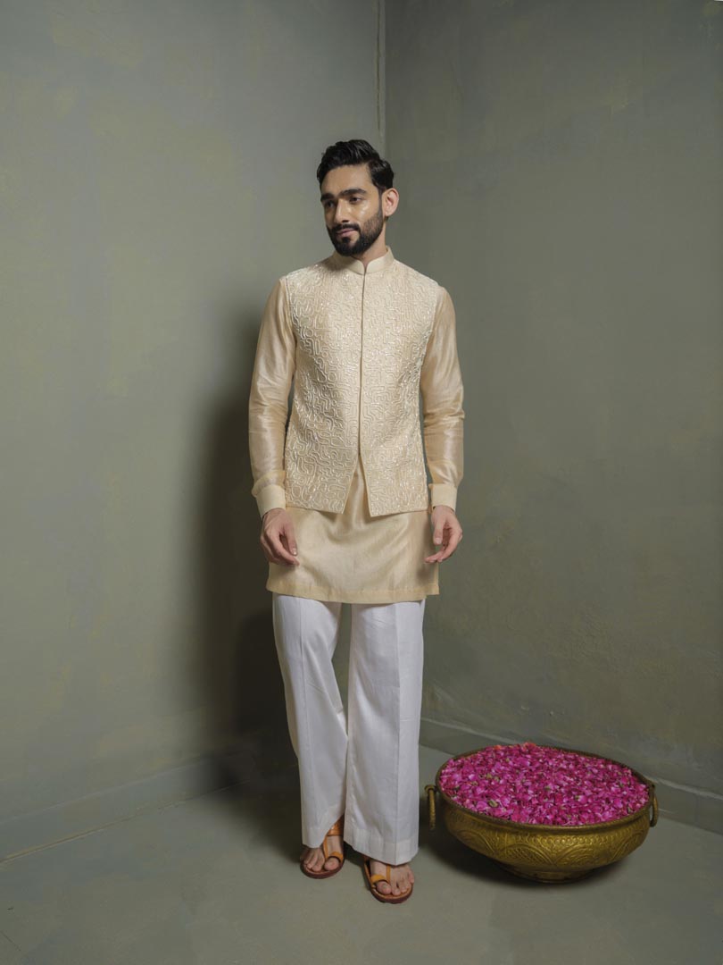 A creme Bundi embellished with amoeba cutdana embroidery all over the front makes a matured elite space in men indianwear wardrobe. Paired up with monochrome kurta and ivory flare pants.