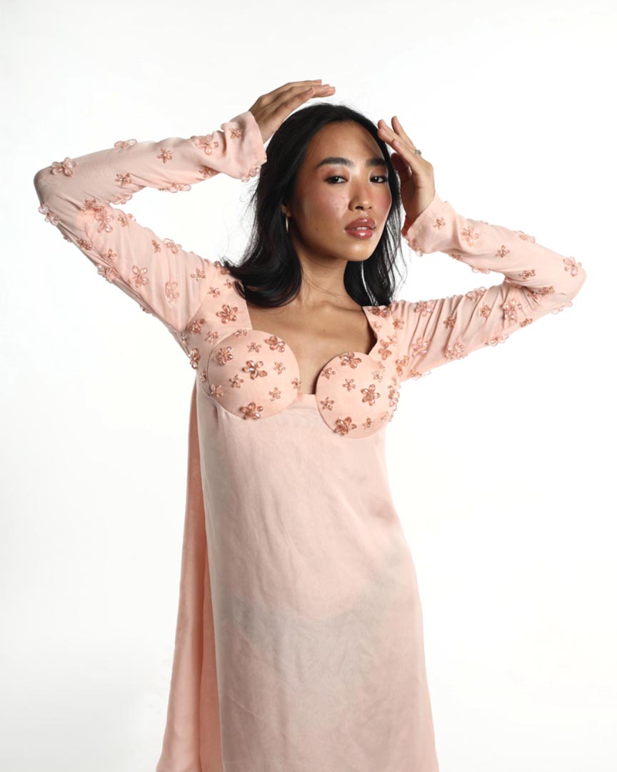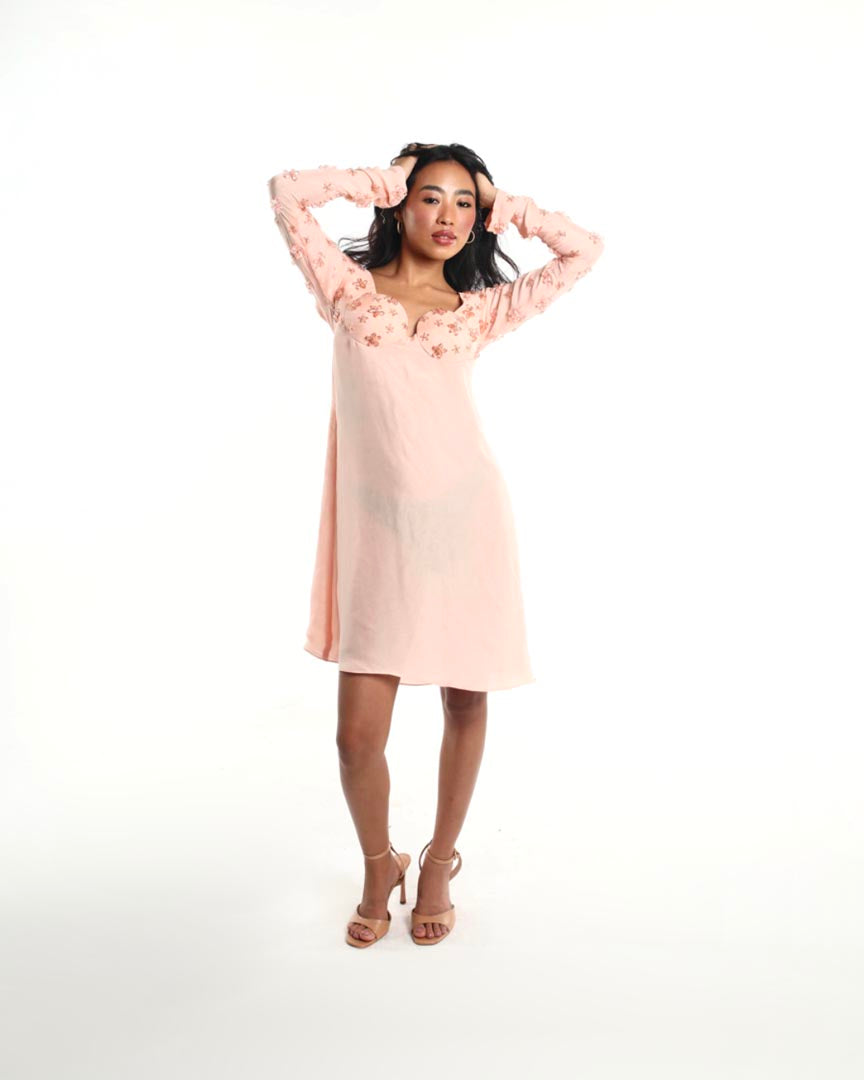 The AMOUR dress is crafted in a delicate blush hue with a relaxed A-line shape. The fitted bodice features a scalloped sweetheart neckline and full-length sleeves embroidered with tonal florals for a whimsical, textured touch. Light and breathable, perfect for brunches, baby showers, or garden getaways, wherever romance meets sunshine.
