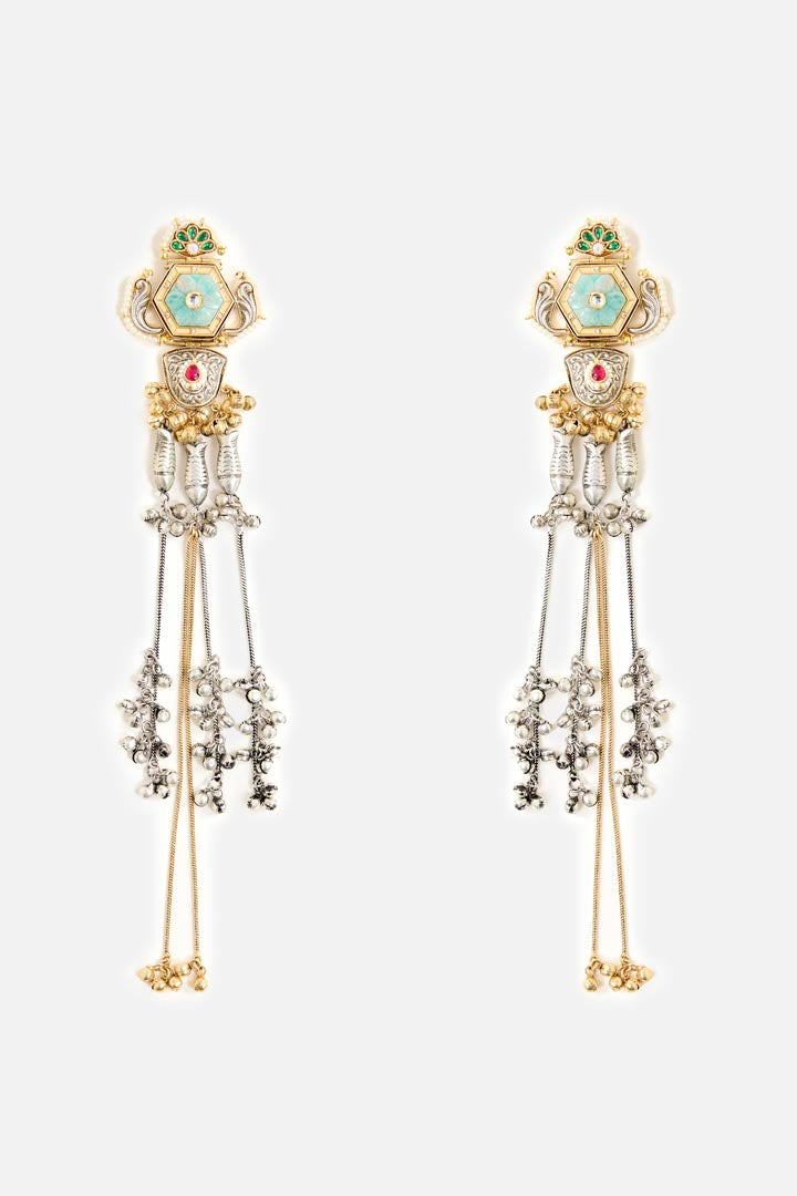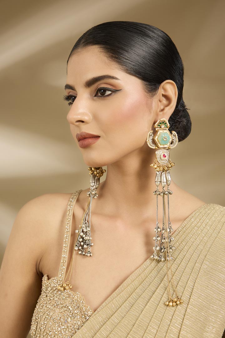Make a bold statement with these antique long dangler earrings featuring an enamel motif, stone accents, and tassel chains. Perfect for weddings, festive looks, and glamorous occasions.