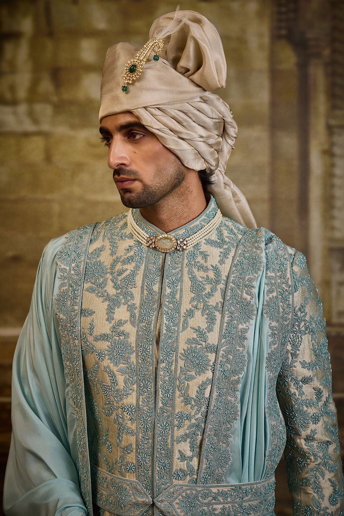 Tissue Brocade Sherwani Embroidered In Sea Blue Dori Highlighted With Tonal Dabka, Beadwork And Crystals. It Comes A Cotton Silk Kurta And Lycra Trousers. It Is Accesorised With A Worked Stole , Belt And Leather Jutis Which Are Optional And Can Be Ordered Separately