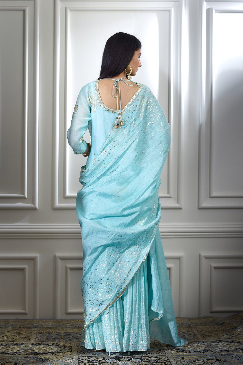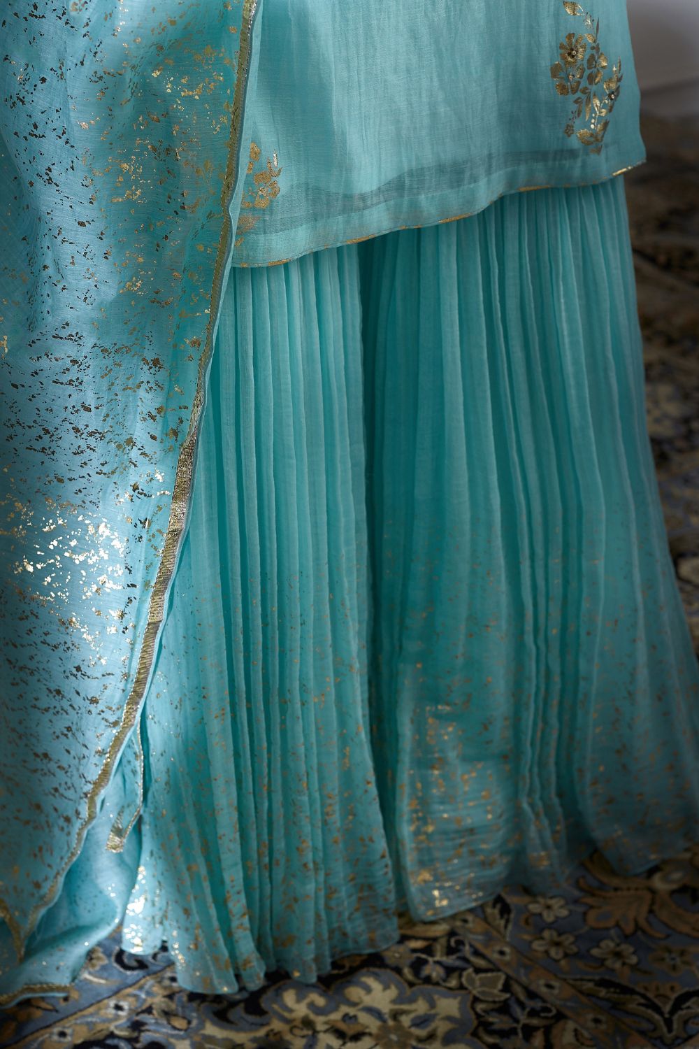 Aqua foil printed hand embroidered kurta paired with sharara and dupatta