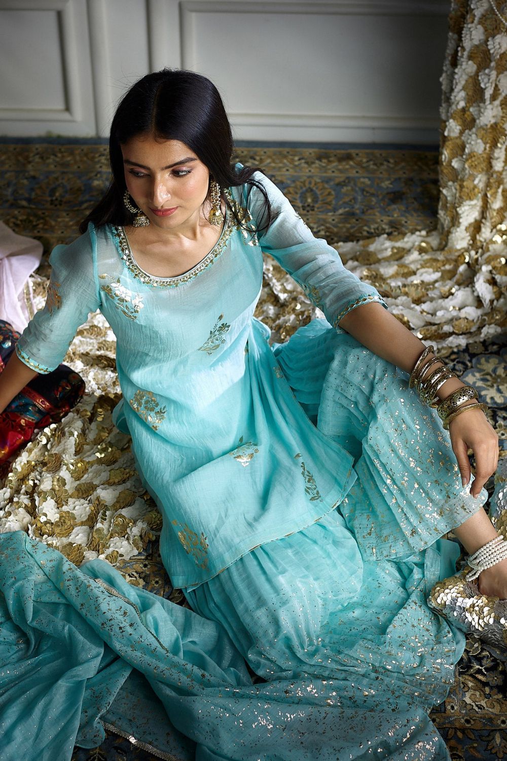 STYLING: Embrace effortless elegance with our Aqua foil printed hand-embroidered kurta paired with sharara and dupatta, suitable for both daytime gatherings and formal occasions