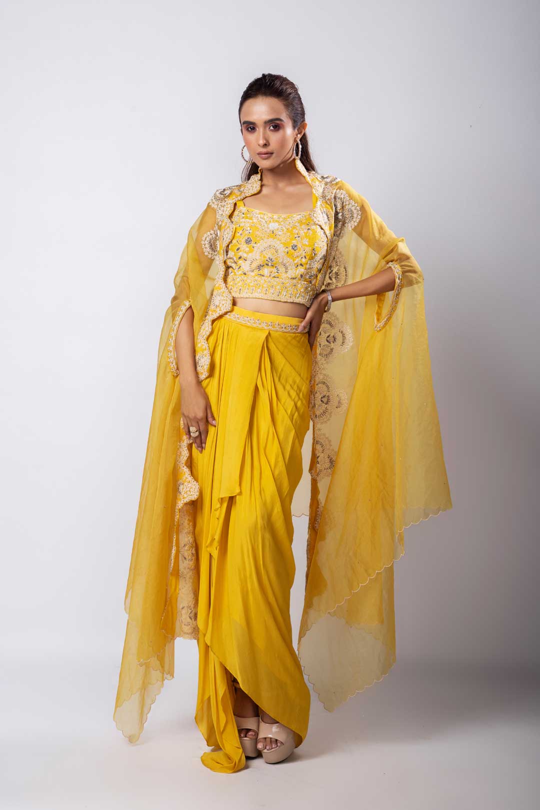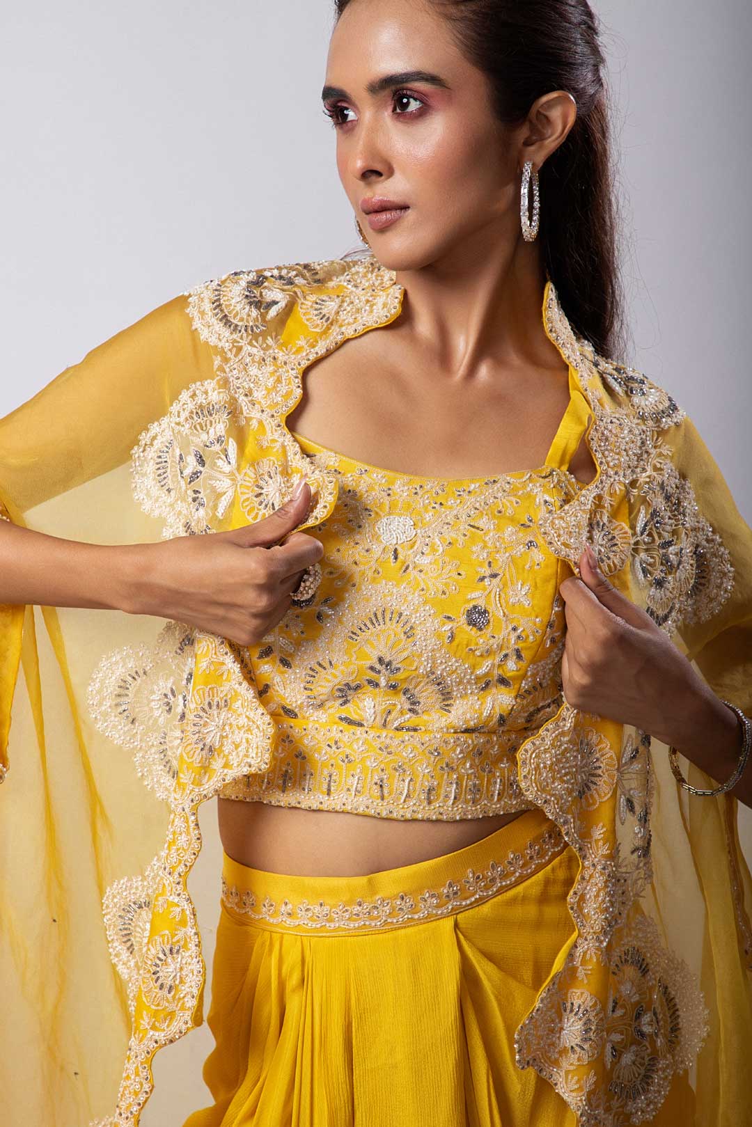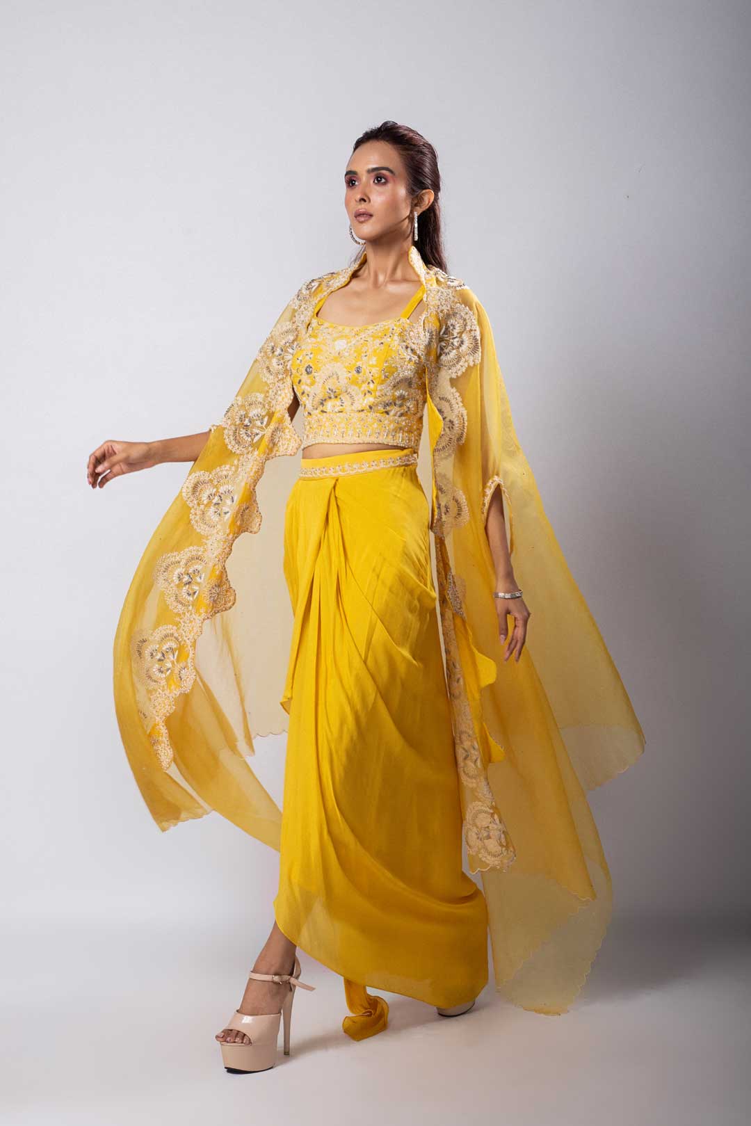 You know something’s up when the cape catches all the attention. Move with soft layers that provide a sense of freedom. This set consists of a drape skirt, embroidered blouse and a cutwork cape.