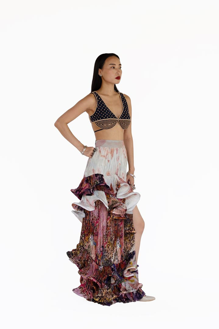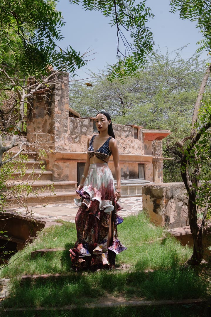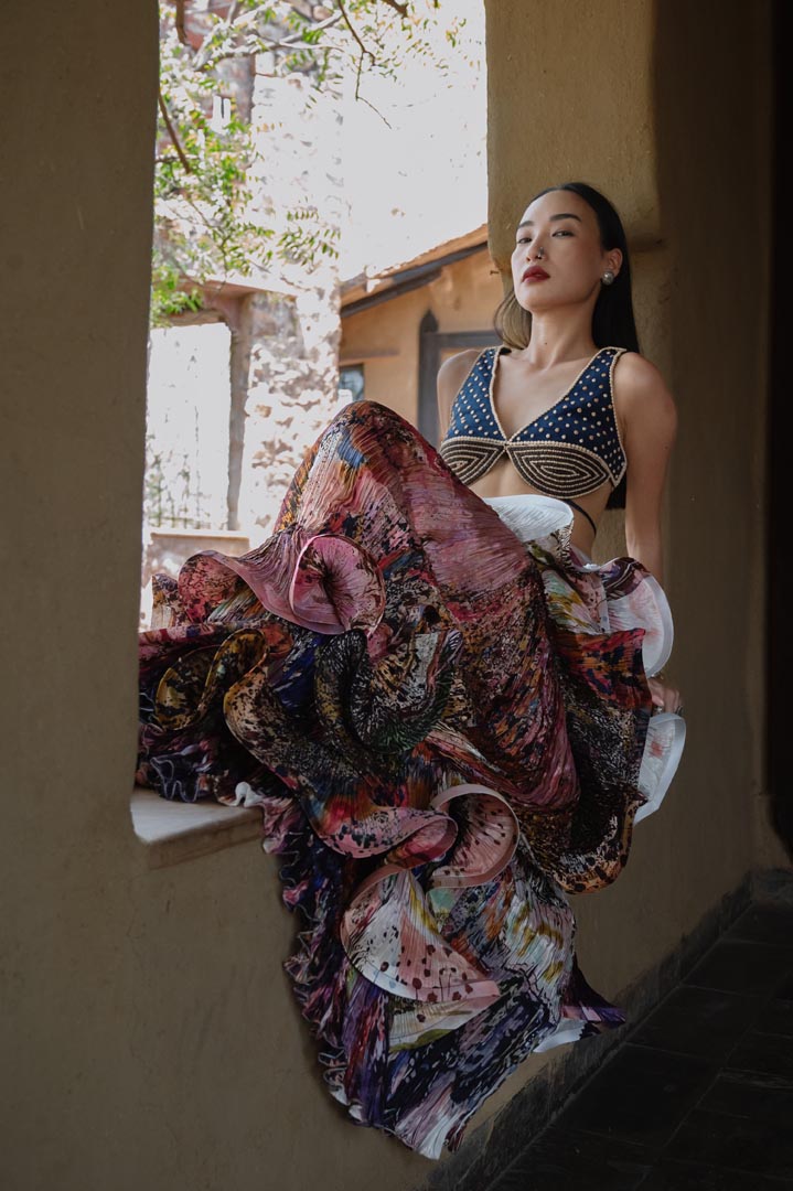 Artichoke skirt is sensational, handsculpted & phenomenal long printed skirt hitched with midnight blue blouse that has beaded & wooden carved embroidery work.
