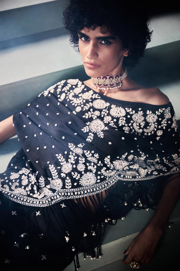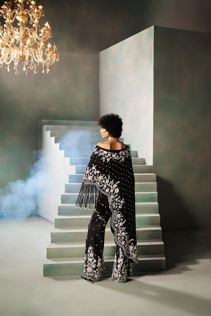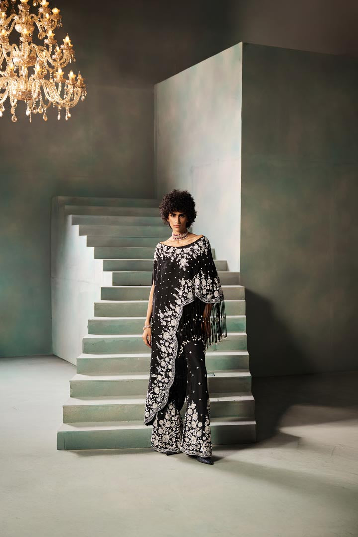 This cape set features ivory sequins and cutdana embroidery. The dori tassels on one side gives it an edge and completely fun look.