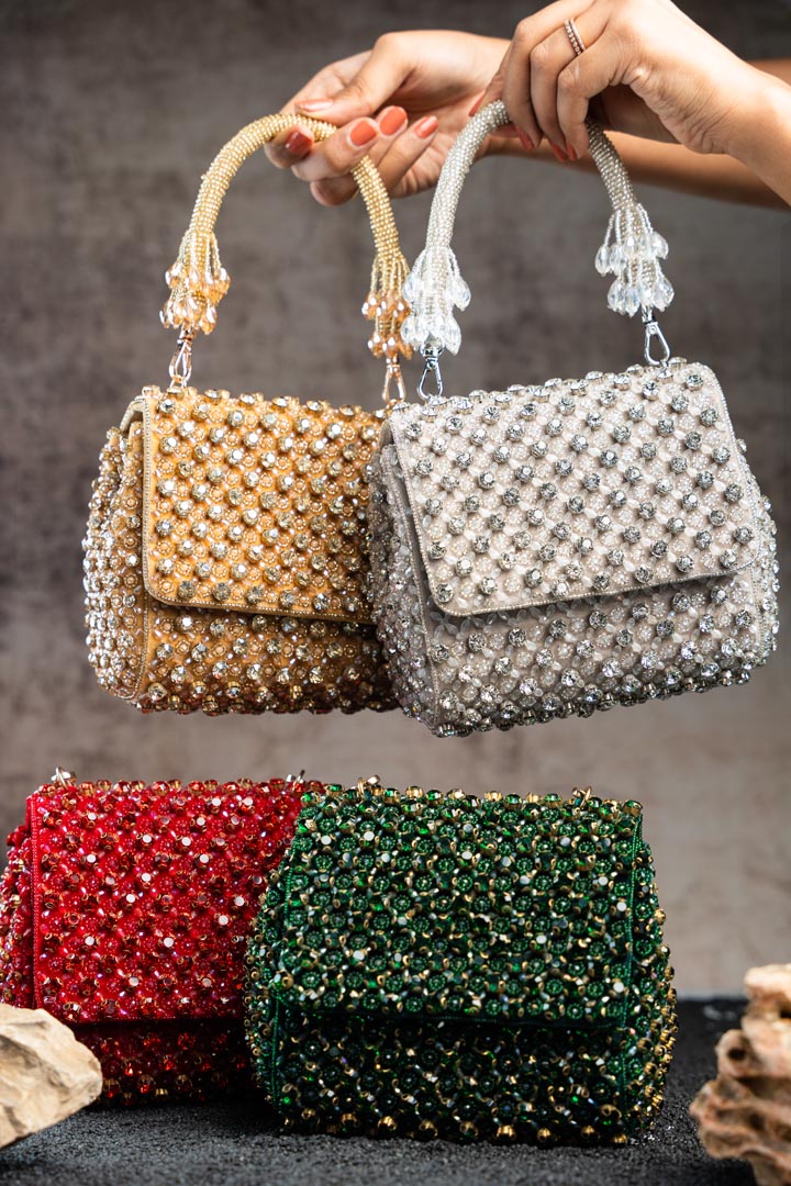 an emerald green mini bag adorned with shimmering crystals and intricate bead work. Perfect for adding a touch of elegance and sparkle to any special occasion, this clutch blends traditional artistry with a modern, sophisticated design. comes with a dazzling beaded handle finish making it a convenient and fashionable addition.