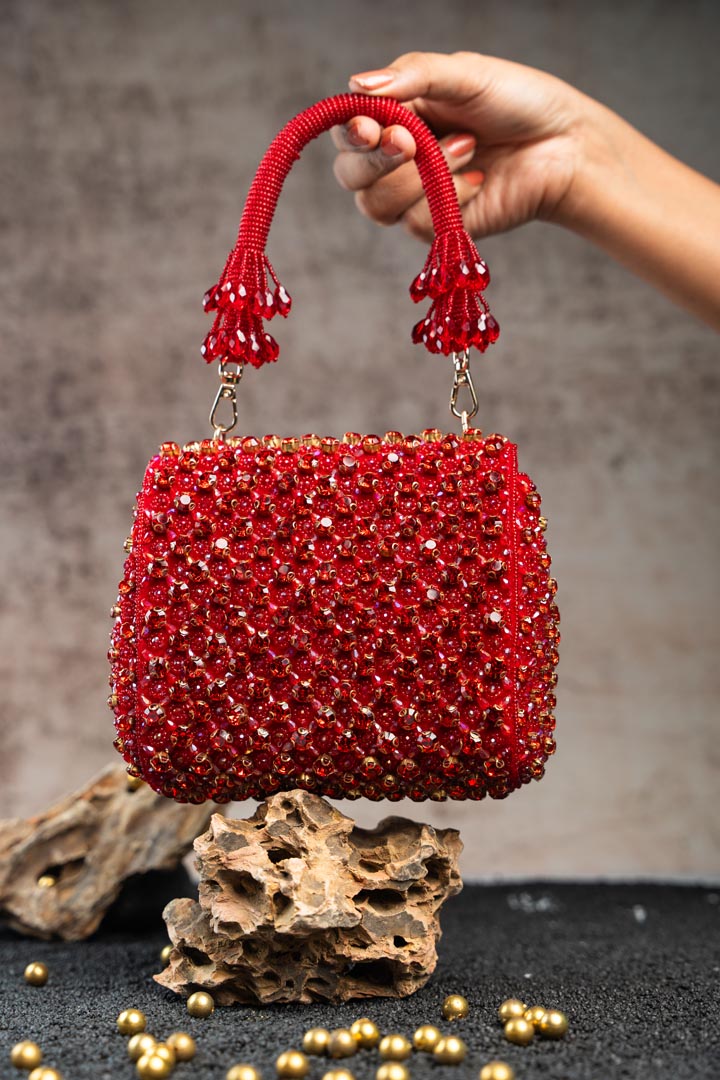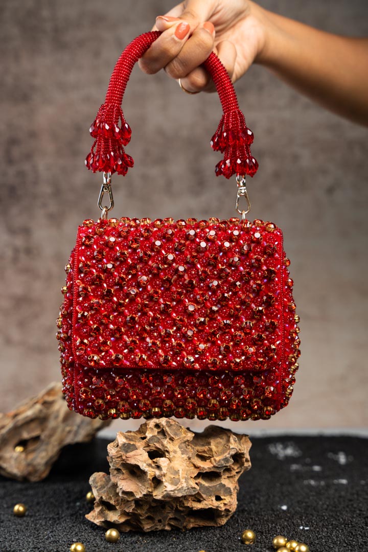 a wine mini bag adorned with shimmering crystals and intricate bead work. Perfect for adding a touch of elegance and sparkle to any special occasion, this clutch blends traditional artistry with a modern, sophisticated design. It comes with a dazzling beaded handle finish making it a convenient and fashionable addition.