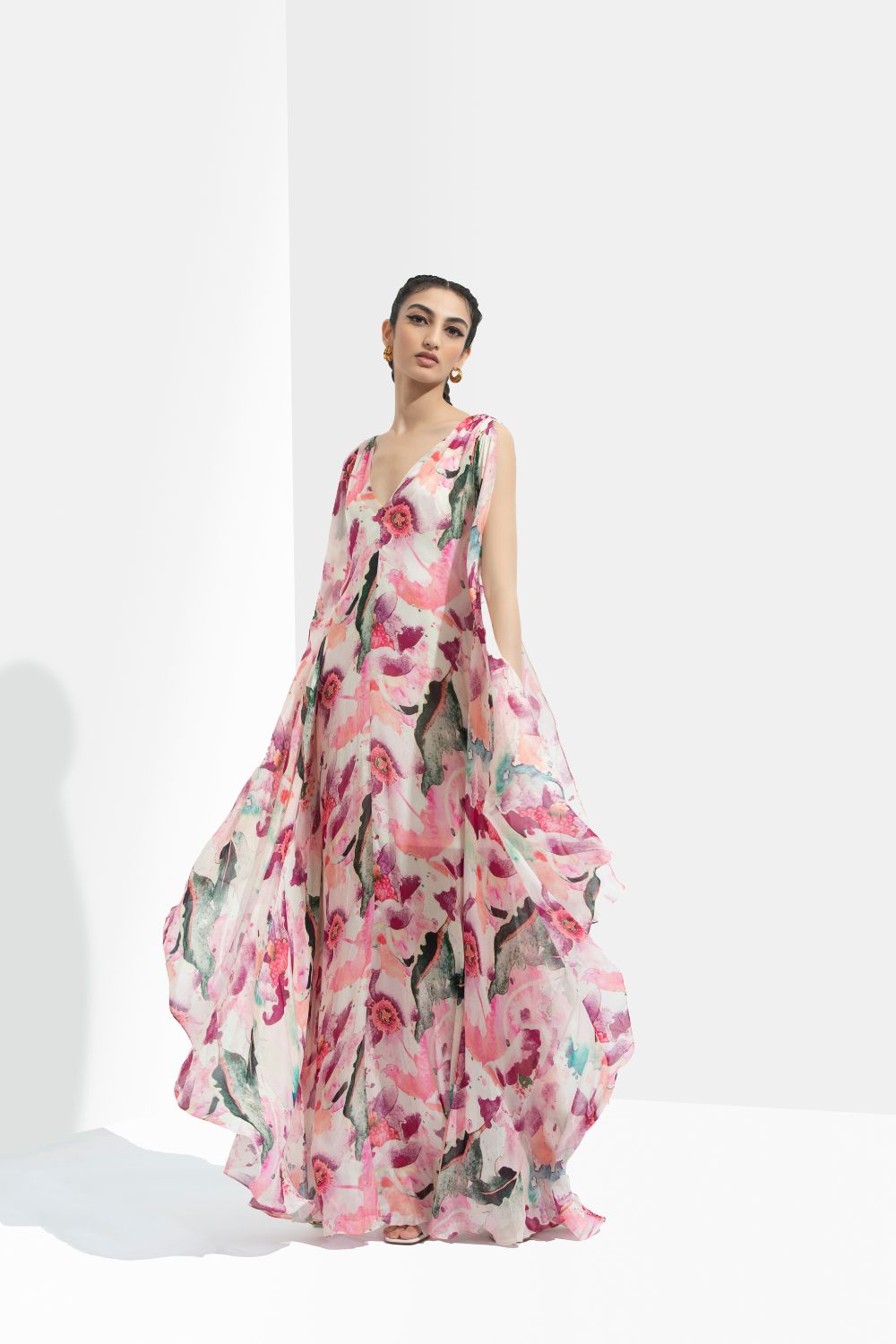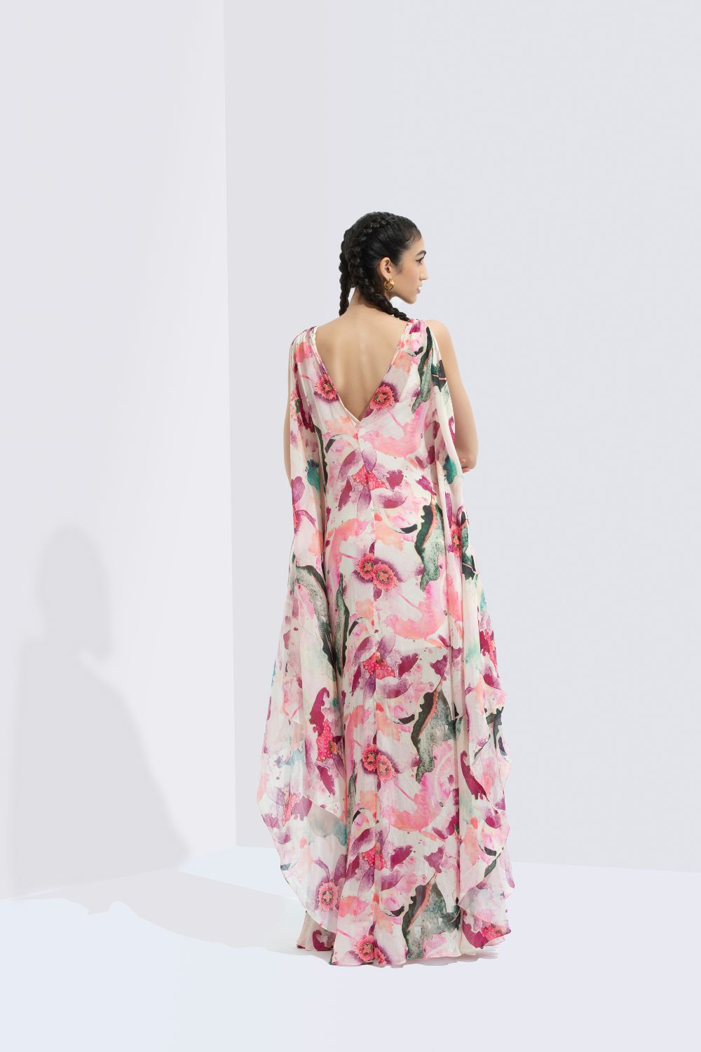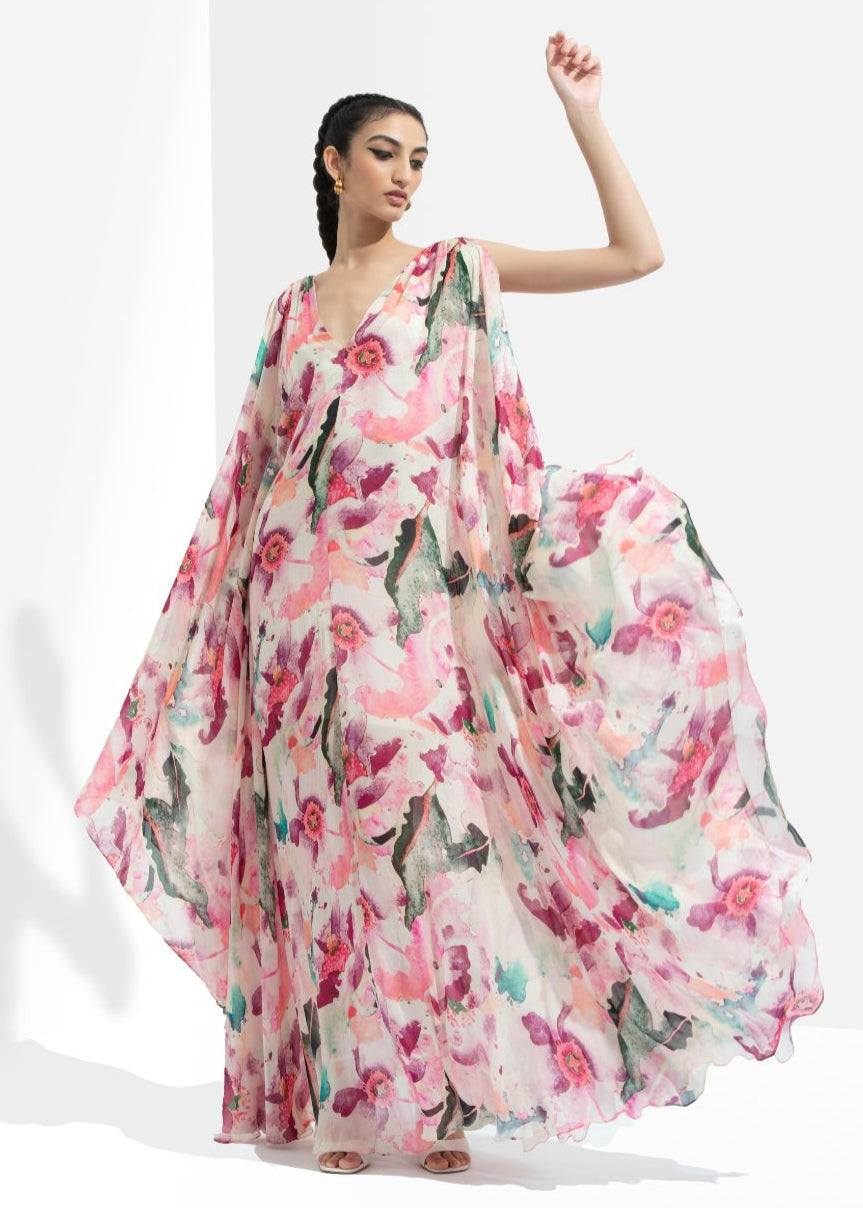 Indulge in the beauty of Mandira Wirk's Azalea Printed Chiffon Kaftan, exquisitely designed with a slip inside for added comfort and allure. Crafted from luxurious chiffon fabric adorned with a mesmerizing print, this kaftan is a true celebration of elegance and grace.