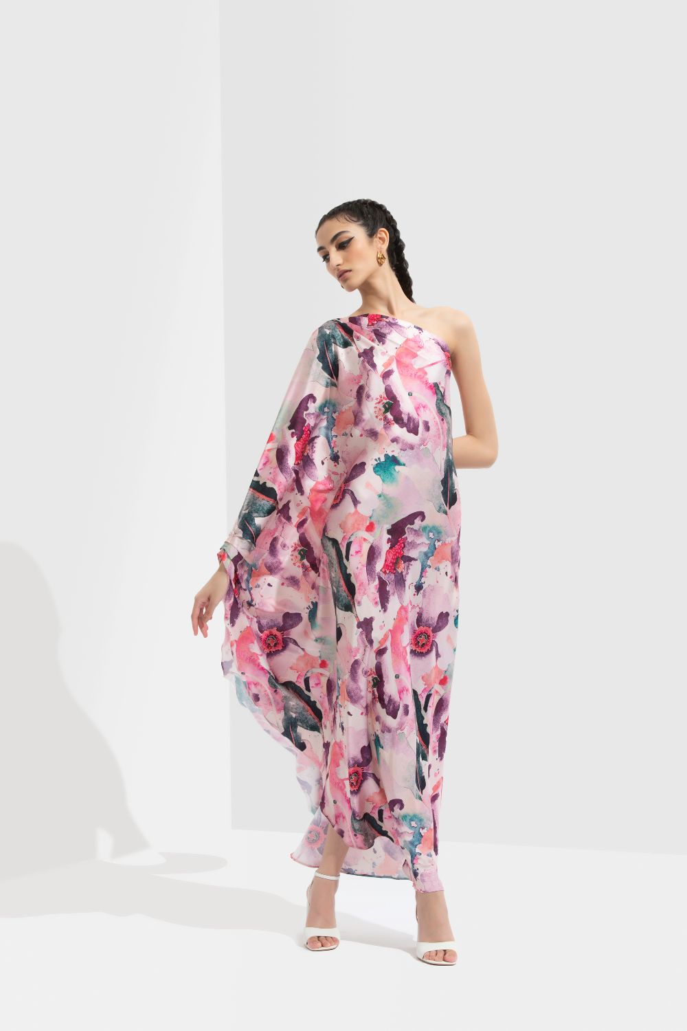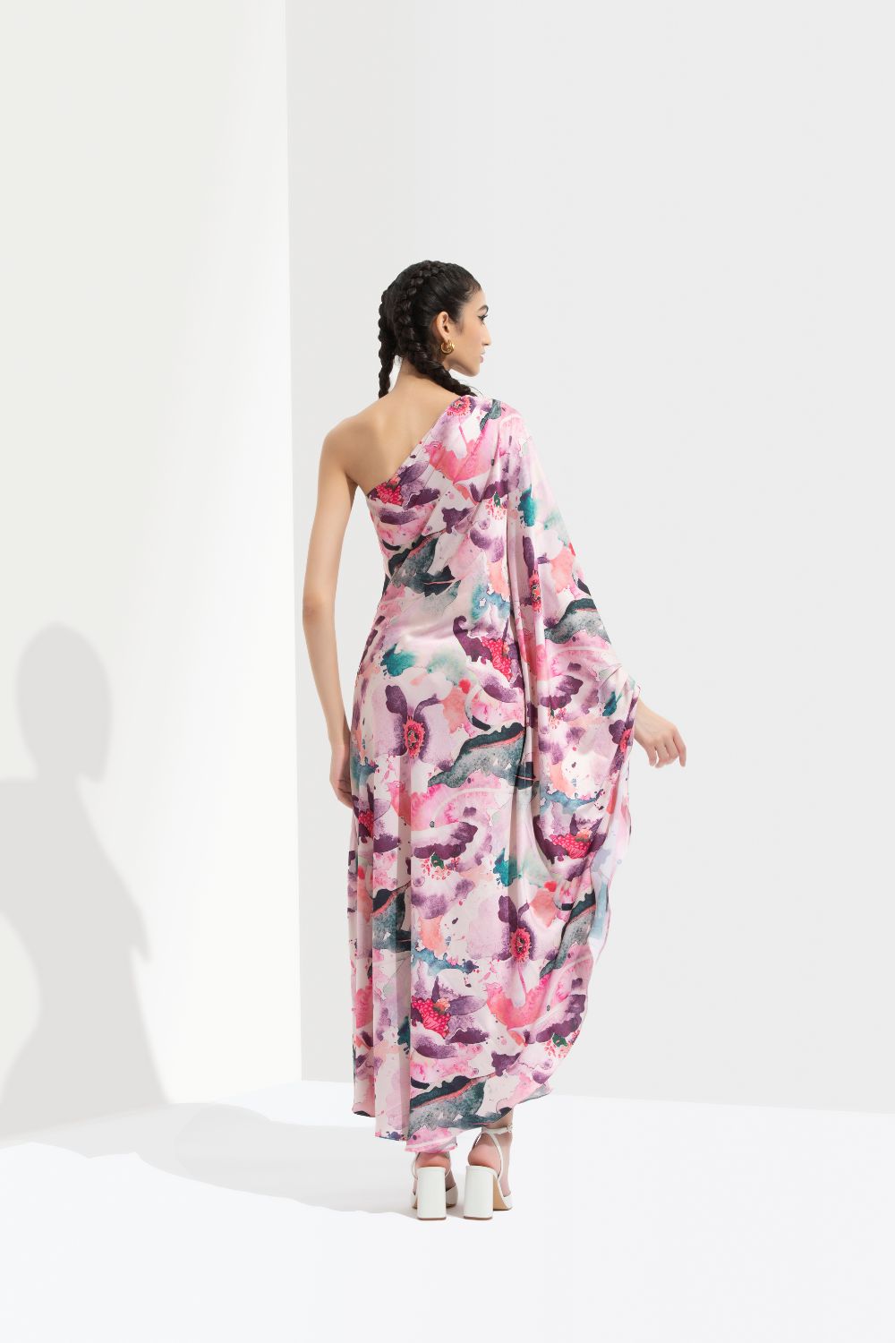 This mesmerizing dress is crafted from luxurious satin fabric adorned with a captivating print, inspired by the beauty of Azalea blooms.
