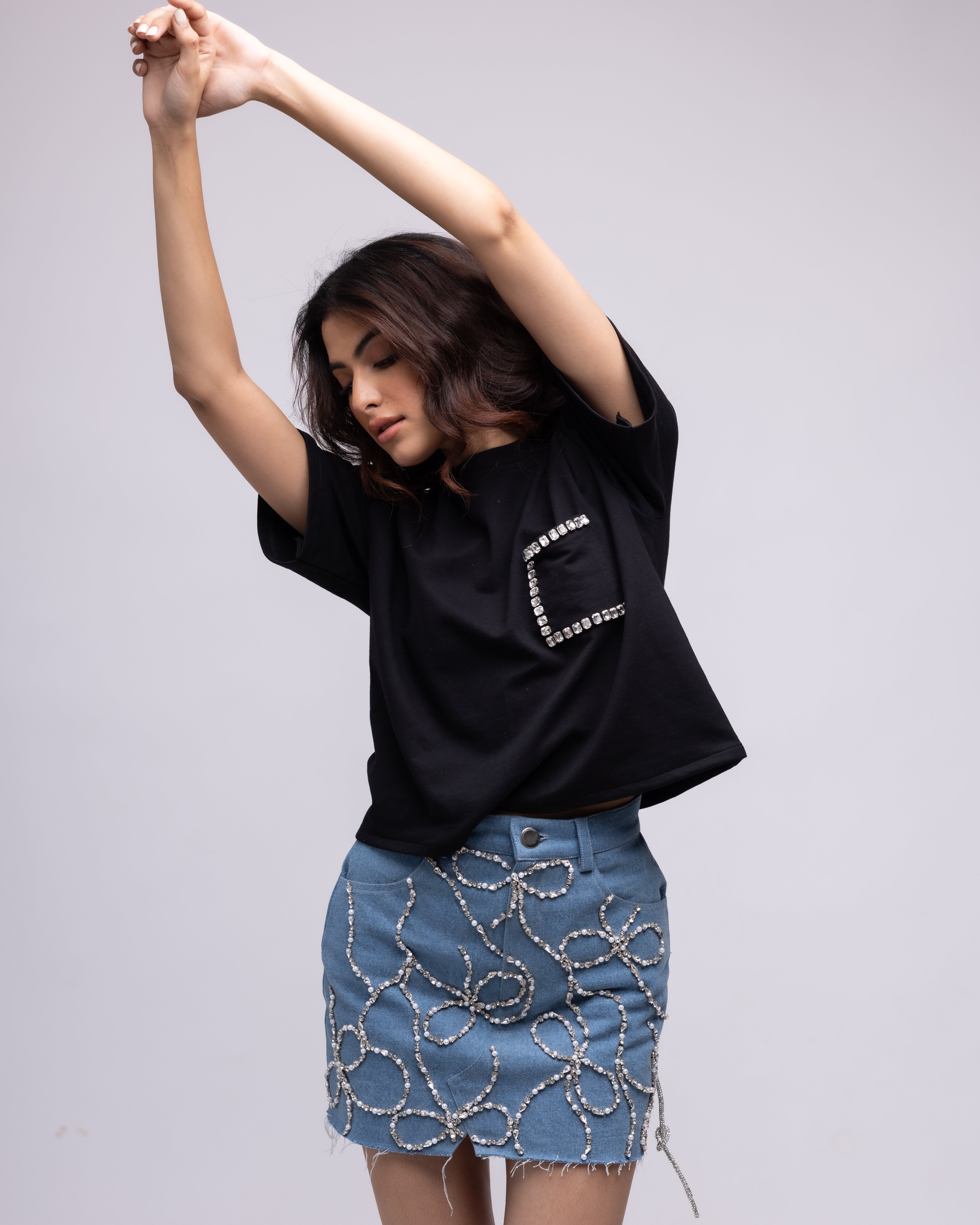 Loose-fitted t-shirt with a backless detail featuring a rhinestone rope with criss cross detail. The front features a chest pocket with rhinestone appliqués.