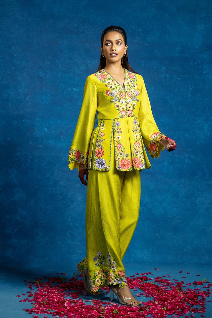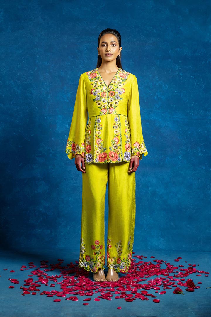 Yellow Rangtara embellished panneled peplum top, paired with printed straight pants in silk.