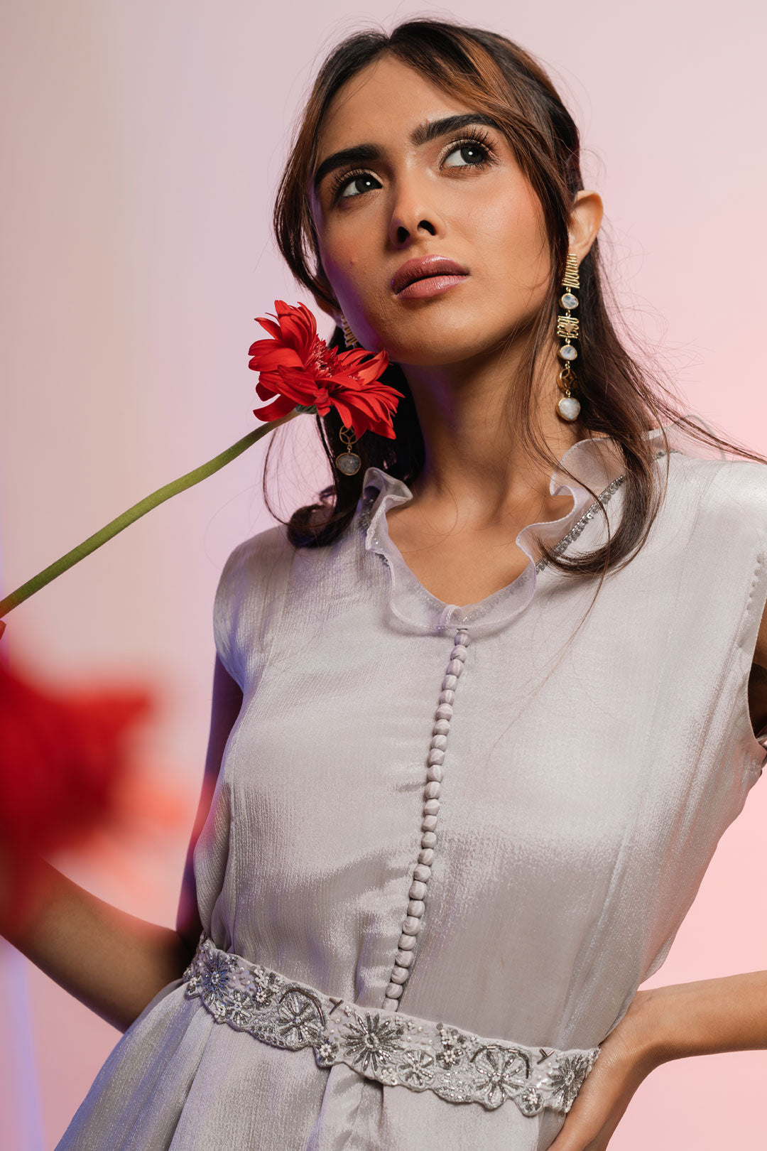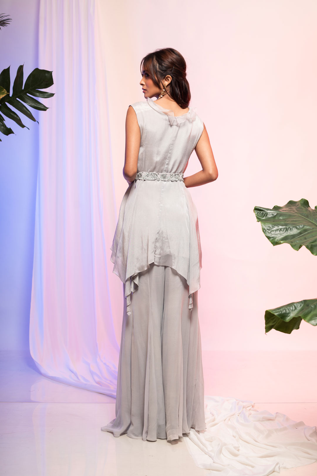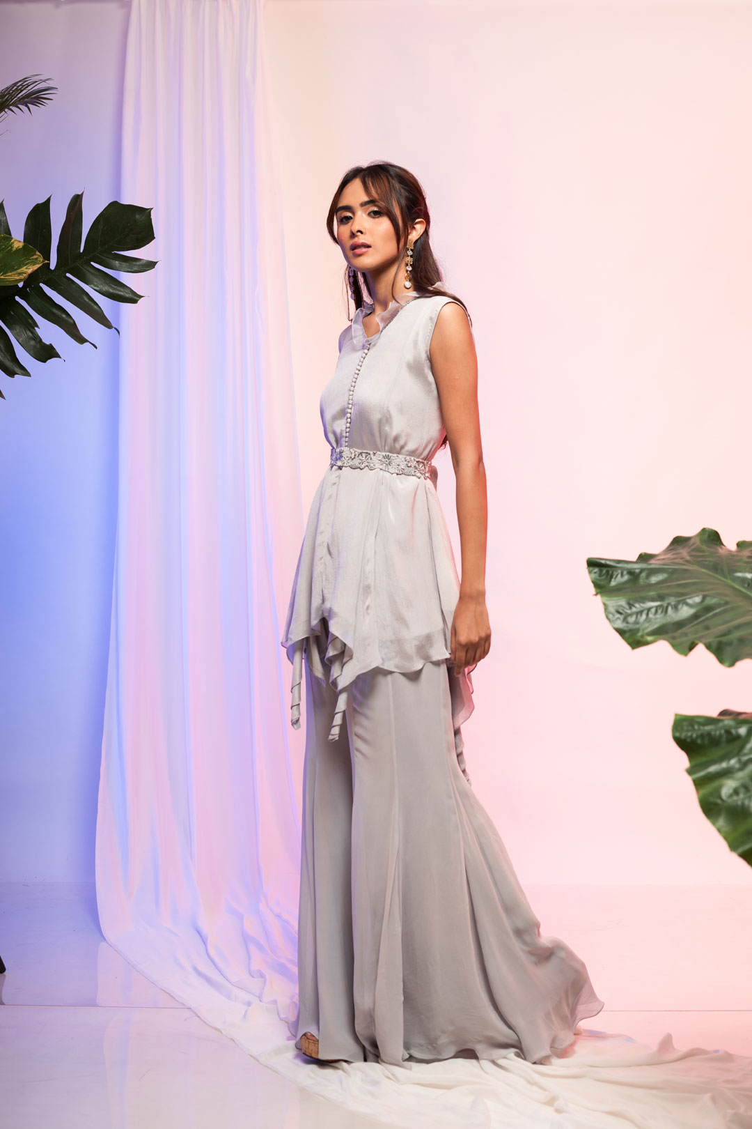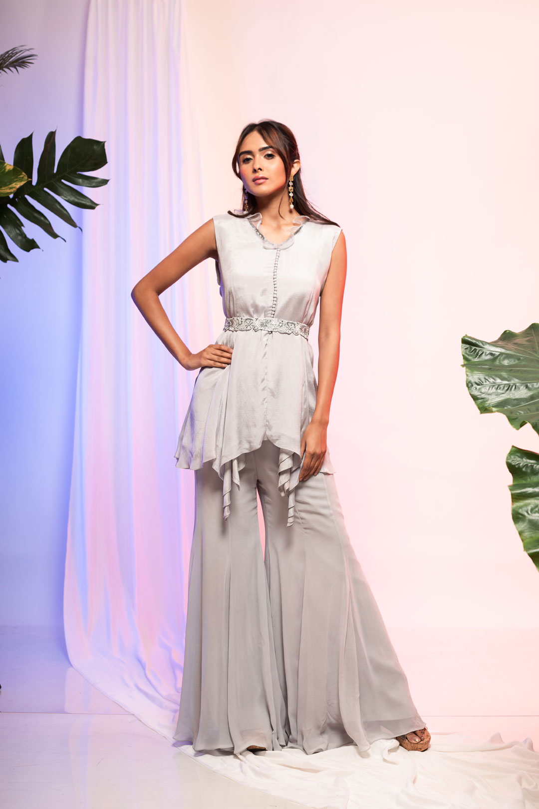 Steel Grey Panelled Asymmetric Peplum With Hipster Pants, Adorned With Embellished Belt.