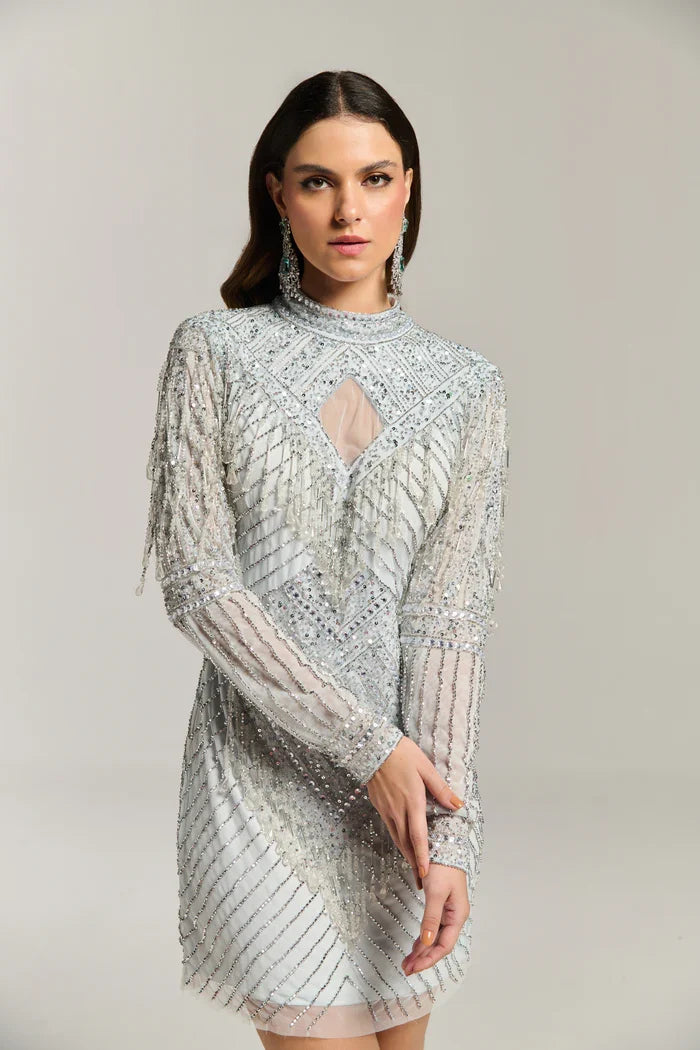 Elegant beaded mini dress with sheer long sleeves, exuding sophistication. The silver and white beads create a shimmering geometric pattern, highlighted by a prominent diamond design on the front. Fringe details with drop beads add a playful touch, while the high neckline features a delicate diamond-shaped cutout, blending modesty with allure.