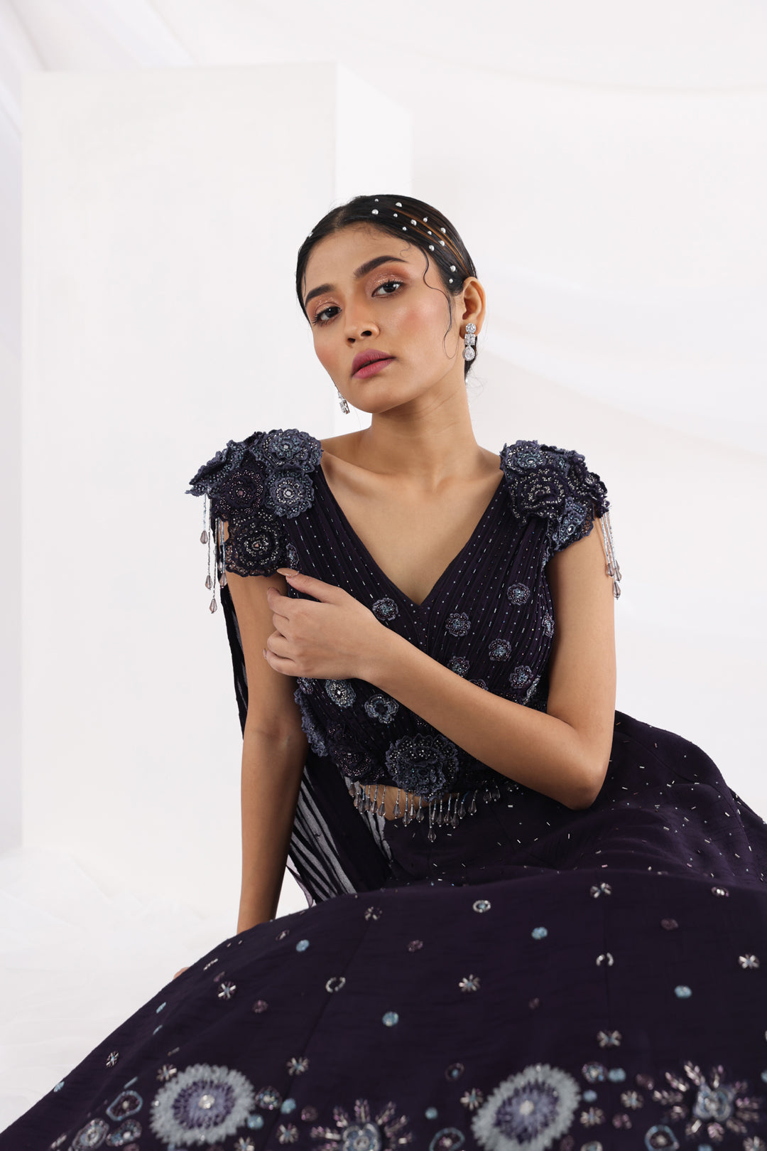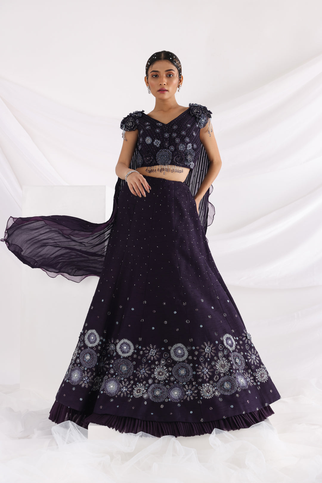 plum lehenga set is an absolute stunner. floral cutout motifs run along the shoulders of this pleated blouse with beaded tassels.