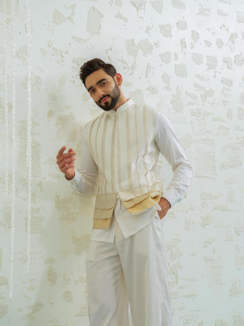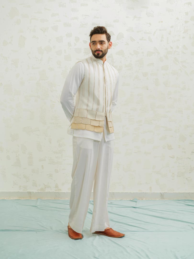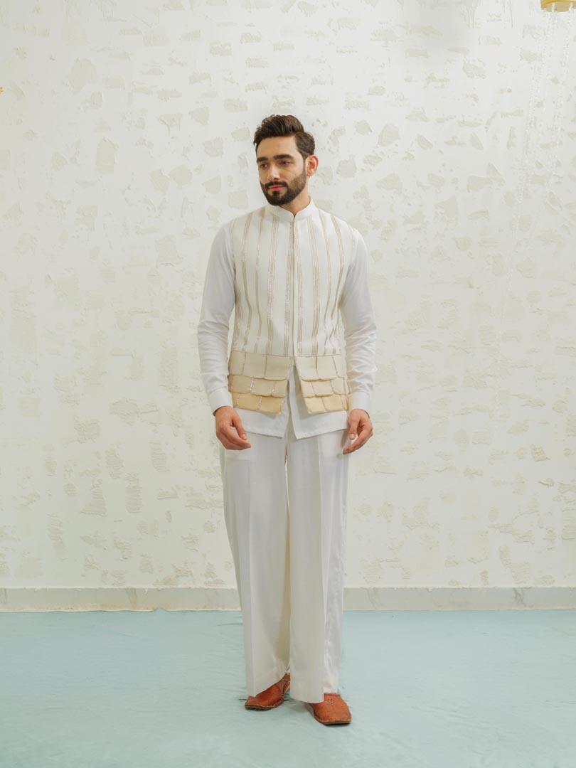 The bundi features vertical golden stripes on the upper half and a unique design detail at the lower half with overlapping embroidered flaps.