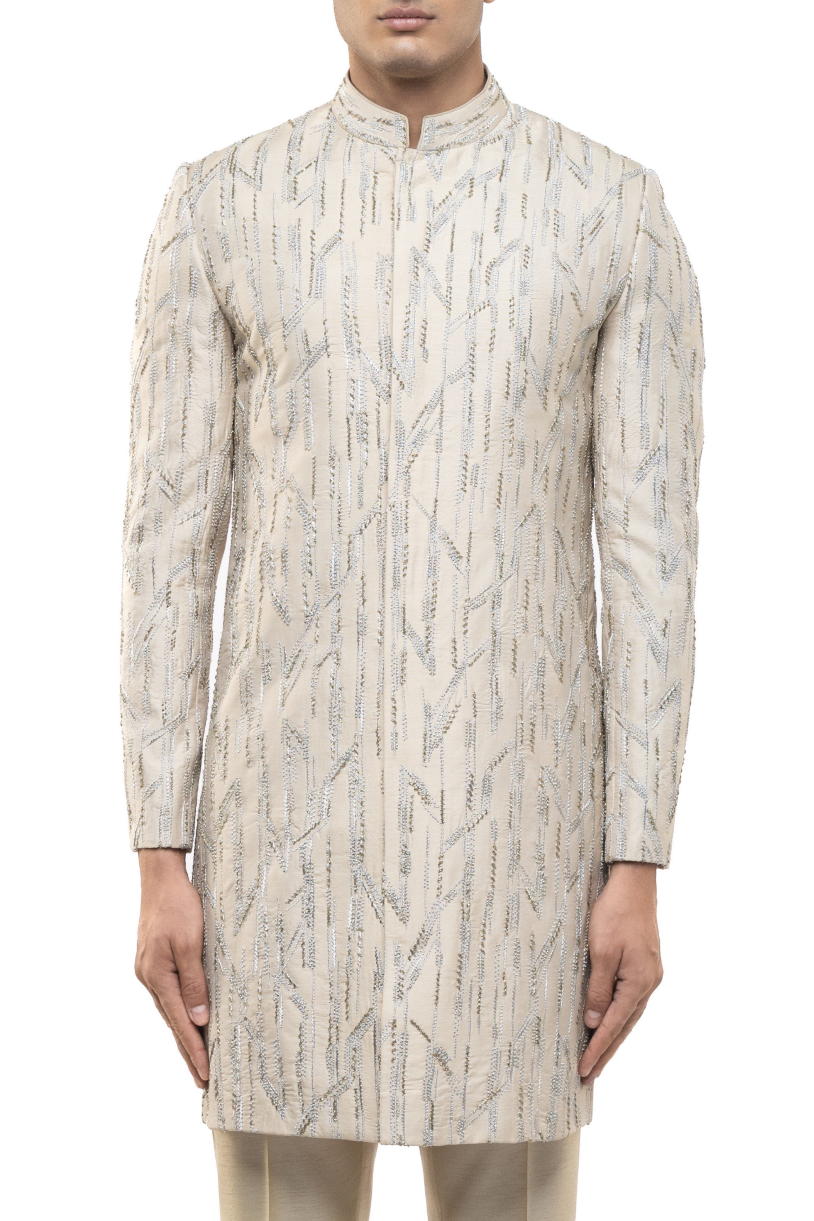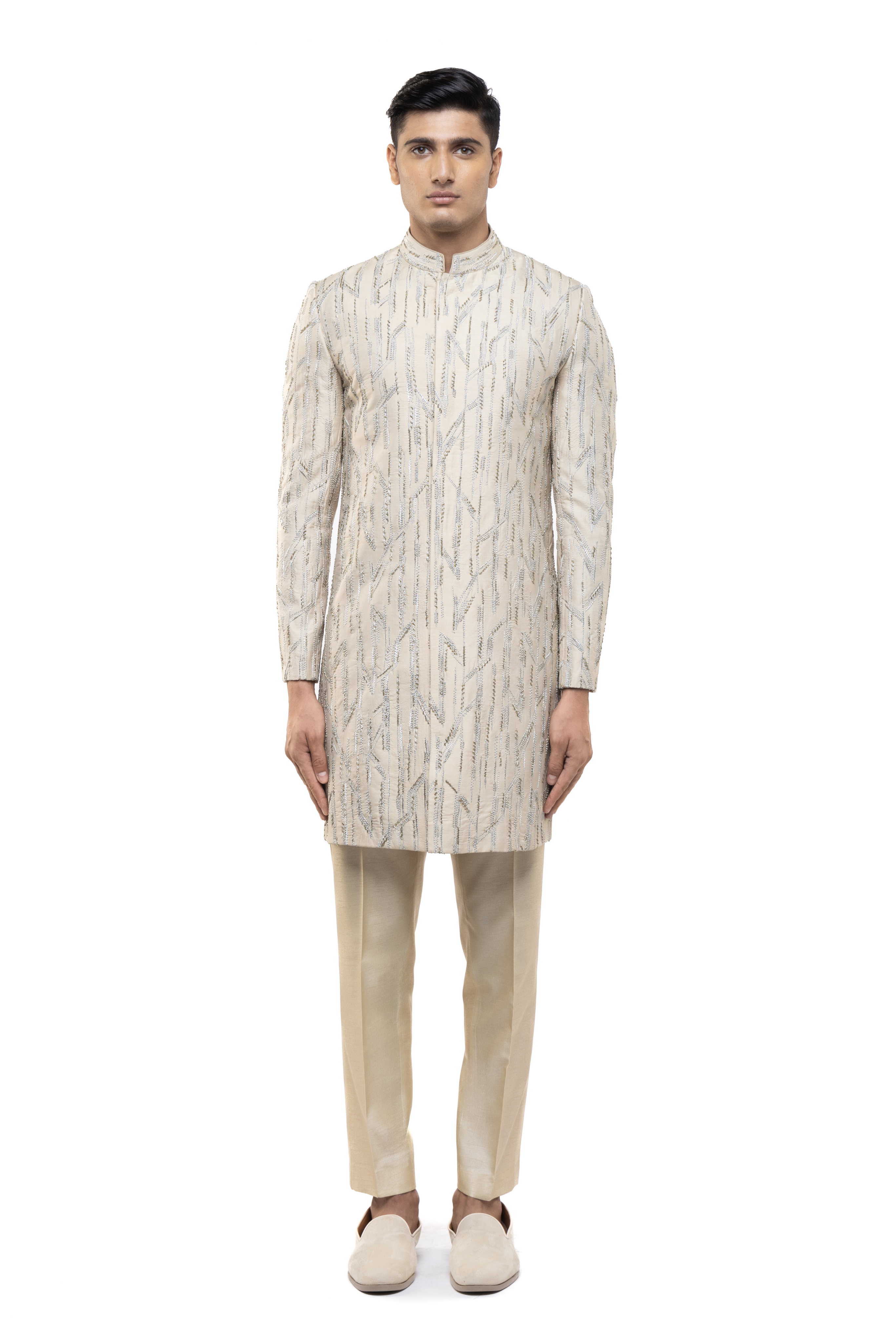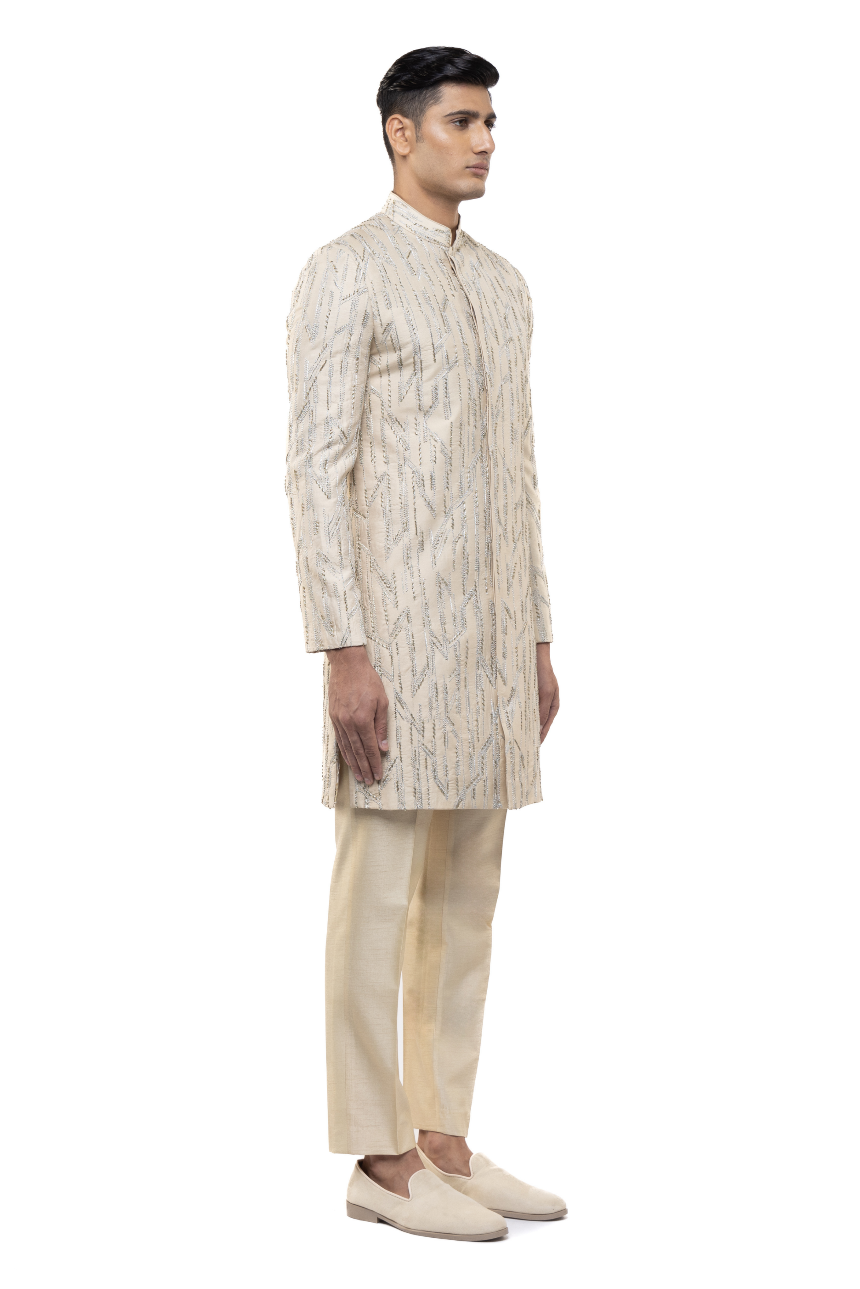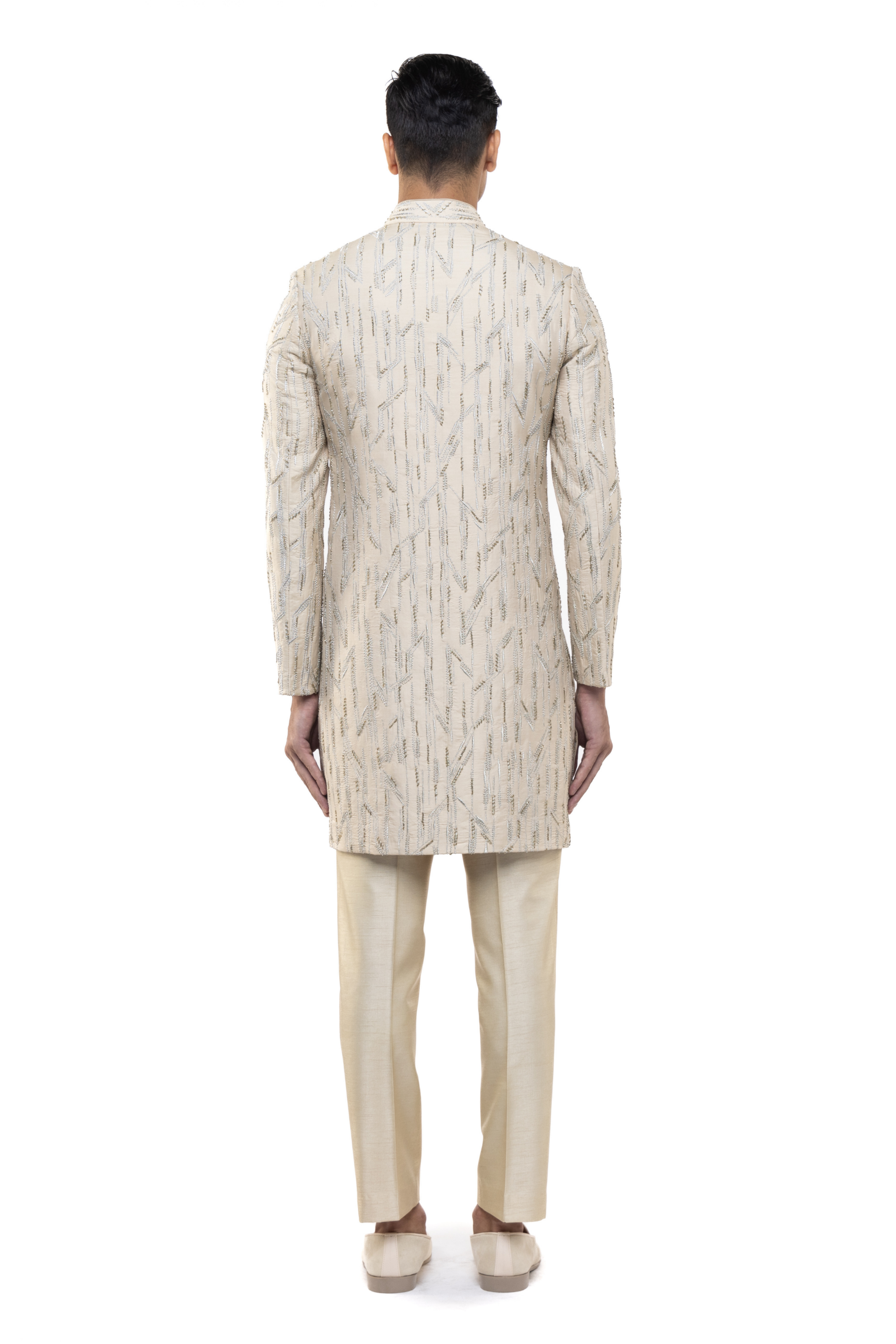 This beige silk sherwani features abstract sequin embroidery, ideal for Mehendi, Haldi, or any festive celebration.