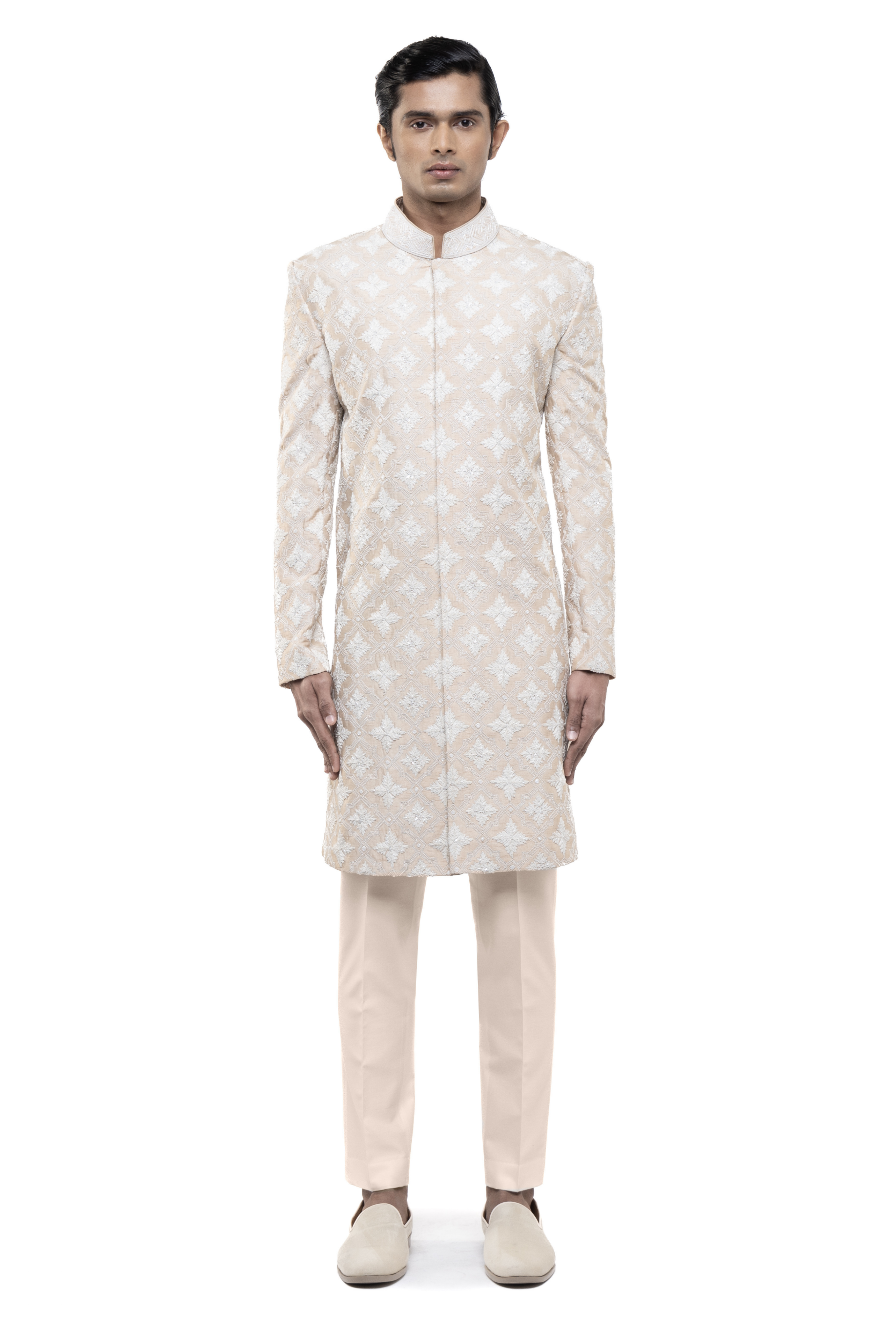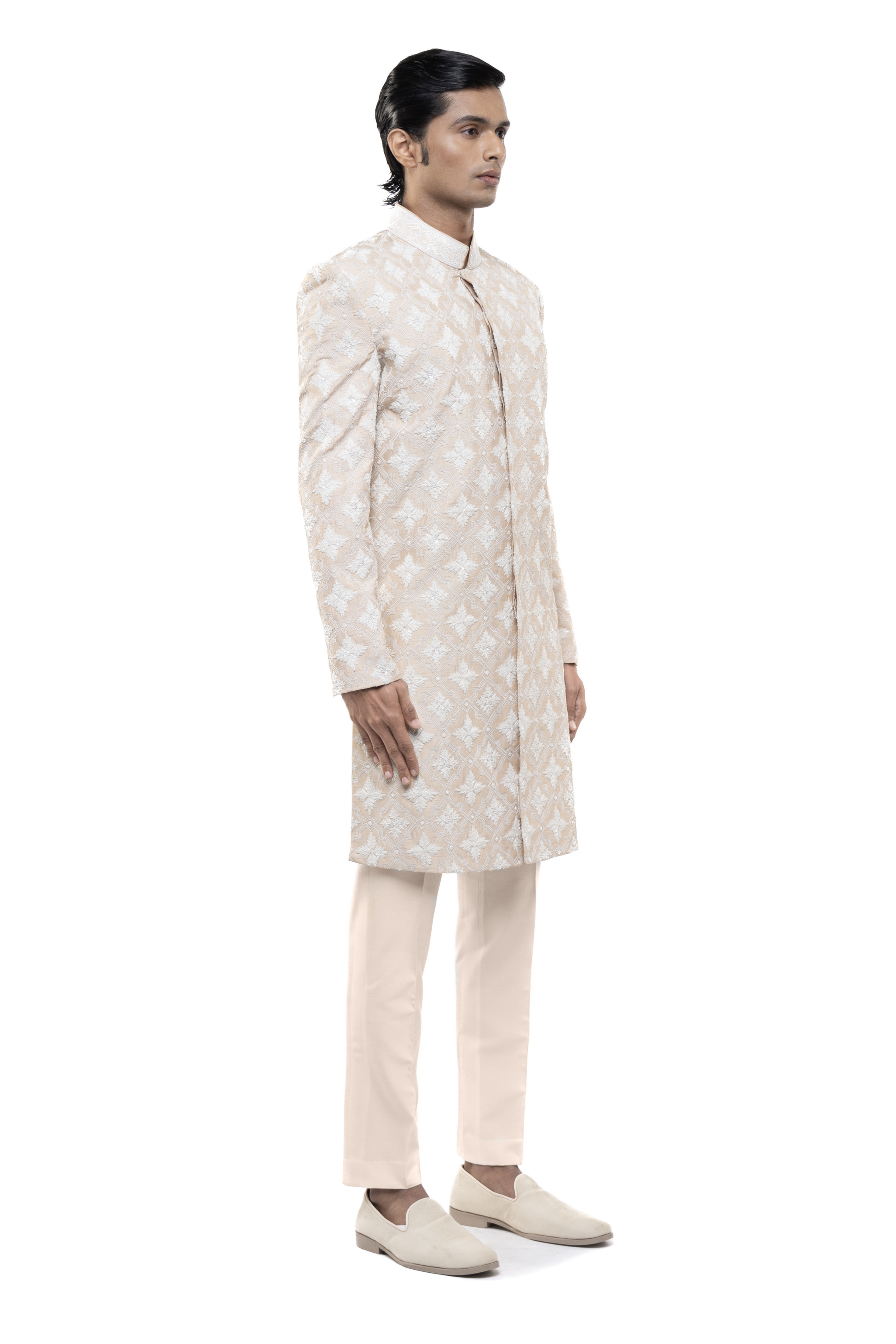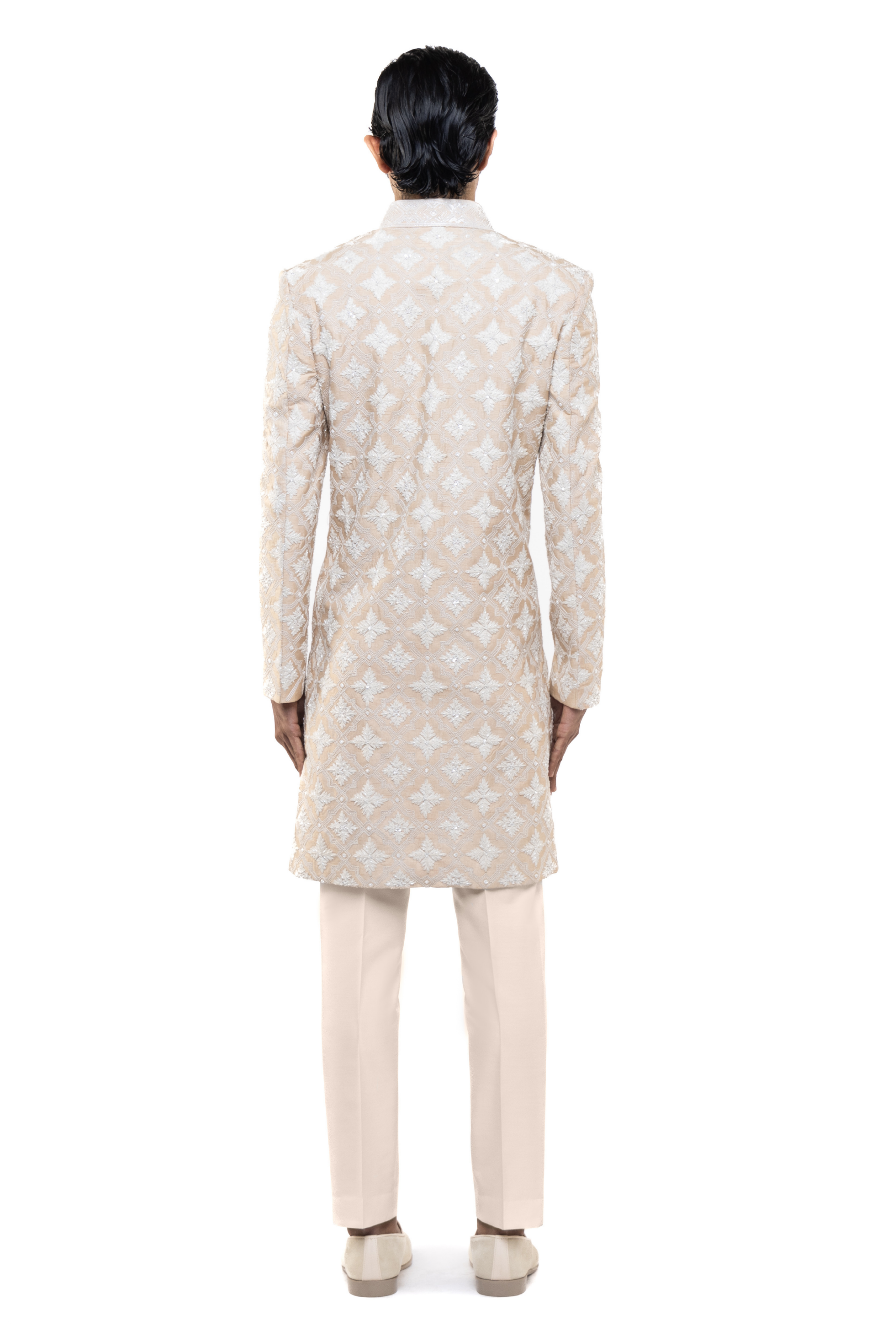 This beige and white silk sherwani is embellished with intricate dori embroidery, perfect for weddings, festive events, or ethnic occasions.