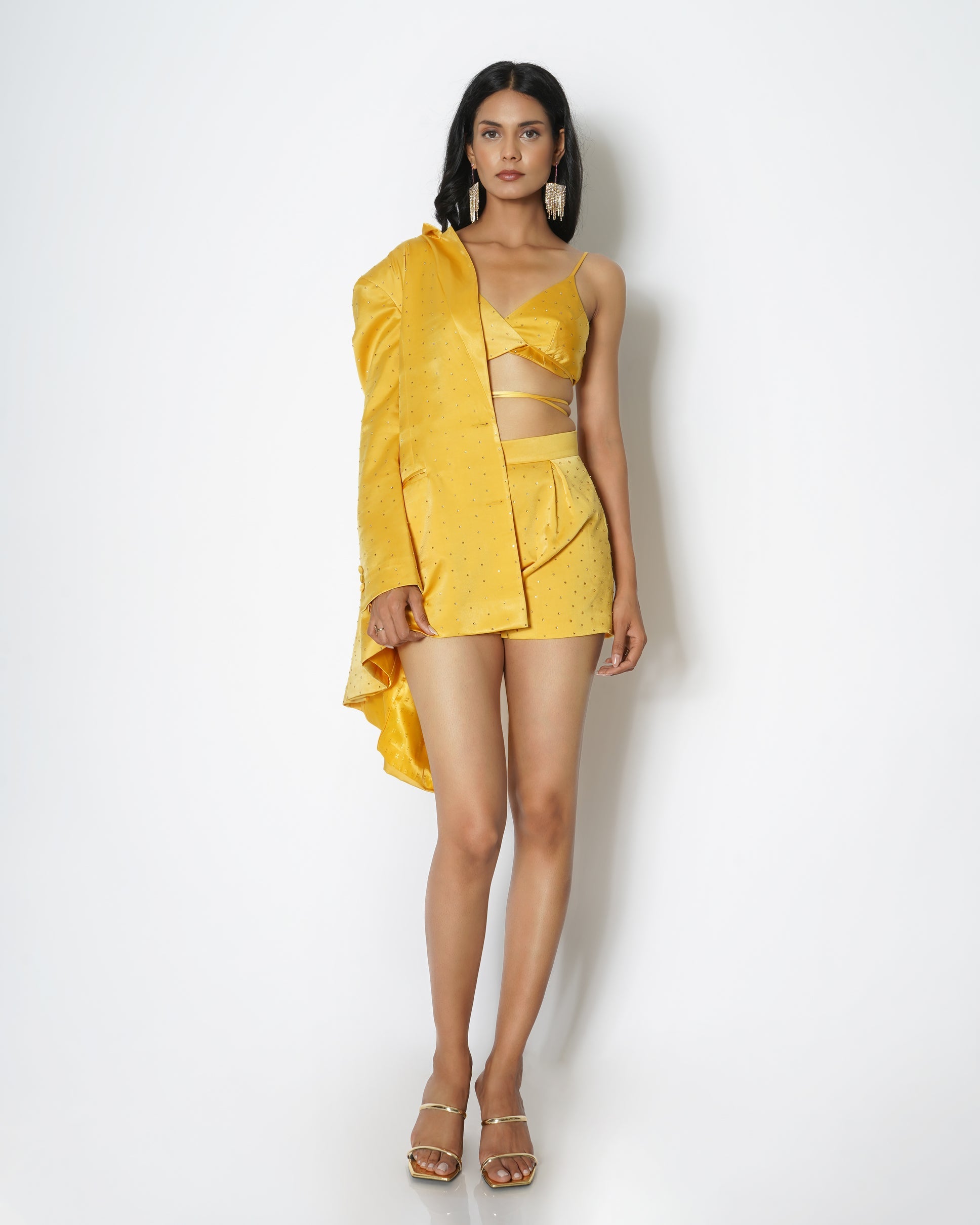 Bejewelled blazer featuring side pockets and a chest pocket. Fits oversized. Lined.