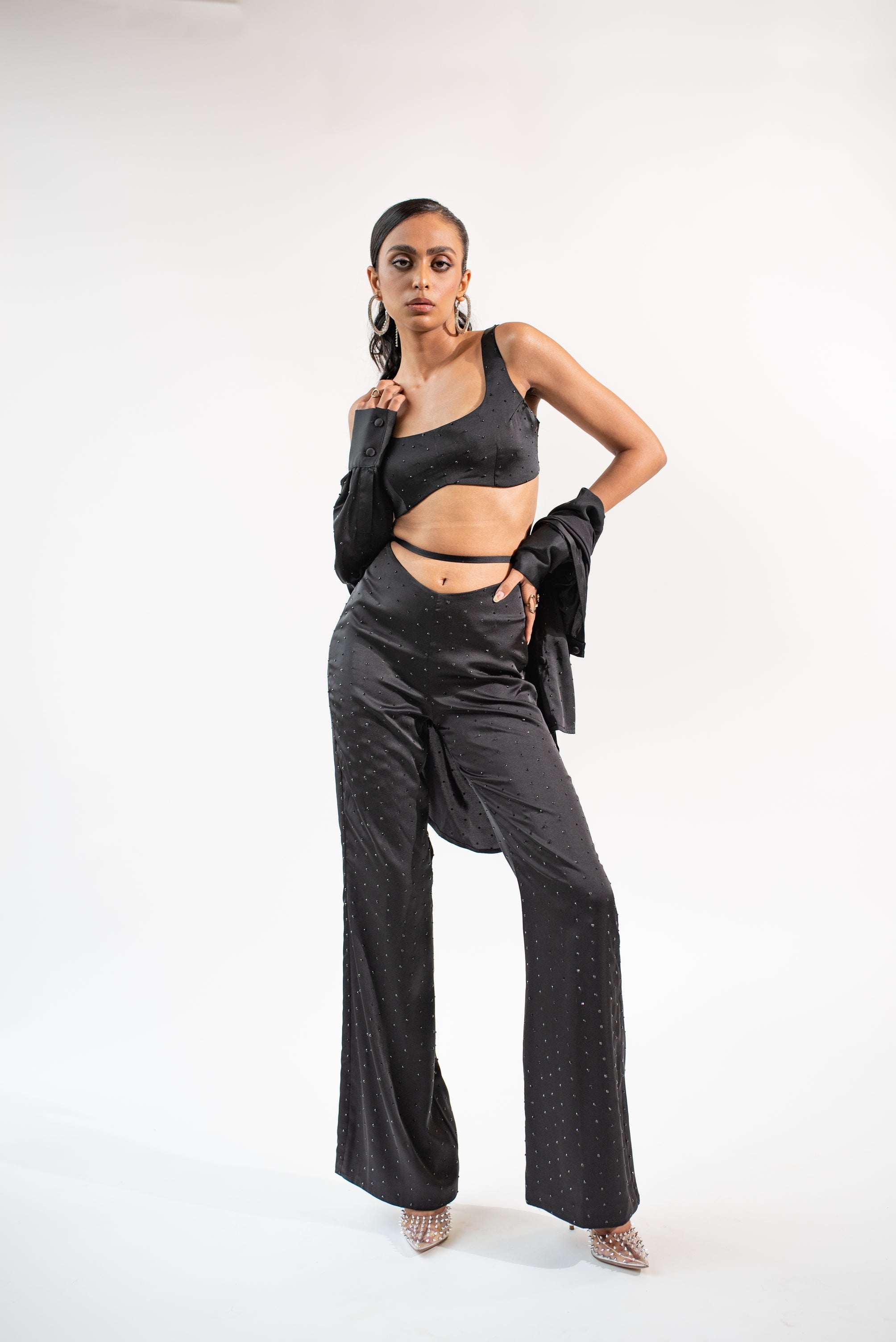 Bejewelled satin bustier featuring wide straps and smocking on the back for a fitted look. Lined.