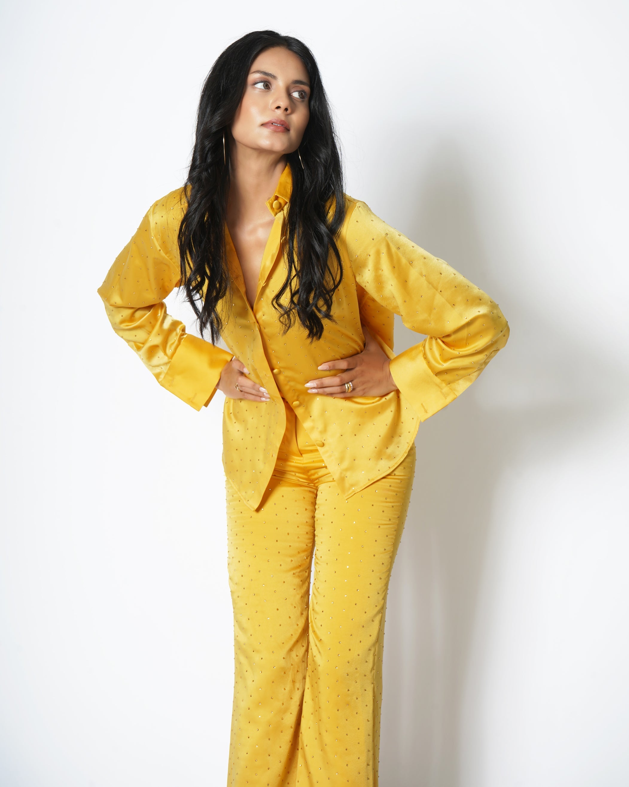 Long sleeved shirt bejewelled shirt. Front button closure.
