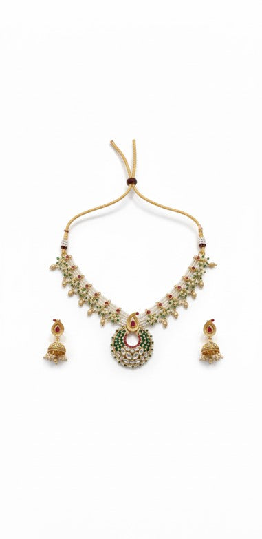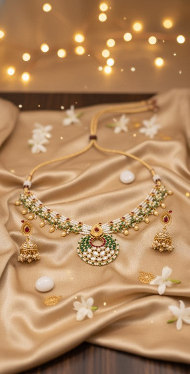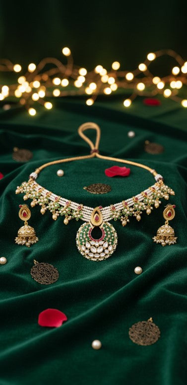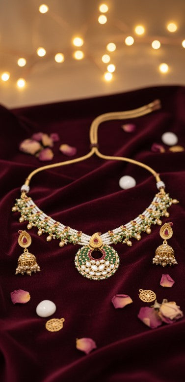 Adorn yourself in timeless grace with The 'Bela' Kundan & Pearl Jhumka Set. This enchanting choker-style necklace features multiple strands of lustrous pearls intricately woven with delicate Kundan-style stonework set in an antique gold-tone finish. The central pendant is a vibrant focal point, showcasing rich ruby-red and emerald-green stones in a traditional design.