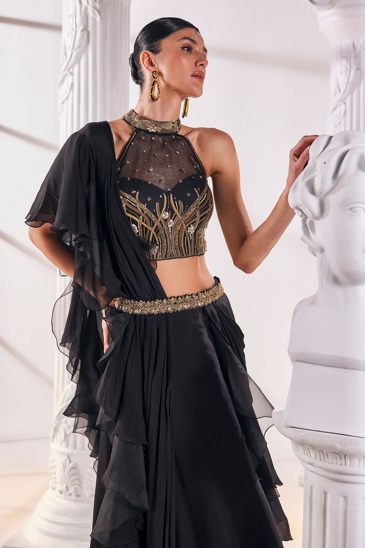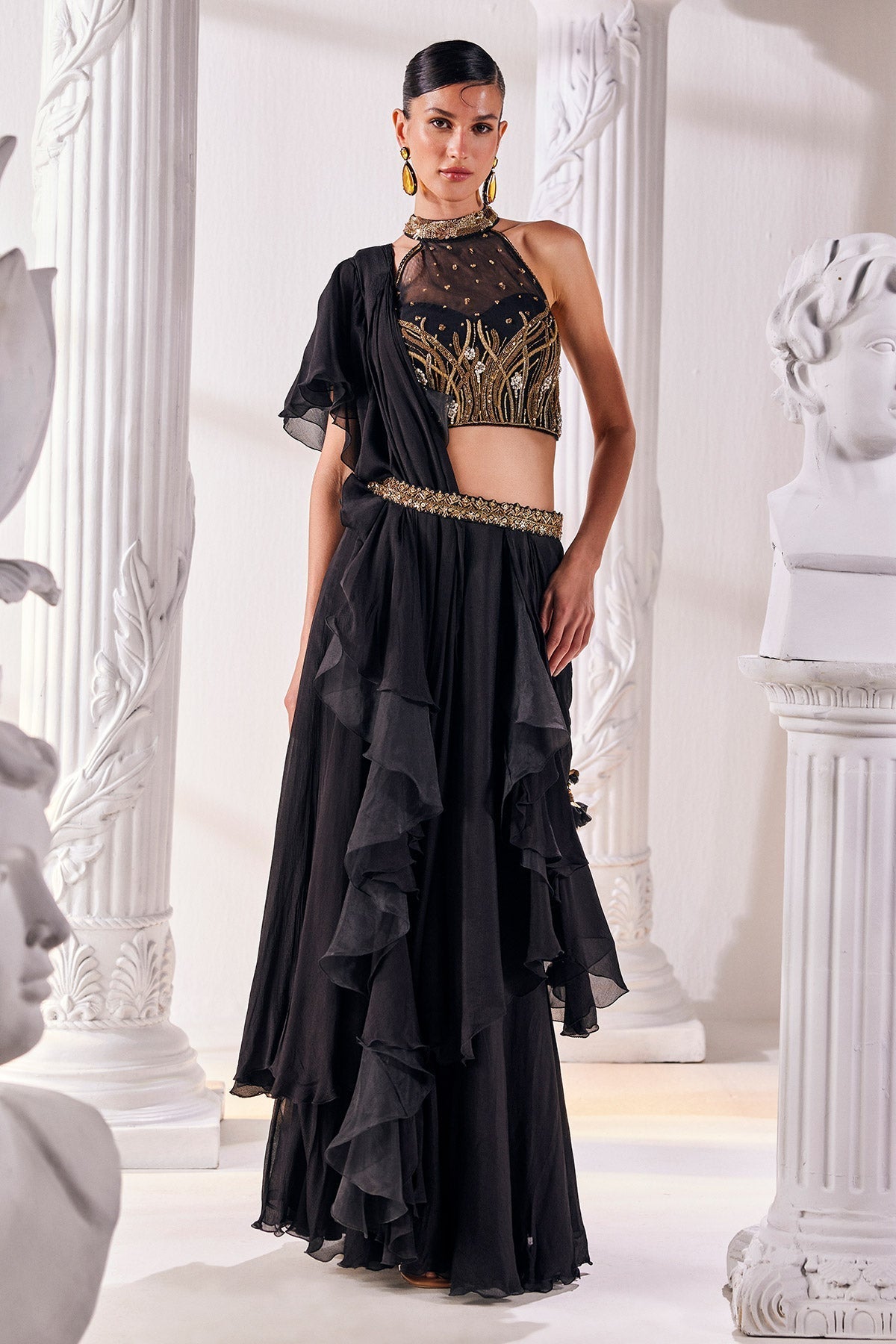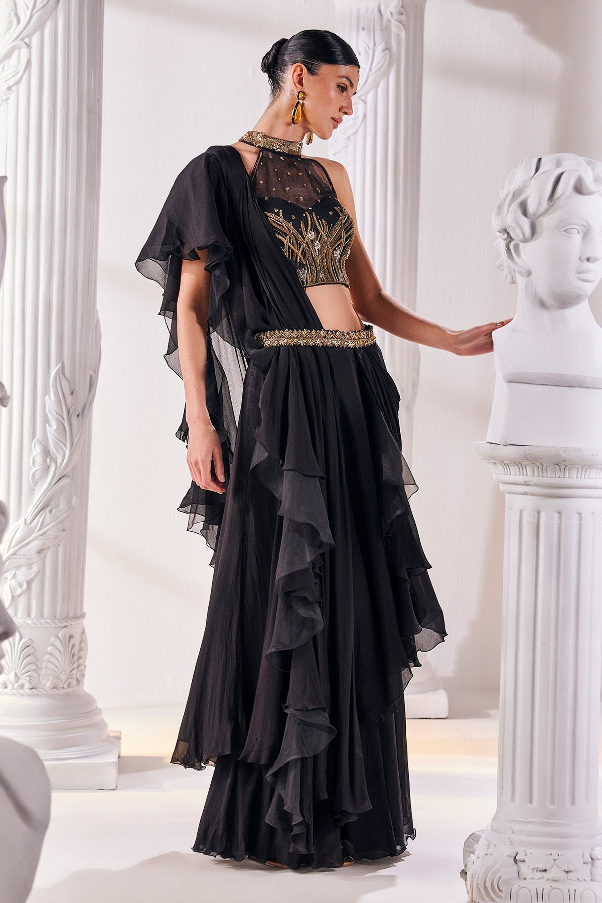 Chiffon drape saree ensemble, featuring an embroidered organza blouse and an elegant belt. Draped in chiffon, it exudes effortless grace, while the intricate embroidery on the organza blouse adds a touch of luxury. Complete with a chic belt to accentuate the waistline.