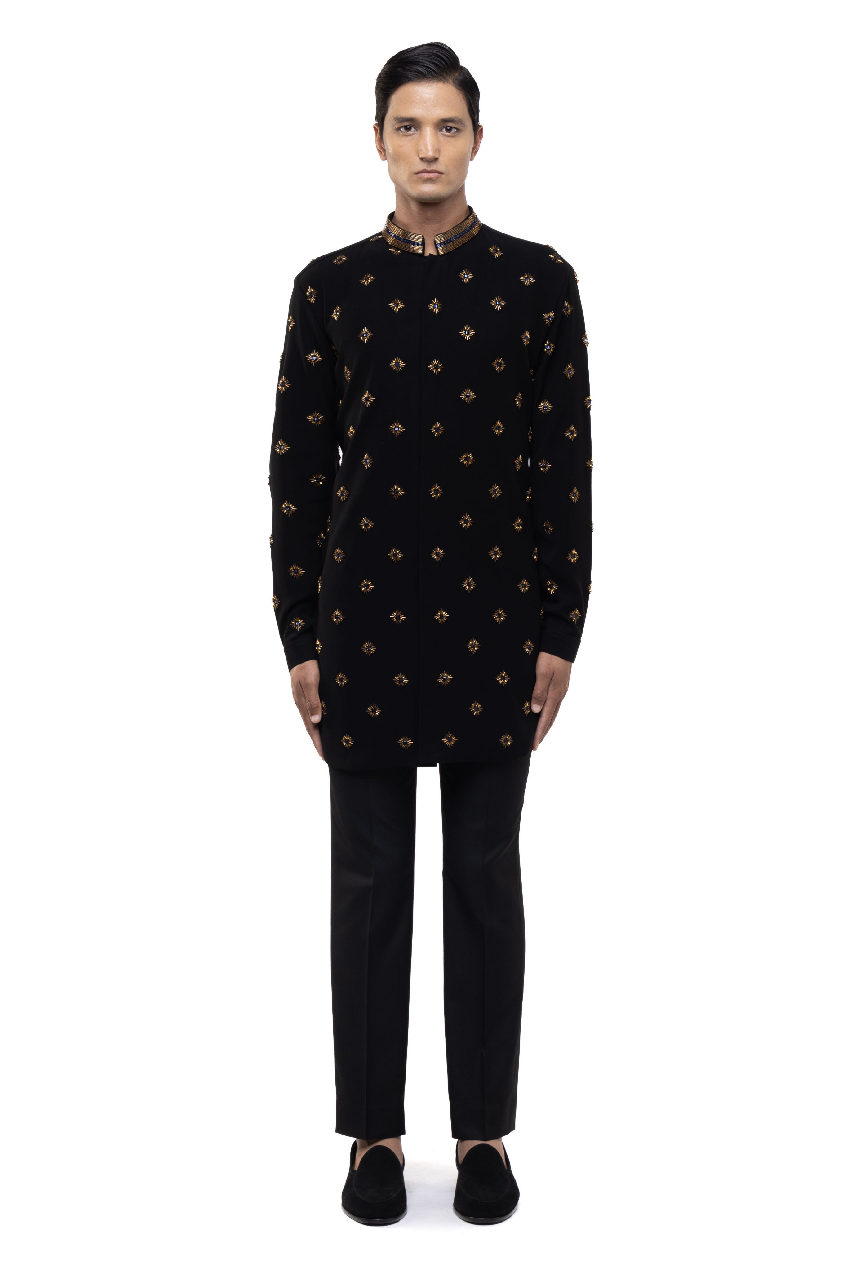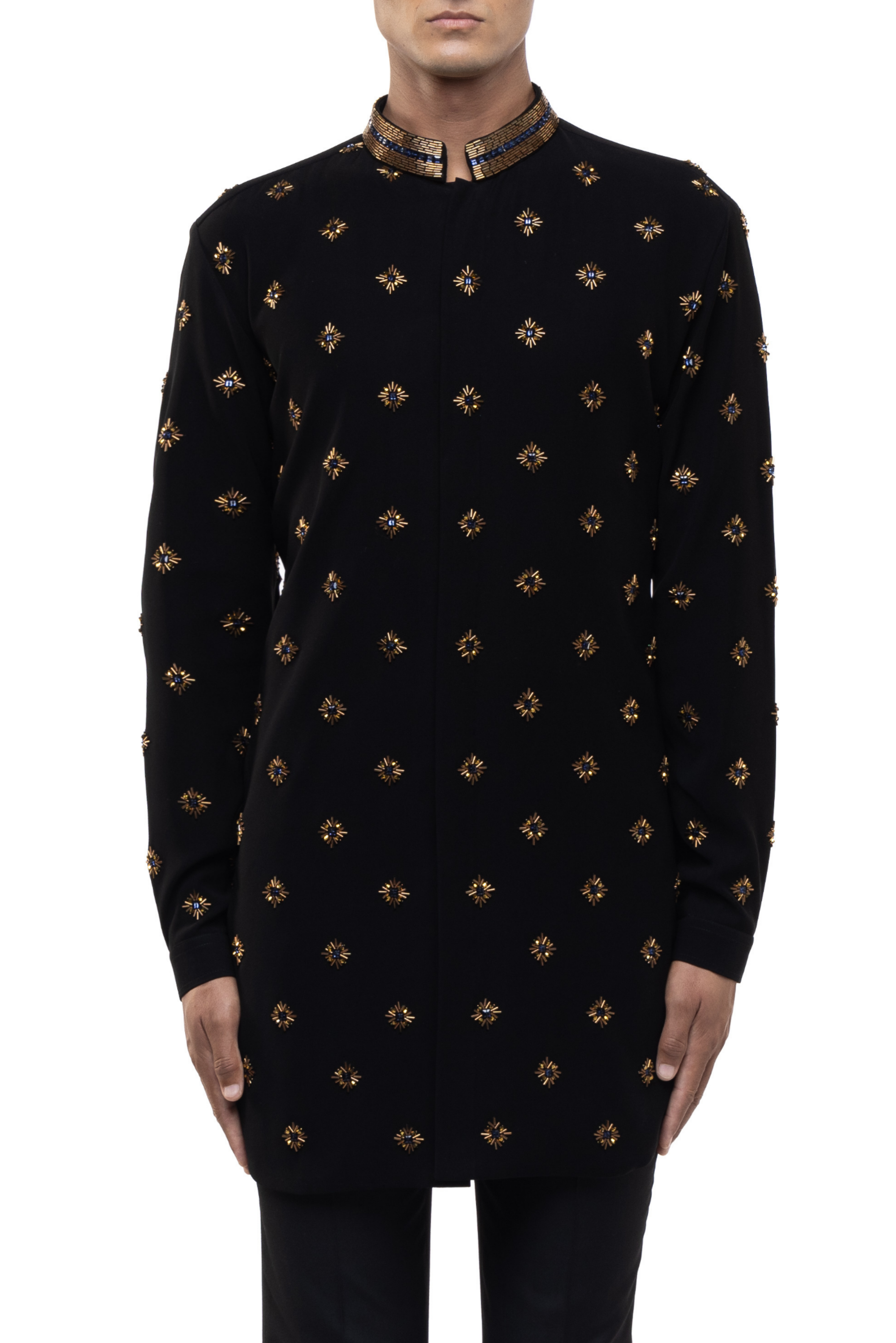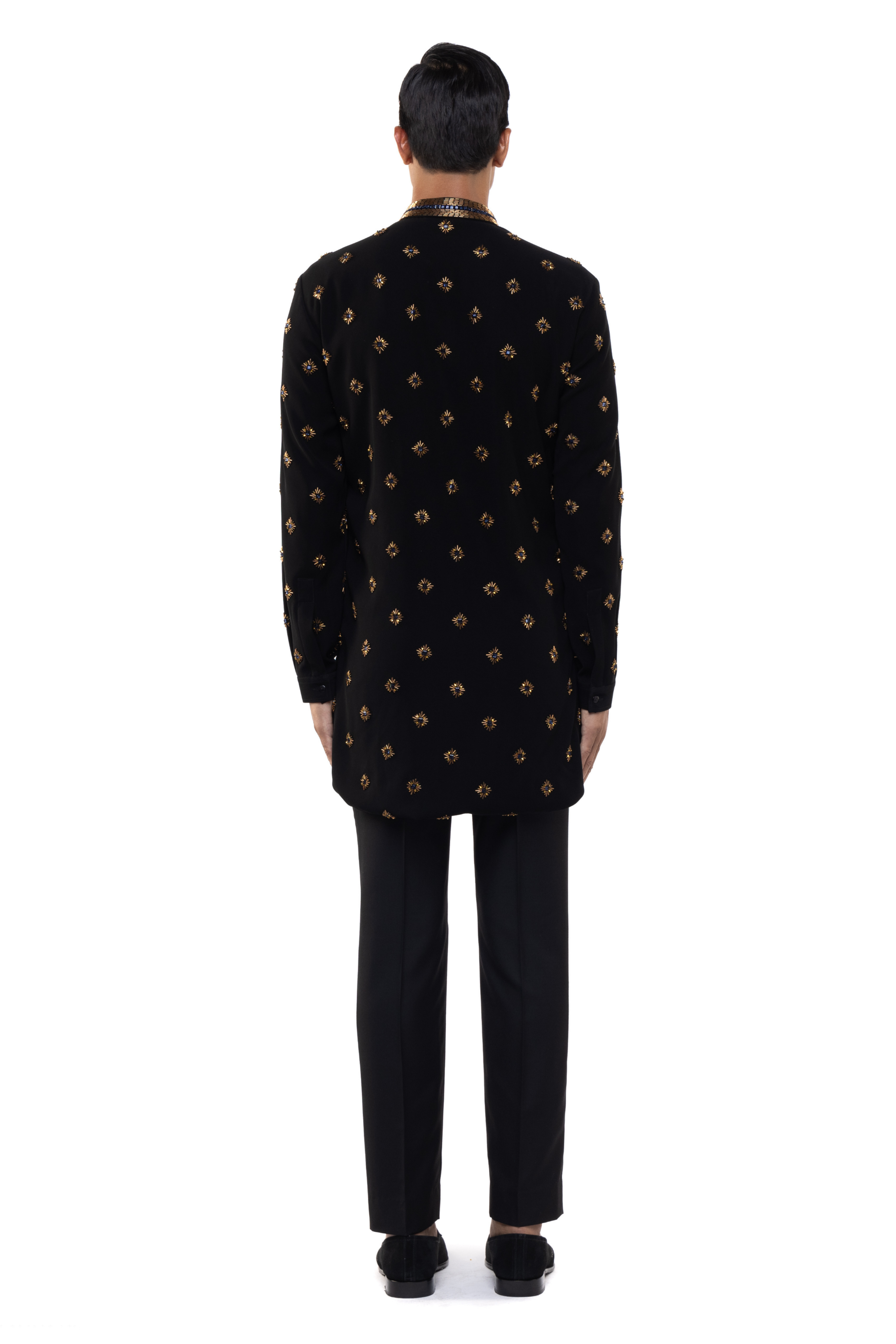 This black cotton kurta set features Egyptian-inspired motifs, making it perfect for sangeet, ethnic, or festive celebrations.