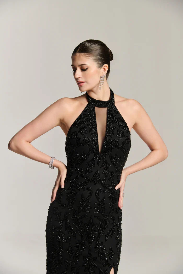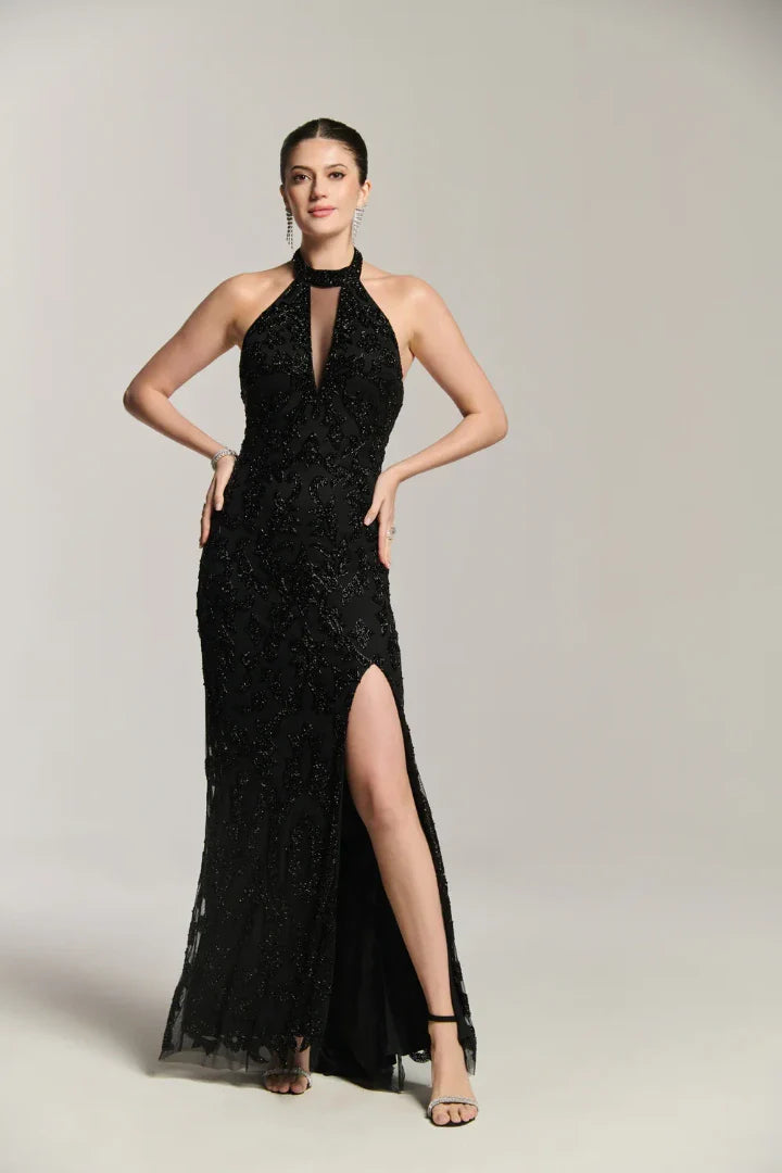 Stunning black beaded gown featuring a halter-style neckline and a dramatic slit on the left leg. Adorned with intricate, shimmering black beads arranged in a repeating floral pattern, this gown exudes elegance and sophistication with every step.