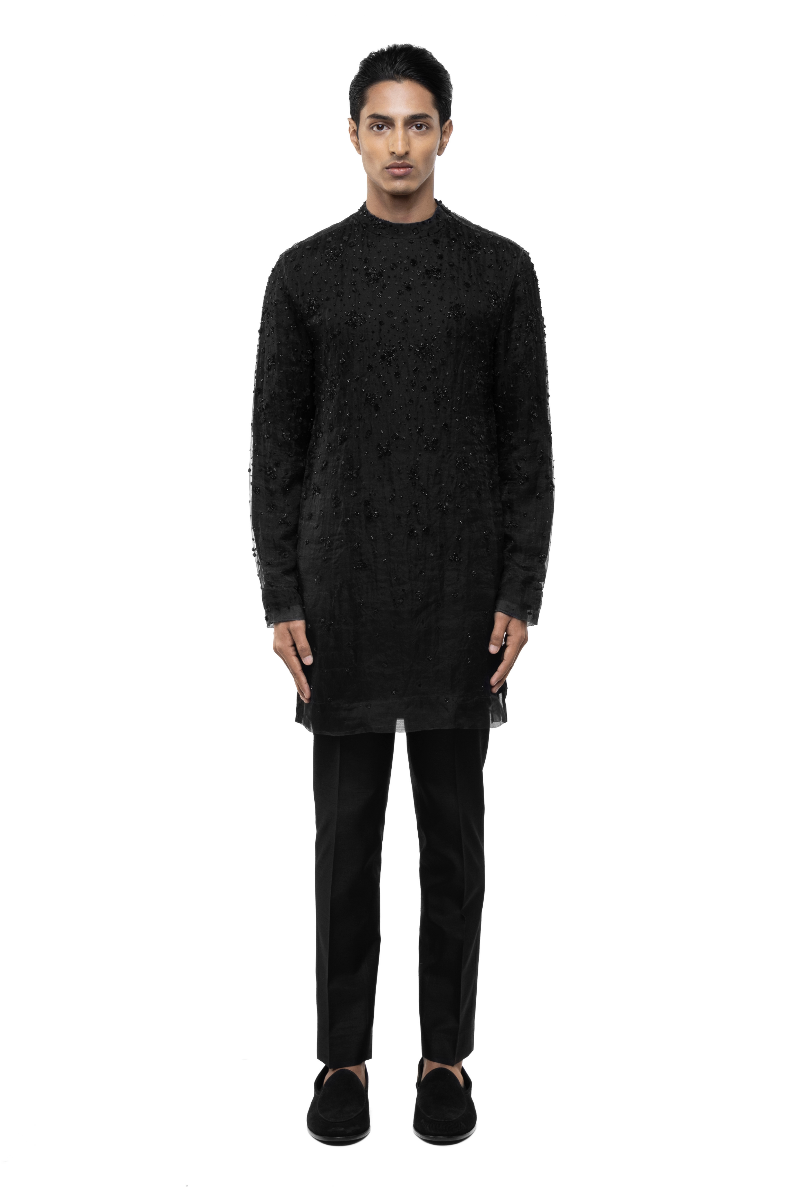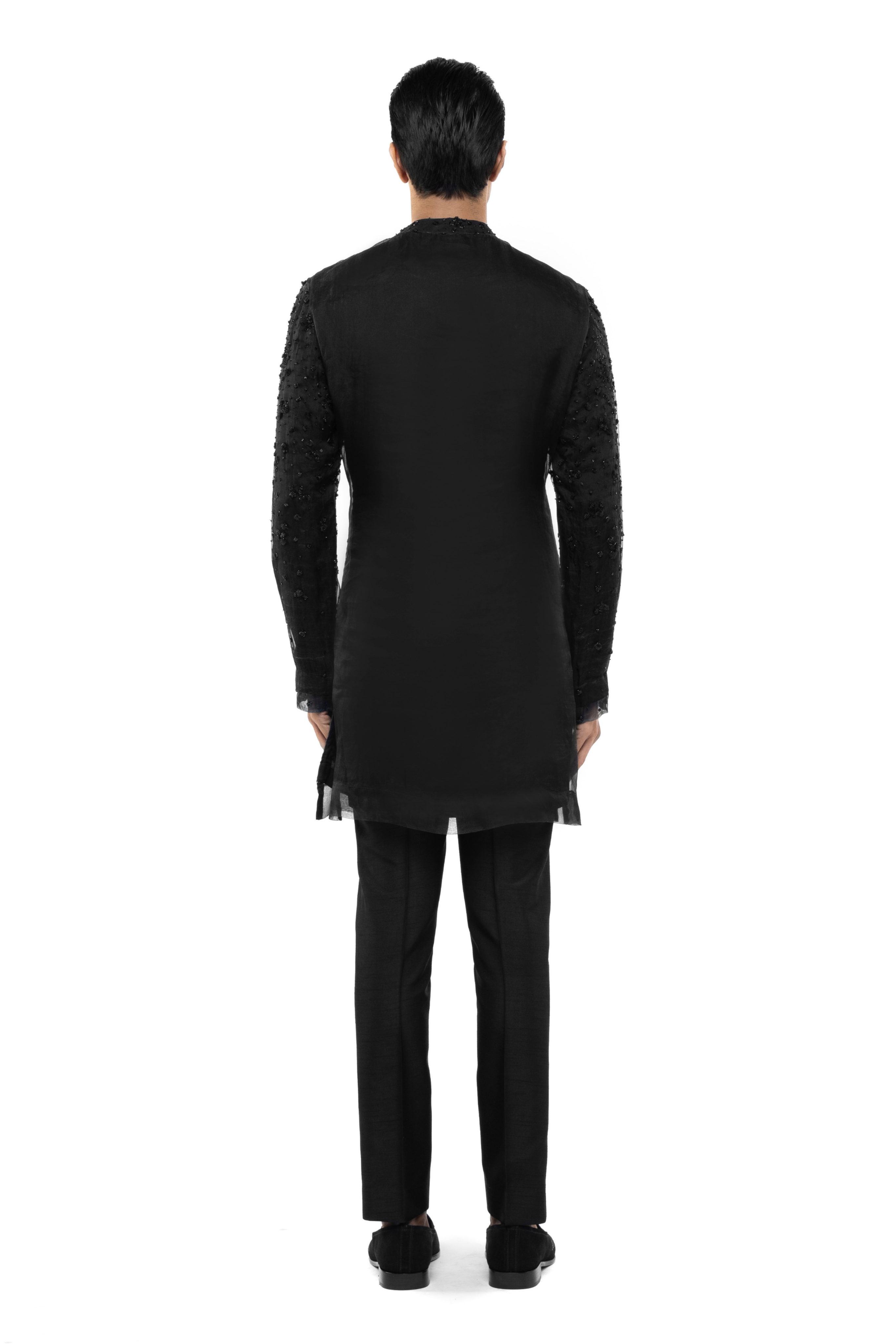 This black organza kurta set features applique embroidery, ideal for reception, sangeet, ethnic, or festive occasions.