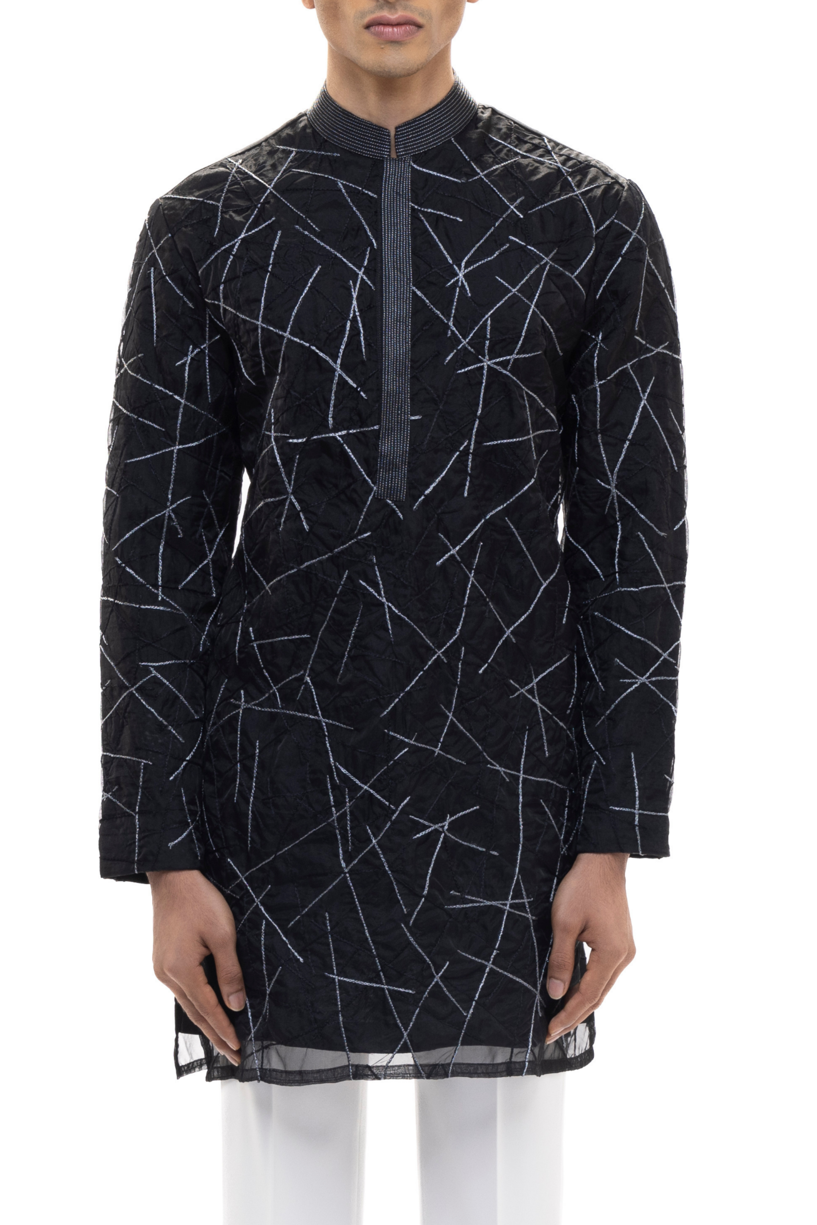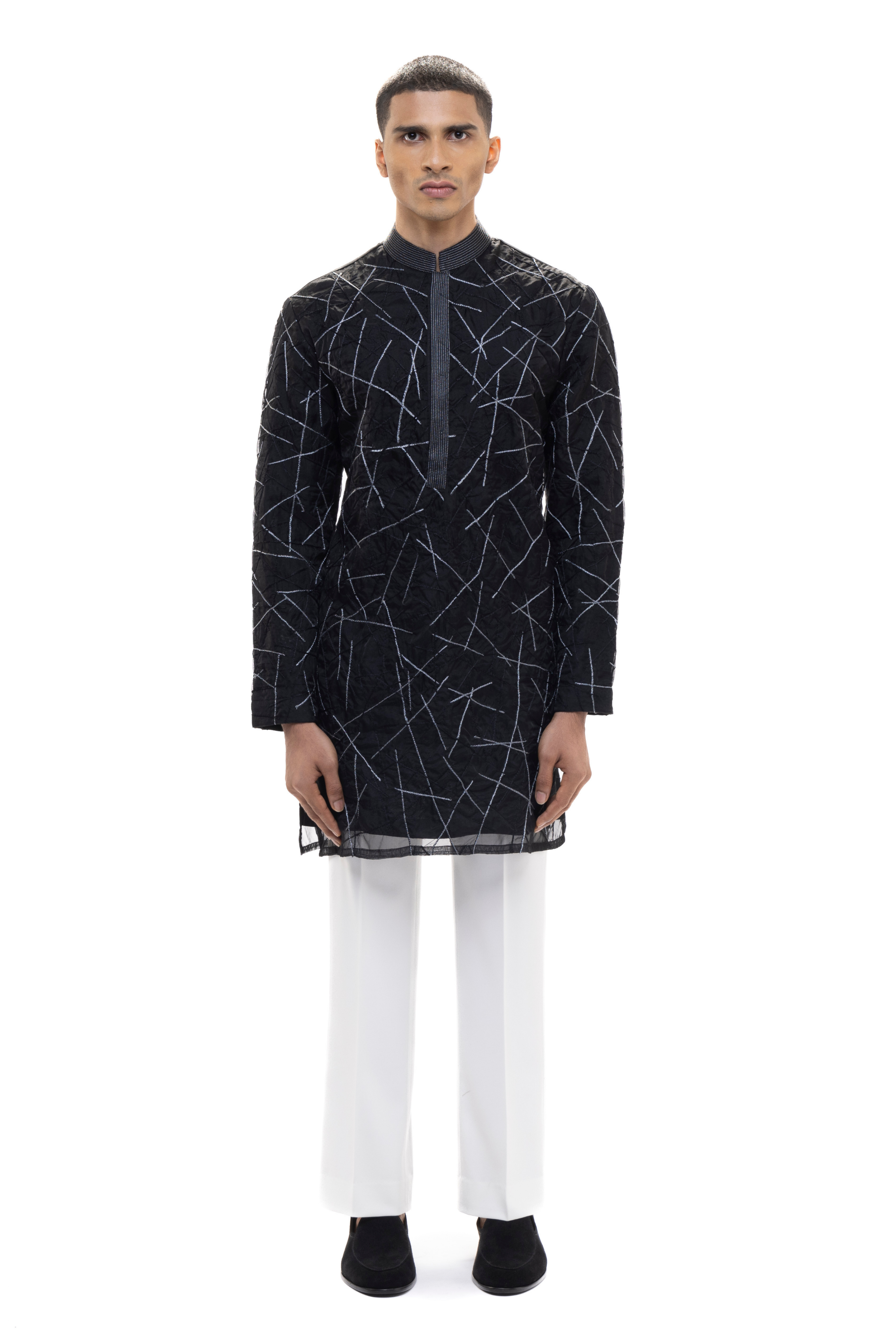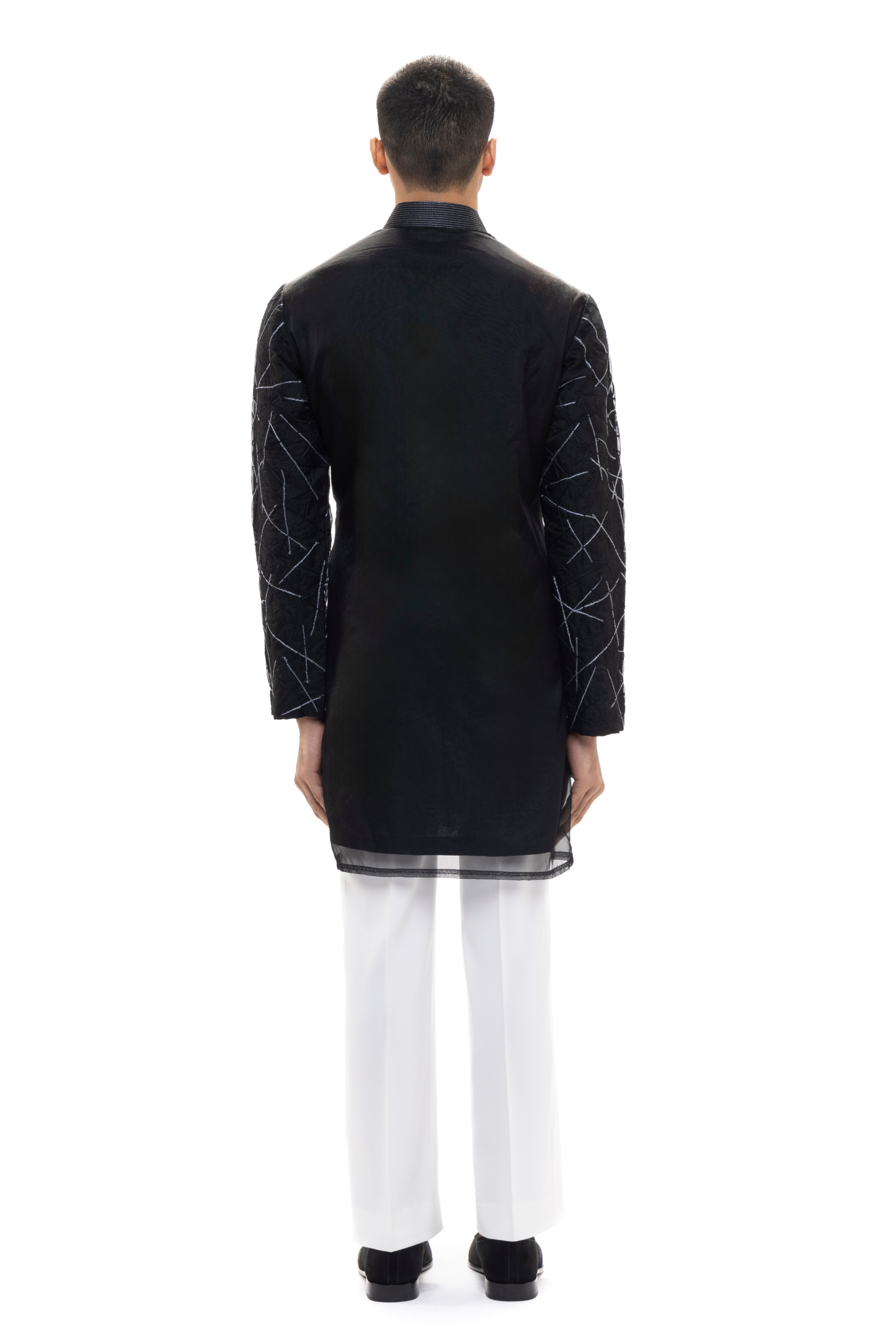 A luxurious black organza kurta set with metallic accents, perfect for sangeet, ethnic, or festive events.