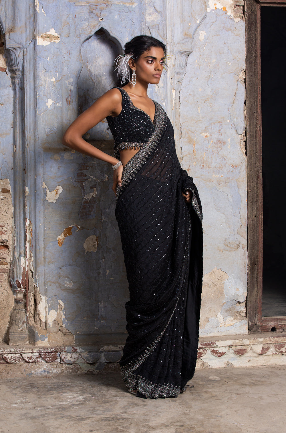 Black Organza Saree and blouse with metallic embroidery with tonal and silver sequins, beadwork, and crystals.