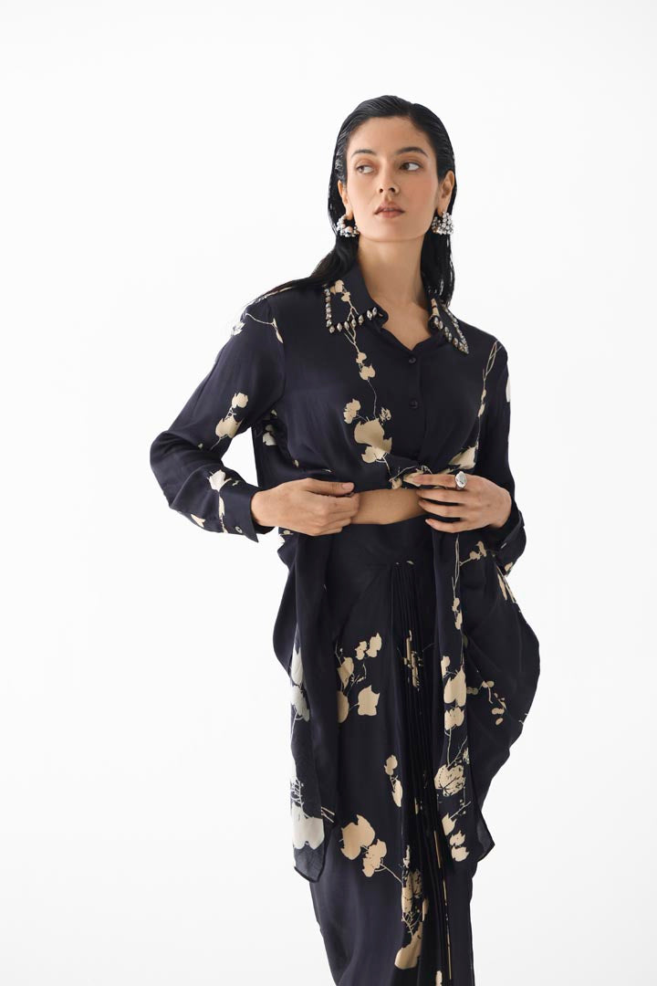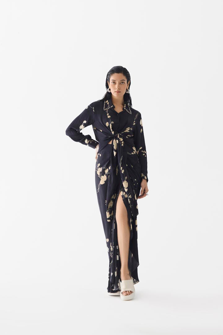 The Black Sakura Crop Top & Skirt crafted from our stunning vegan silk fabrication, trans-seasonal, is a statement piece. This set, printed in our black base sakura flower print, has a chic look. A 2 piece set, the crop top has a knot at the waist. It has hanging Swarovski detailing on the collar. It is paired with our matching black sakura draped skirt with a front slit and side zipper. Wear it with heels for an elegant look.