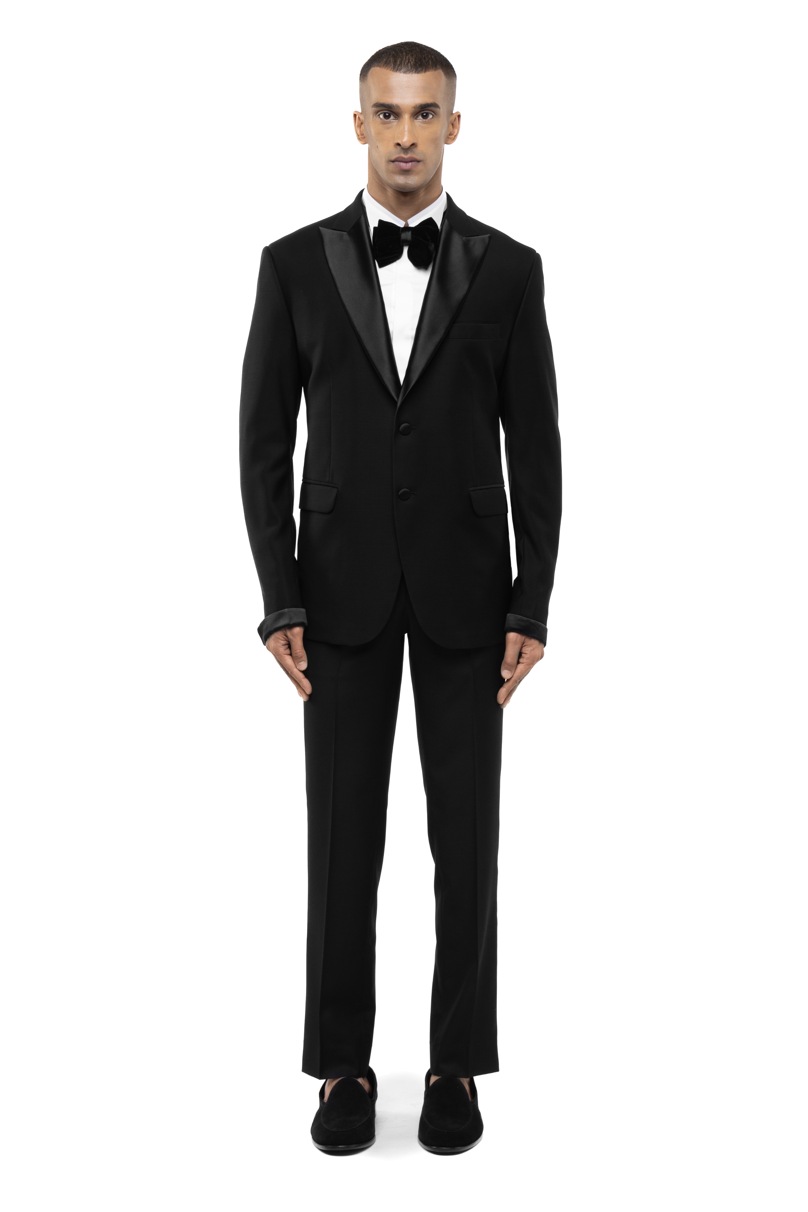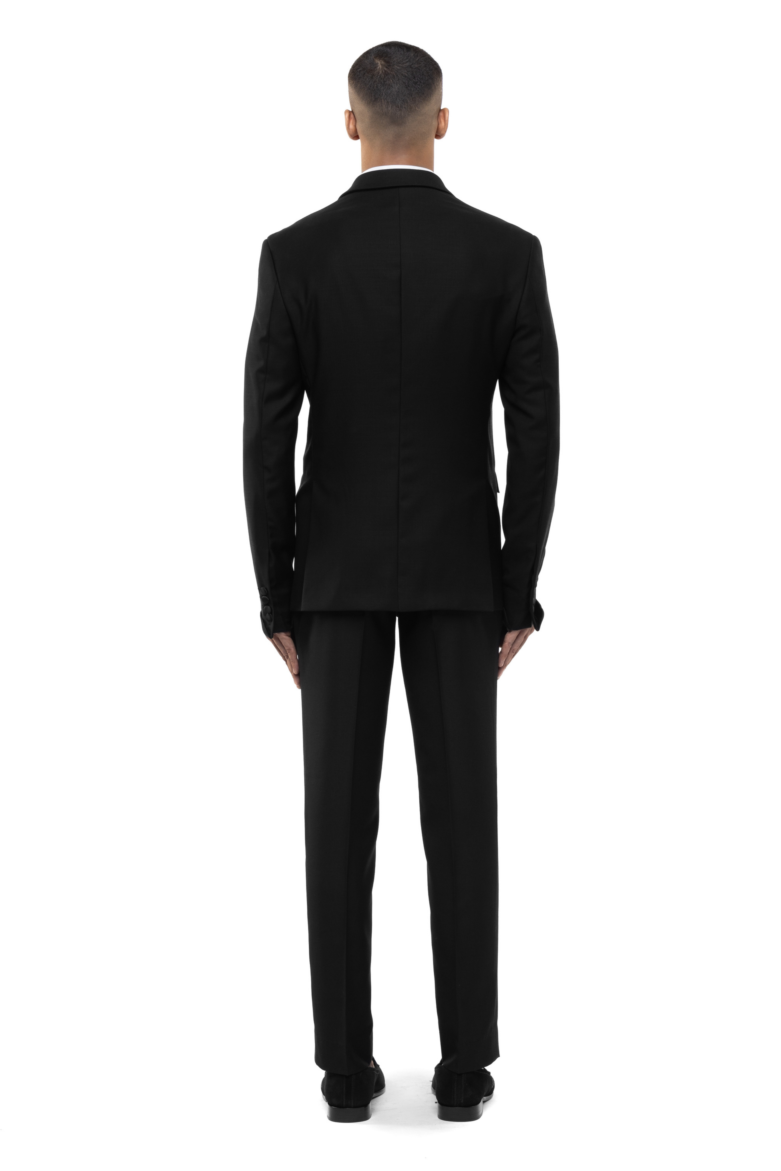 A classic peak lapel double-breasted tuxedo set in black worsted wool, perfect for reception, sangeet, ethnic, festive, or cocktail occasions.
