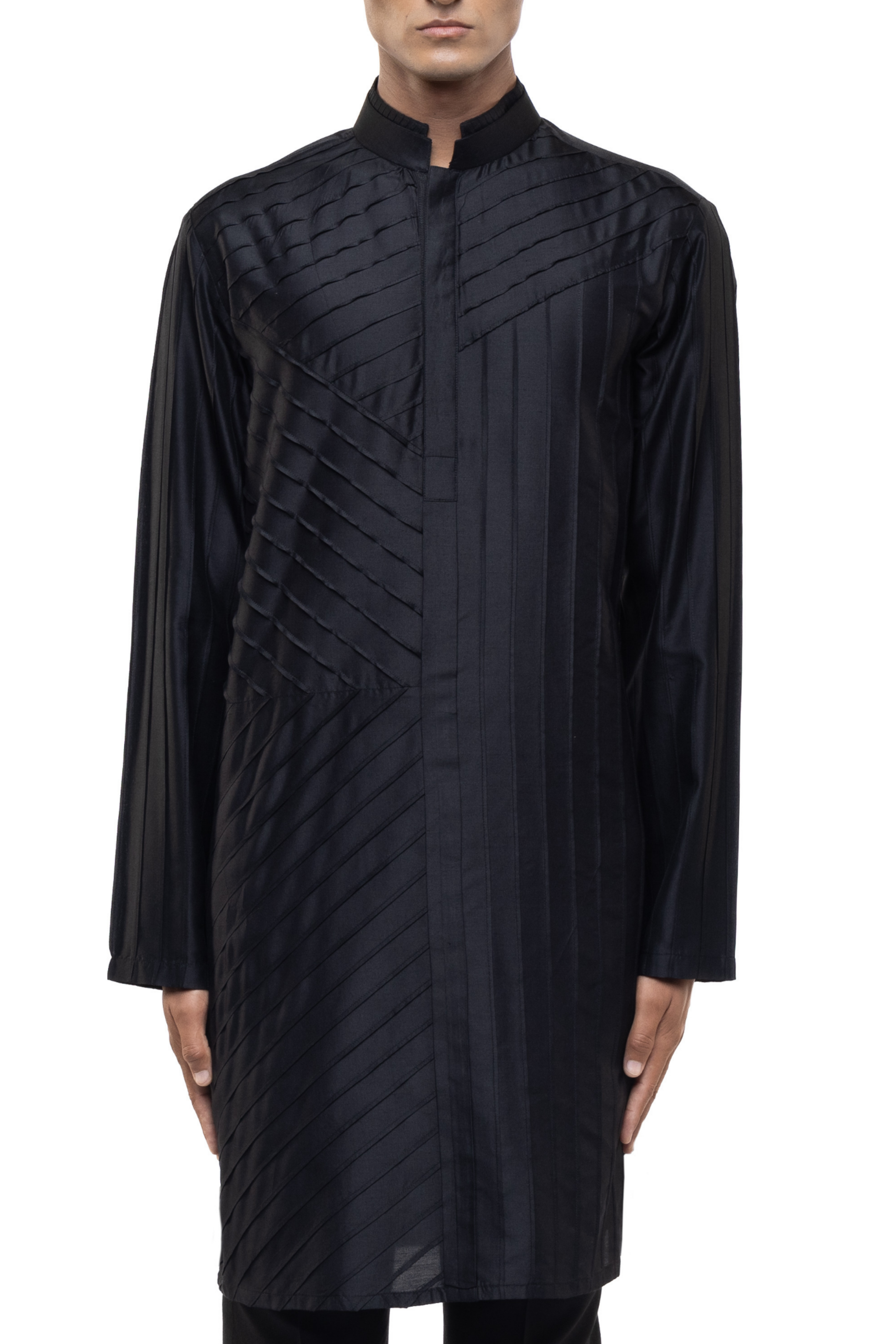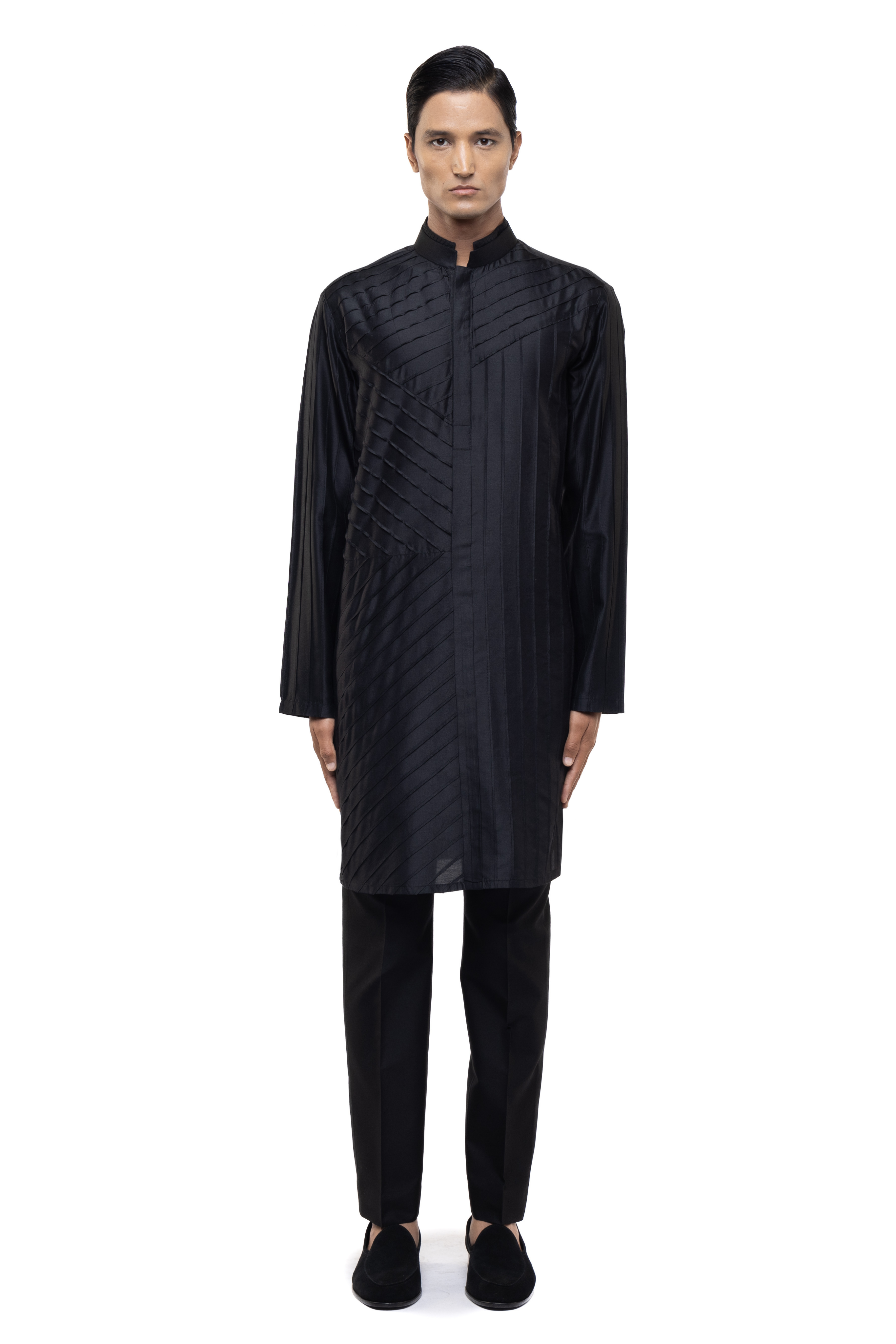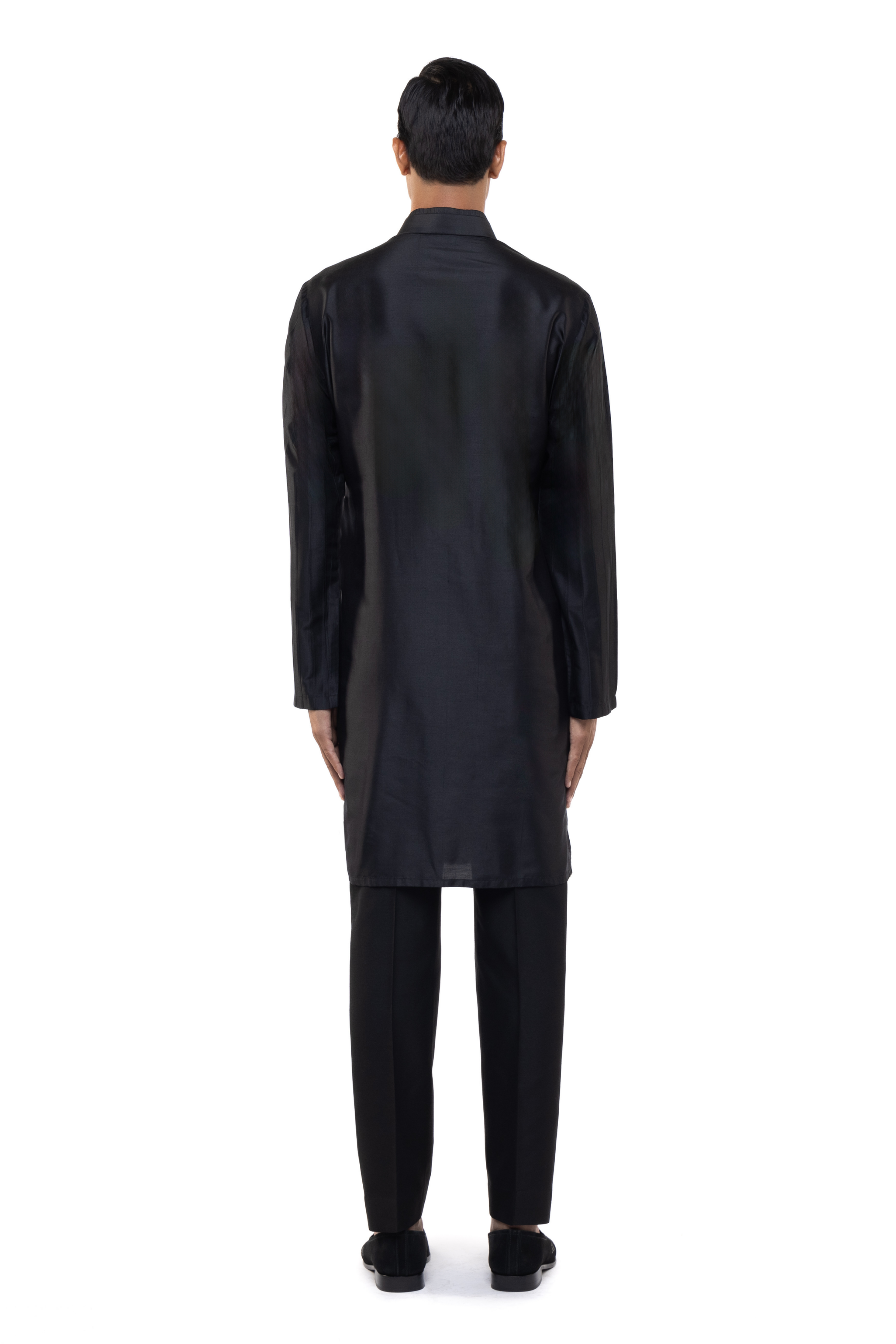 A sleek black silk embroidered placket kurta set, perfect for sangeet, ethnic, or festive occasions, combining tradition with a contemporary flair.
