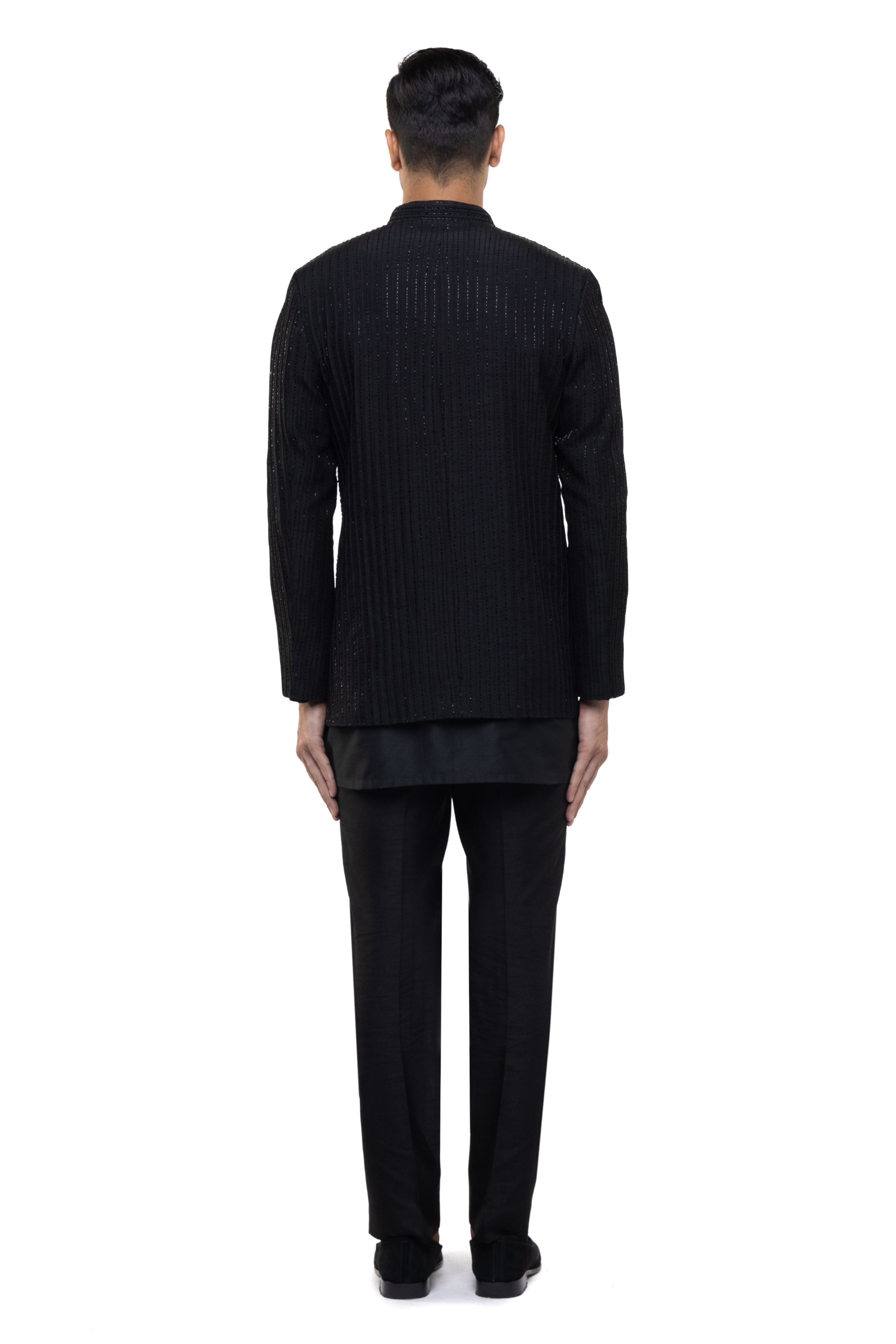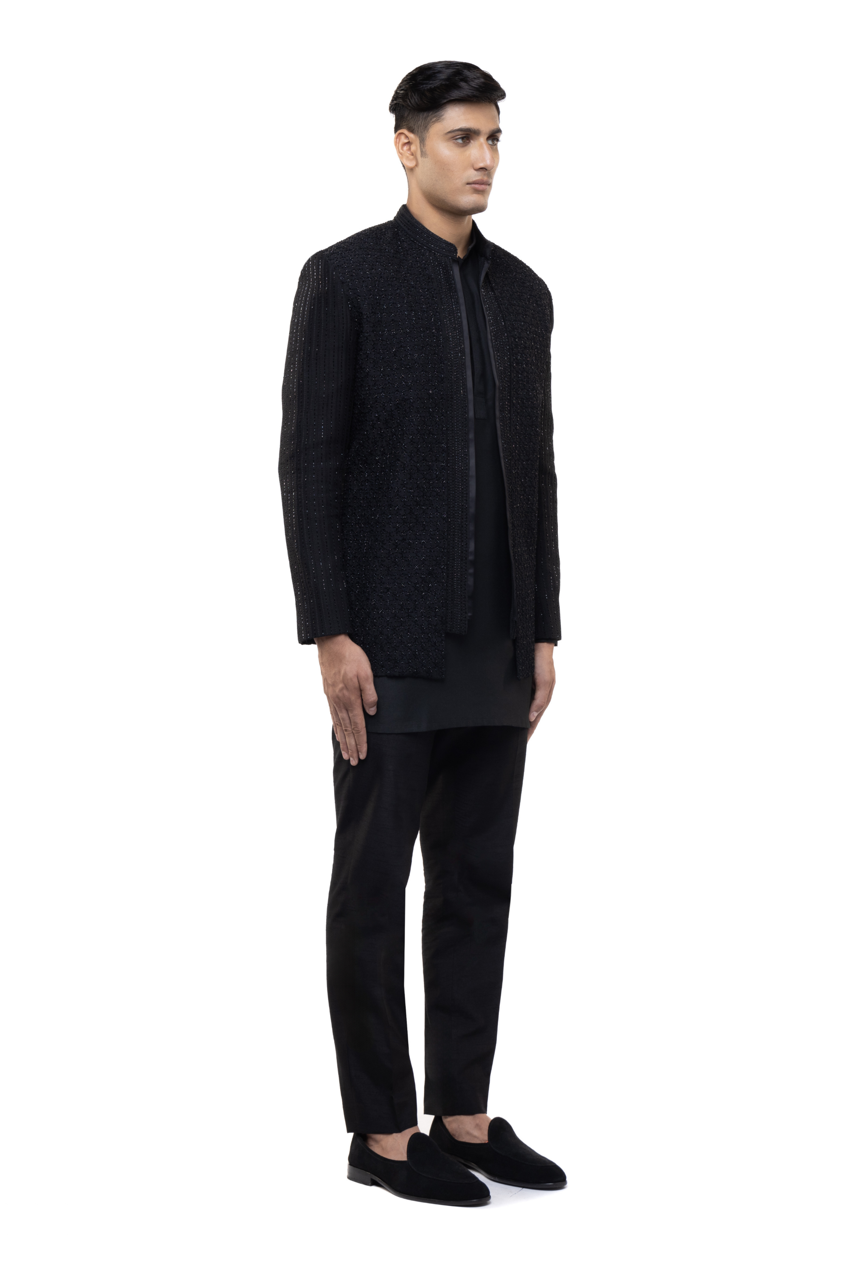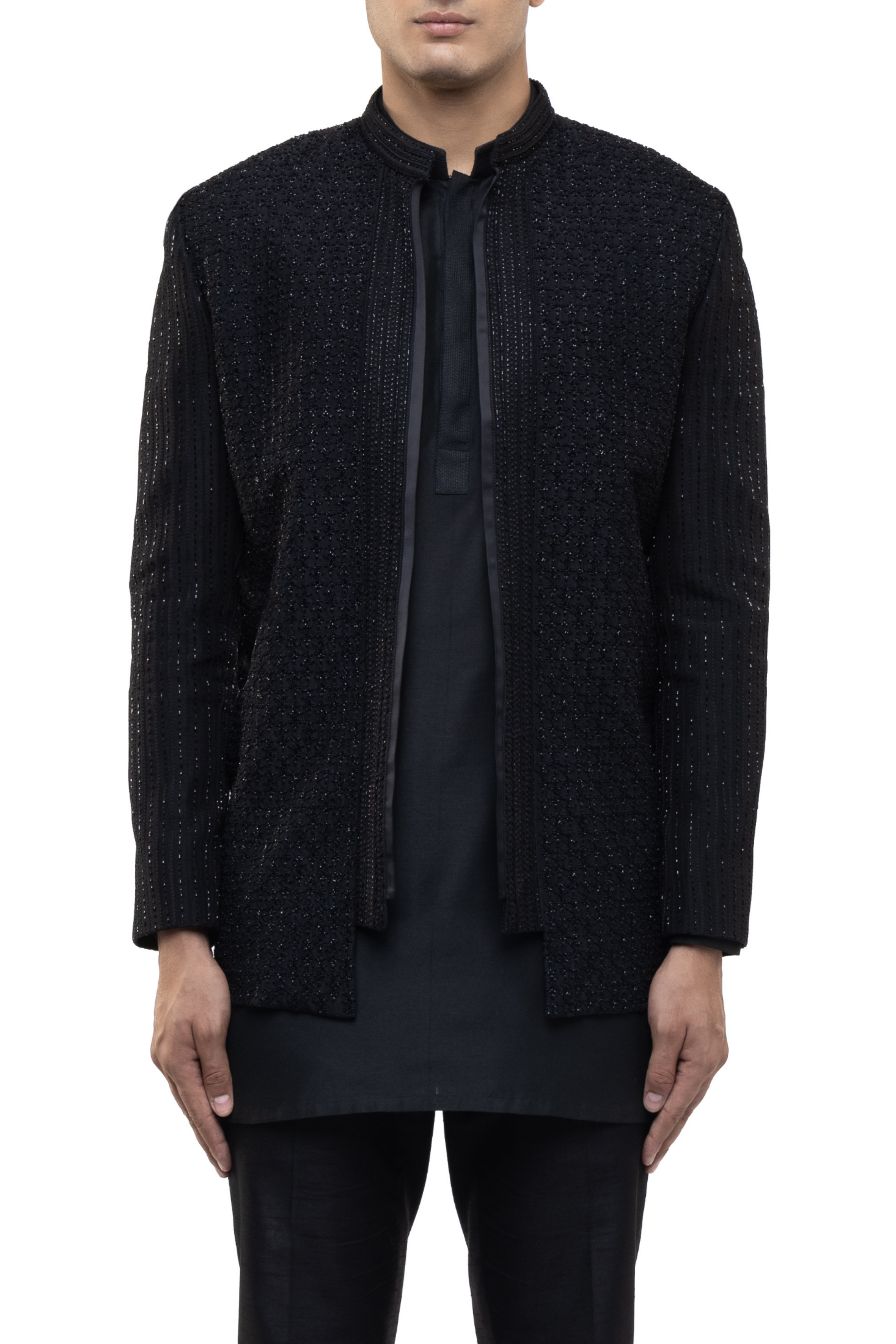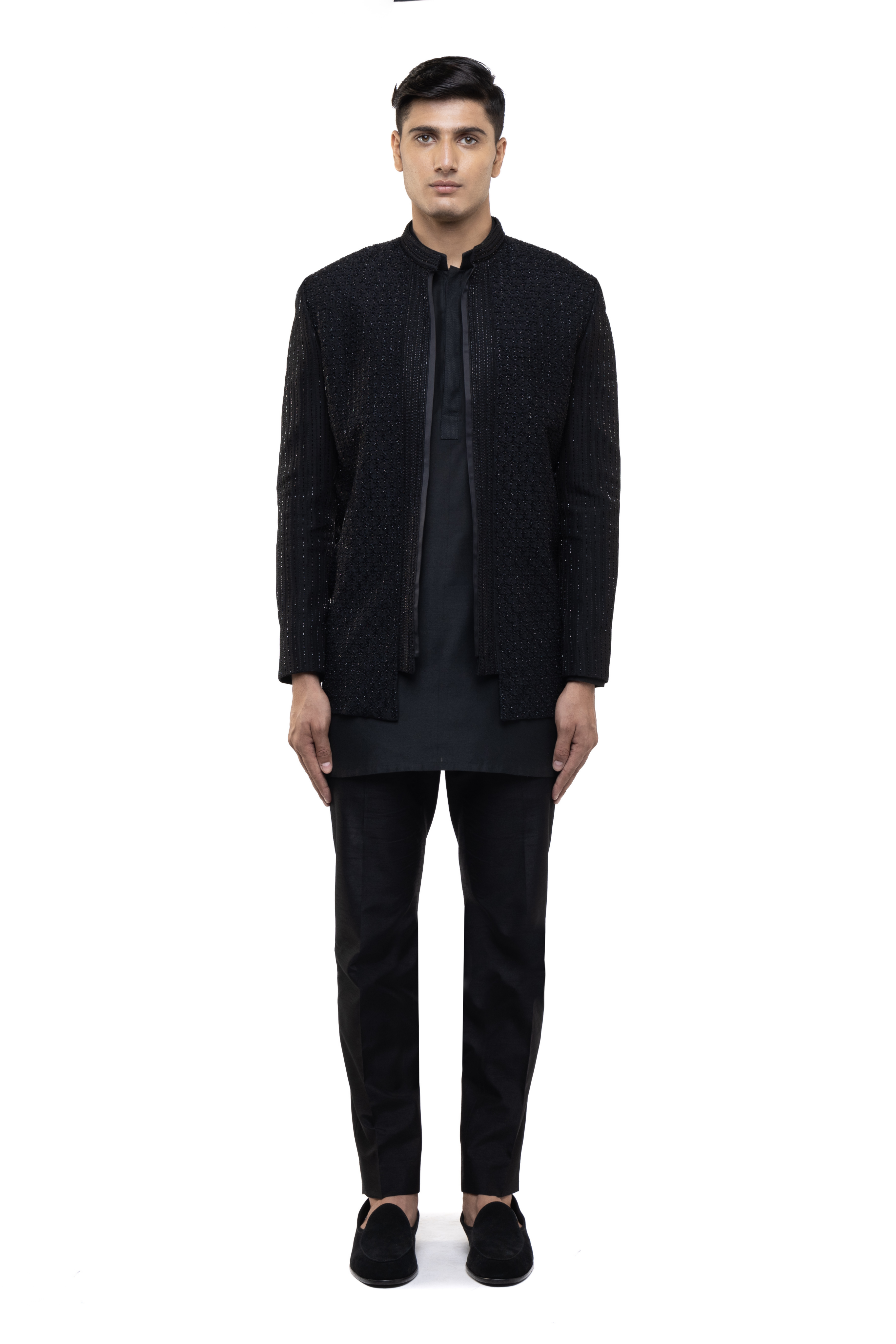 This floral-embroidered open bandhgala is a versatile choice for reception, sangeet, ethnic, or festive events. Pair with slim-fit trousers and textured footwear.