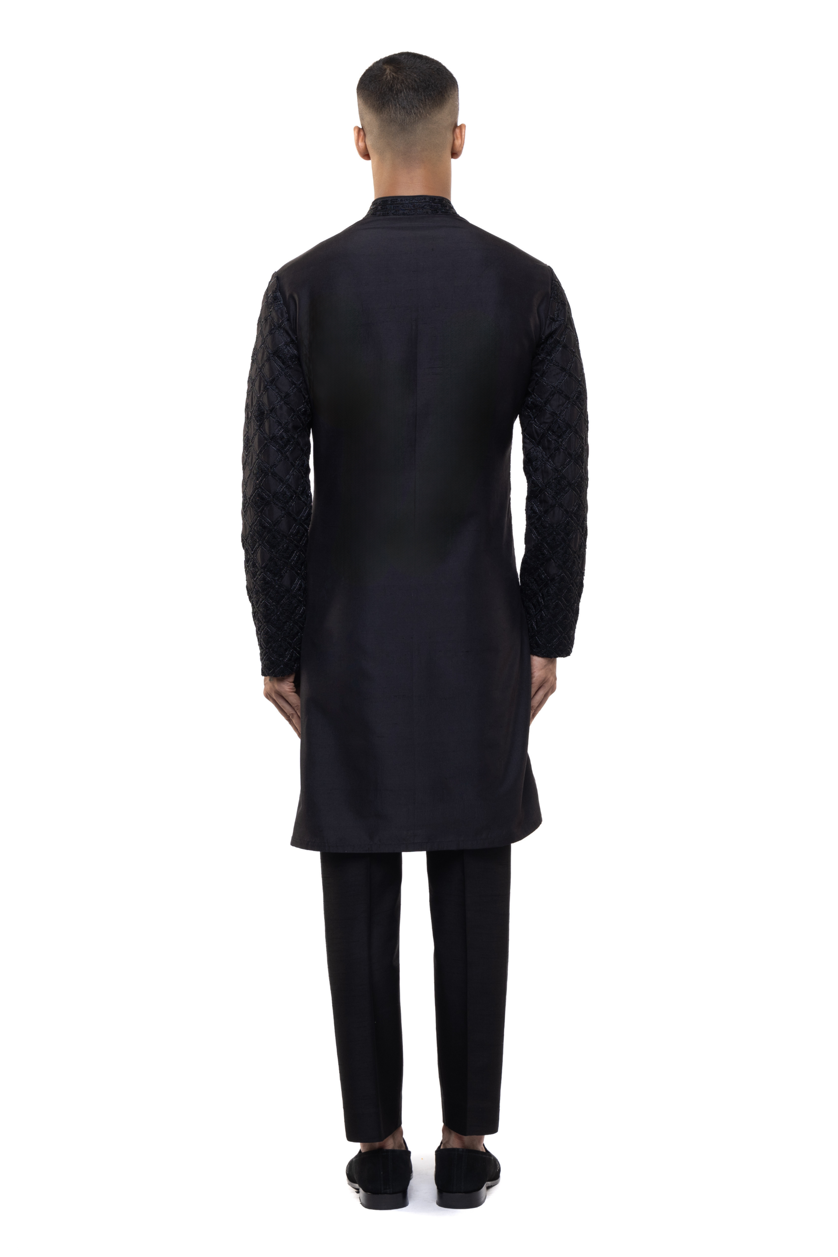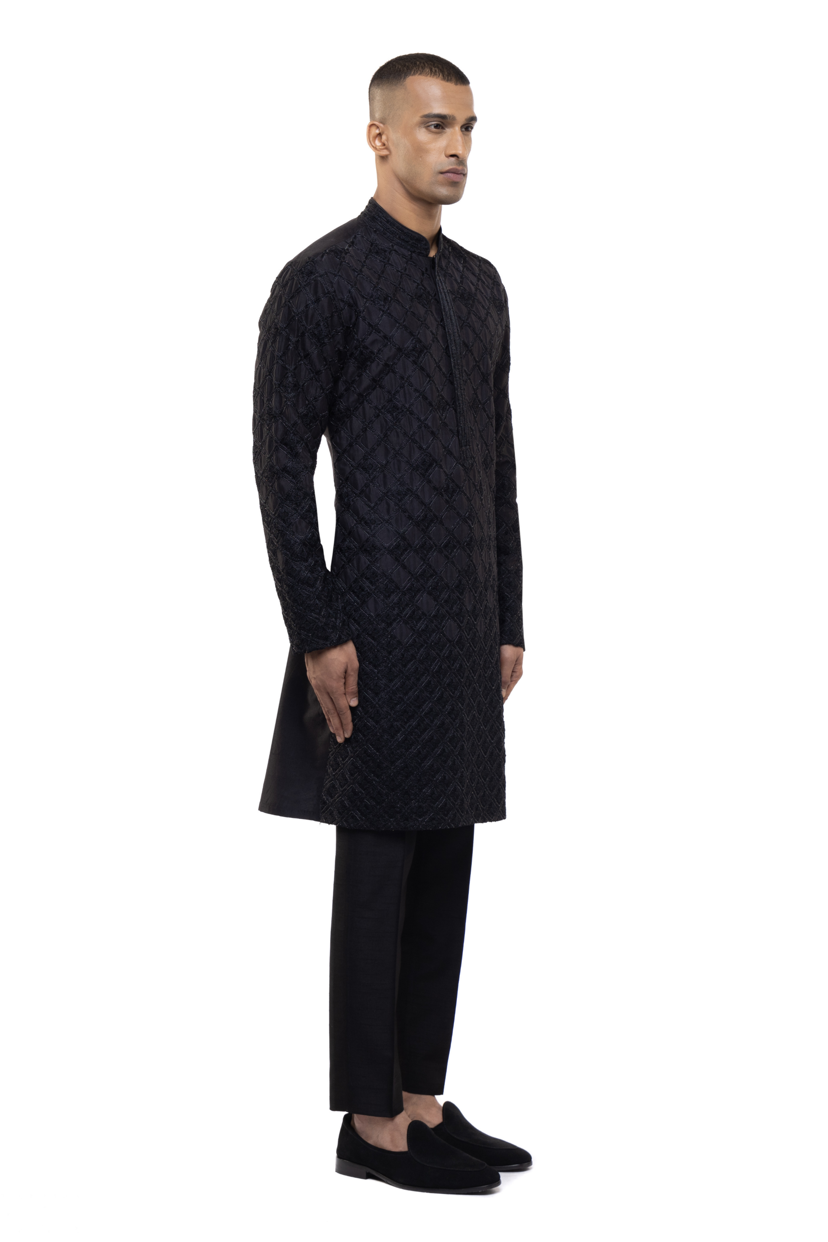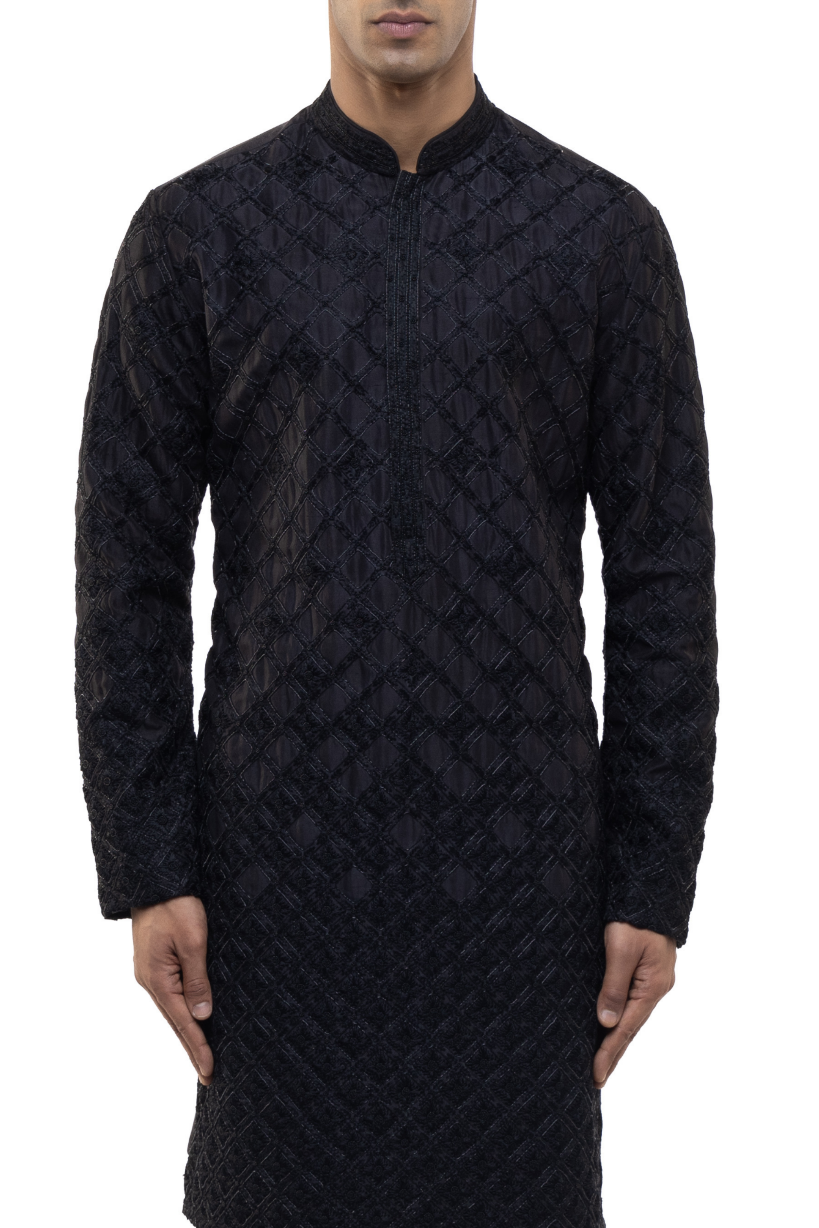 Showcasing intricate geometrical thread embroidery, this kurta is perfect for sangeet or festive occasions. Style it with mojris and a matching stole for a polished ethnic look.