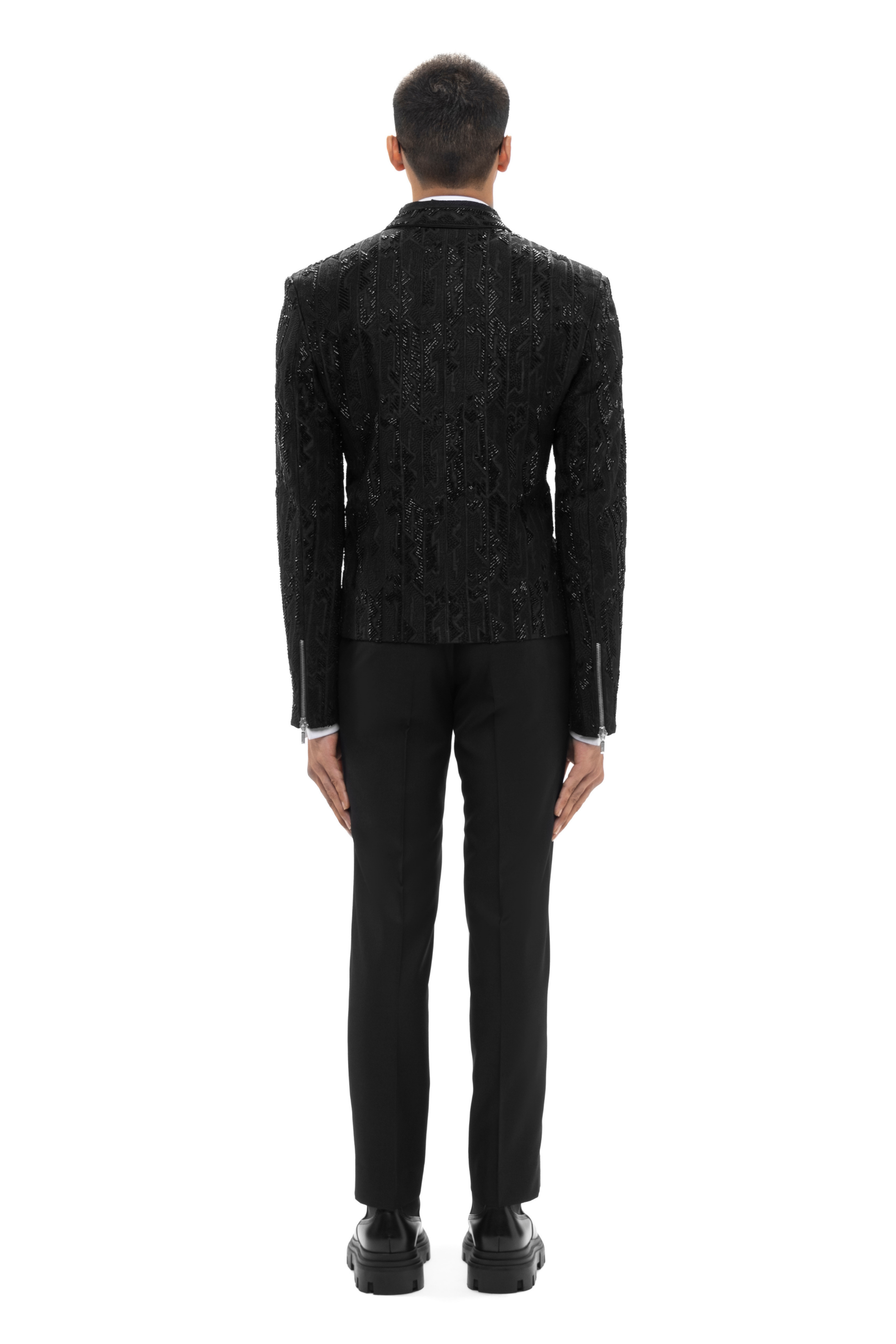 Black Silk Modern Embroidery Biker Jacket, Sleek design with modern embroidery, perfect for a party look.