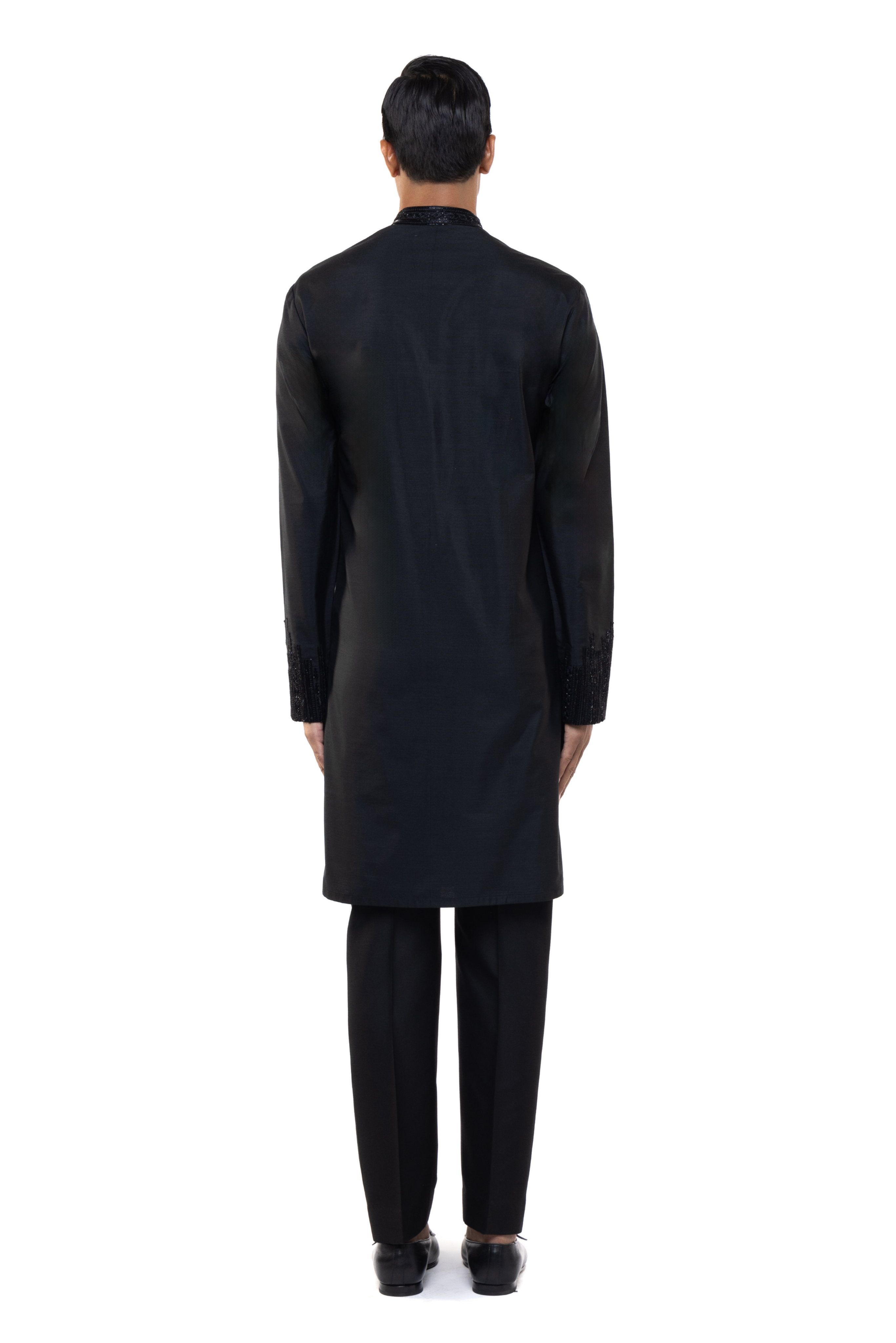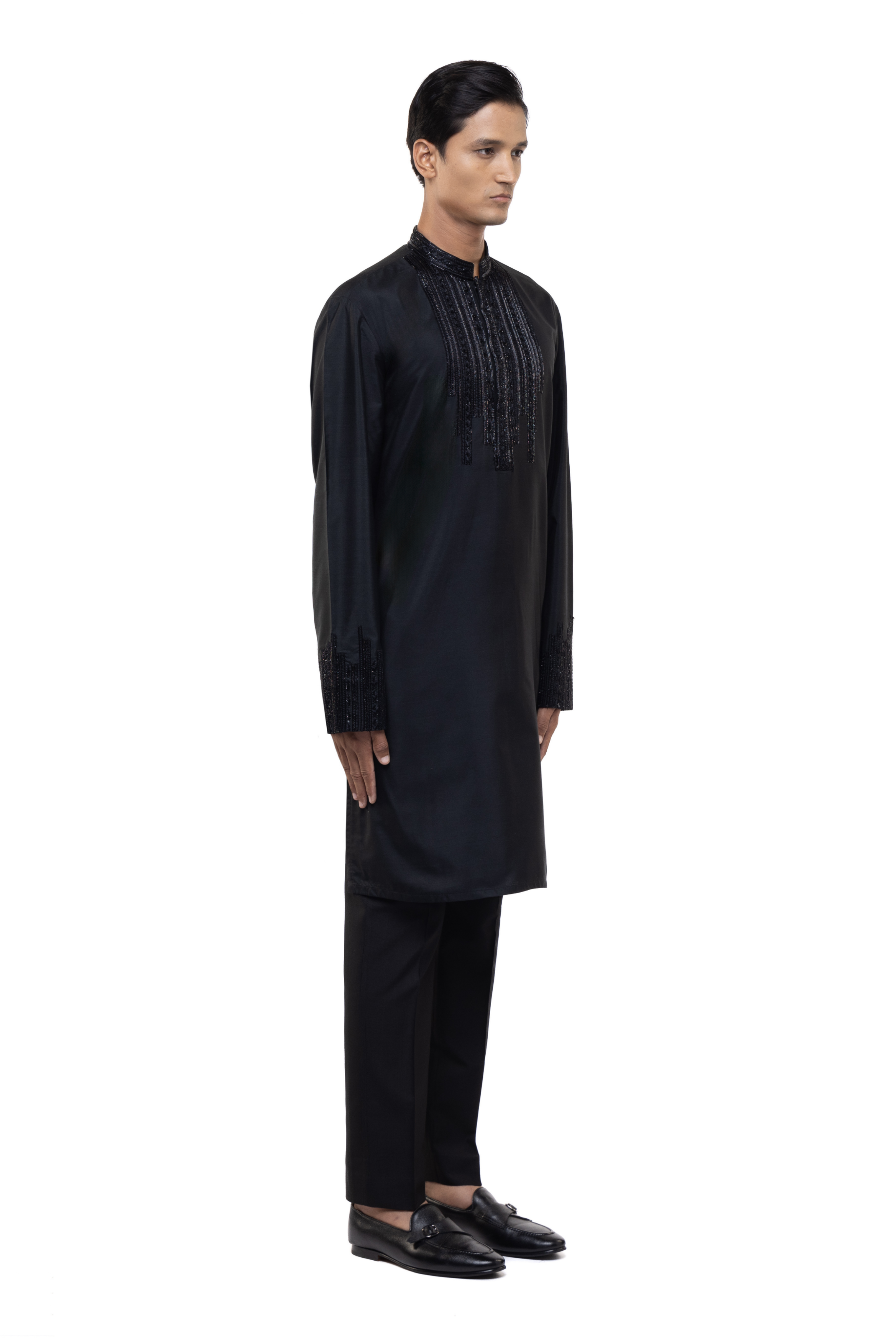 A black silk kurta set with pleated placket detailing, ideal for reception, sangeet, ethnic, or festive occasions.